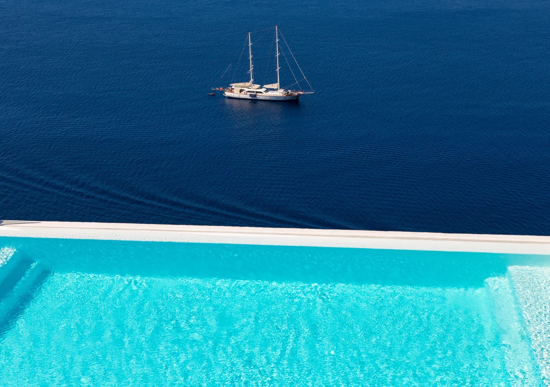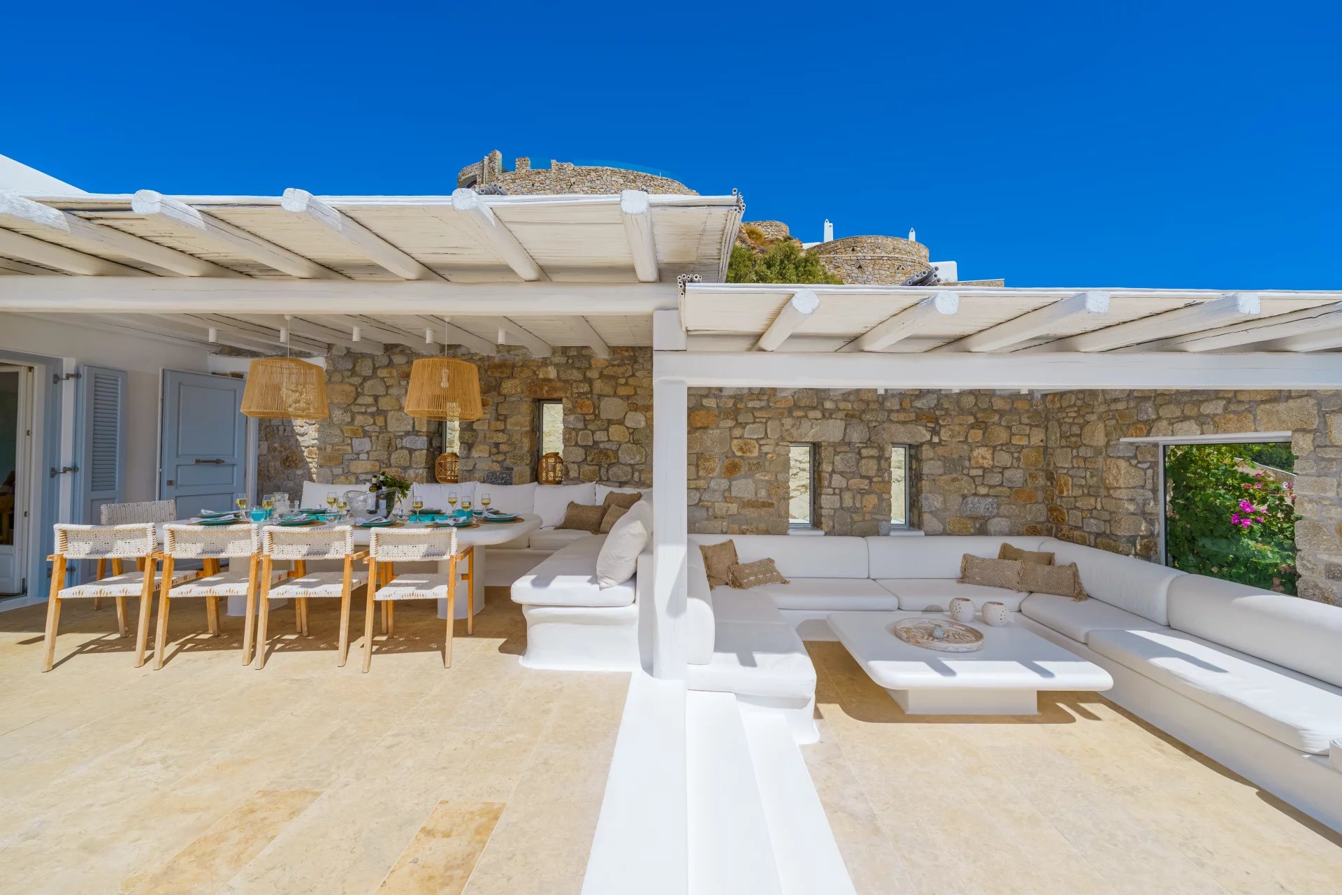 The outdoor areas fulfill every individual need in an oasis-like environment, from every aspect. The deck, almost floating above the waves and equipped with sun loungers, is perfect for leisure days soaking up the sun and the secluded pergola ideal for shaded peaceful afternoons. The upper level consists of another pergola-covered lounge together with an outdoor dining table. After a day of exploring Mykonos, probably you will gather around, enjoying iced cocktails, staring at the spectacular sunset colors. Later at night, you will relax to the sound of sea, tranquil although the sight of Ornos with the luminous yachts will definitely remind you that you are at one of the most cosmopolitan places in the world.