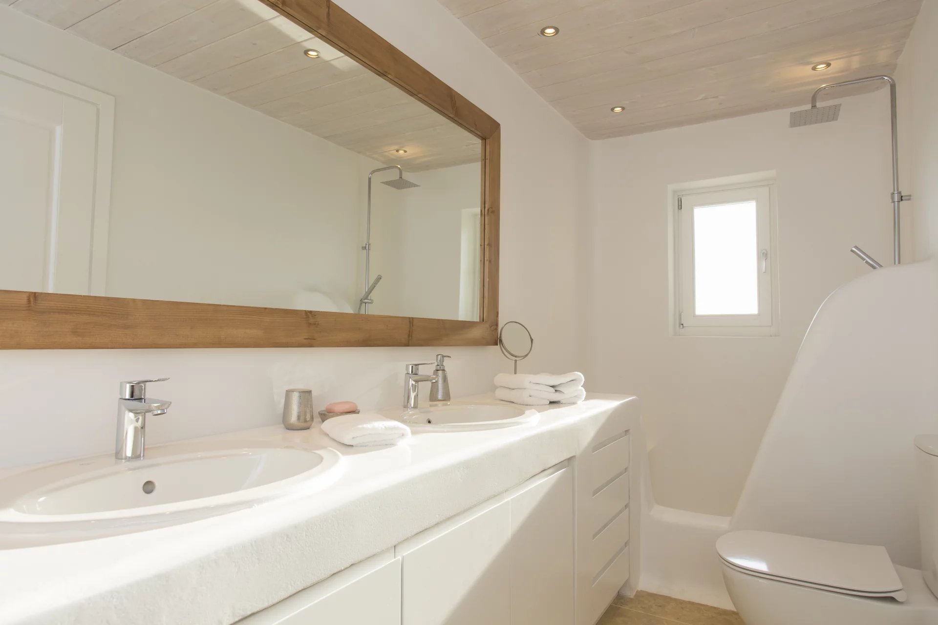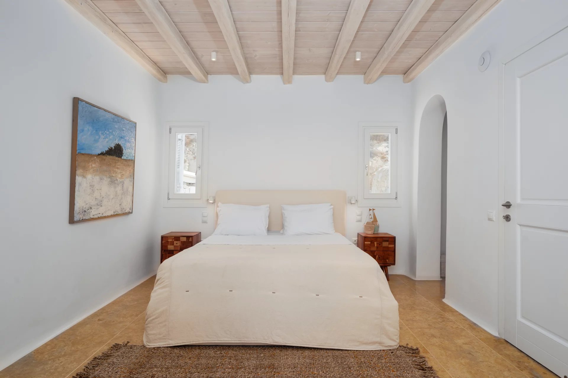 The elegant interiors, with meticulous attention to detail, blend harmoniously the Cycladic architecture with minimal aesthetics and modern art. All white-washed and generously sized with large picture windows, traditional wooden beams on the ceilings and sandy marbles on the floors, compose an impressive scenery. Even more the authentic paintings and sculptures determine the inviting atmosphere of the villa: Both calm and luxurious for you who are longing for a unique vacation home! The open plan living room around the fireplace, with white sofas and hand-made carpets is the first to start the inspiring composition. The nearby dining room and the fully equipped kitchen will undoubtedly attract you to spend time also indoors. As for the six bedrooms, all with en-suite bathrooms, they are suitable for sleeping in comfort and style, looking directly at the sea even when you are lying in bed. Decorated and furnished in earth light tones, each one differs from the others, tailored to meet the highest expectations.