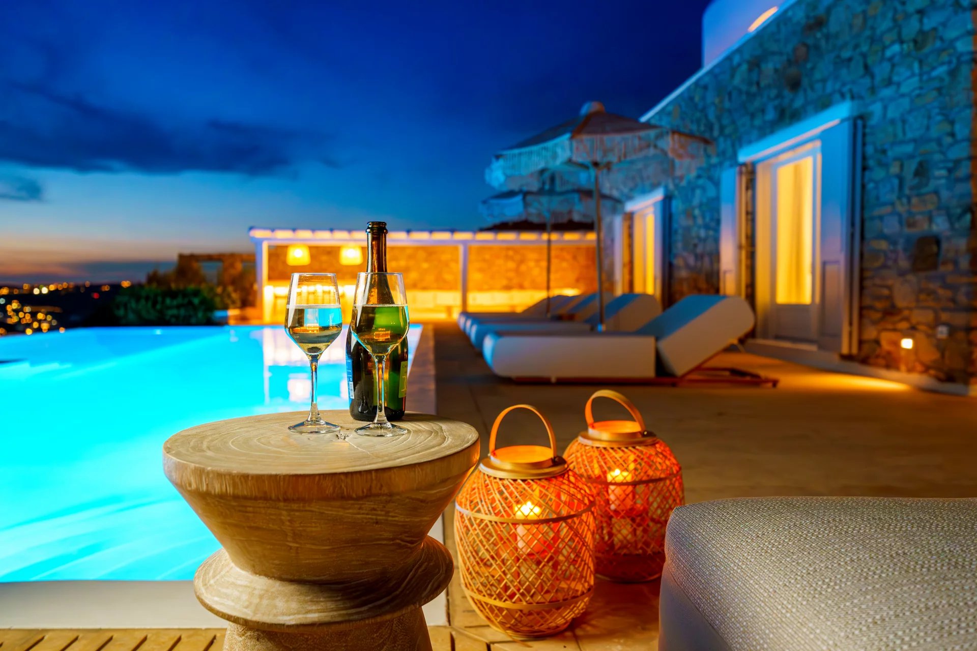 Villa Lavinia enjoys one of the most magnificent views in Mykonos, over the gulf of Ornos, towards numerous islands, starting from Delos and Rhenia till the endless blue of the Aegean sea.