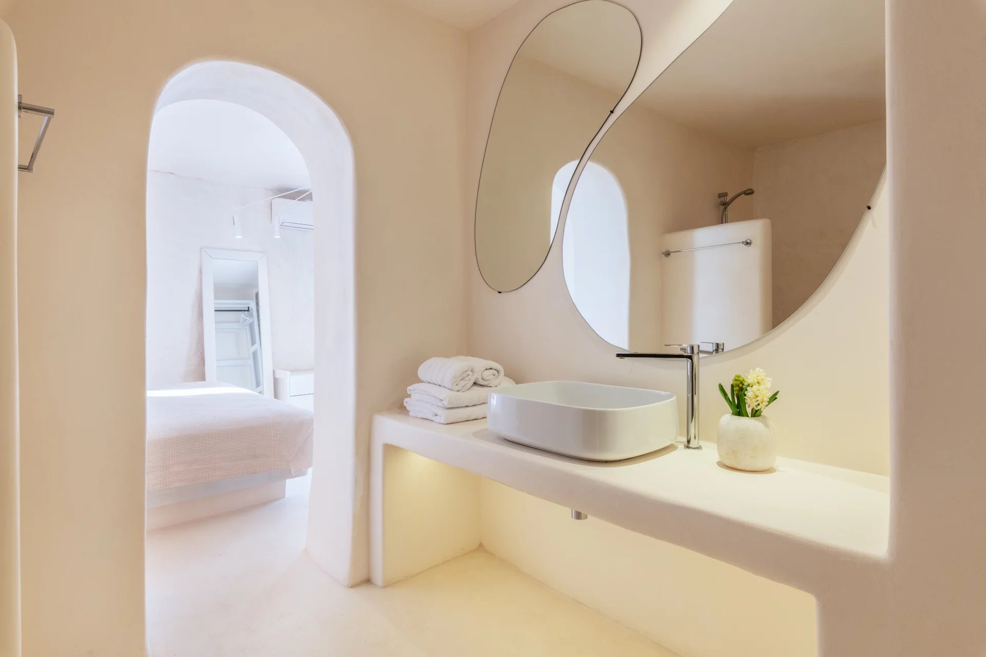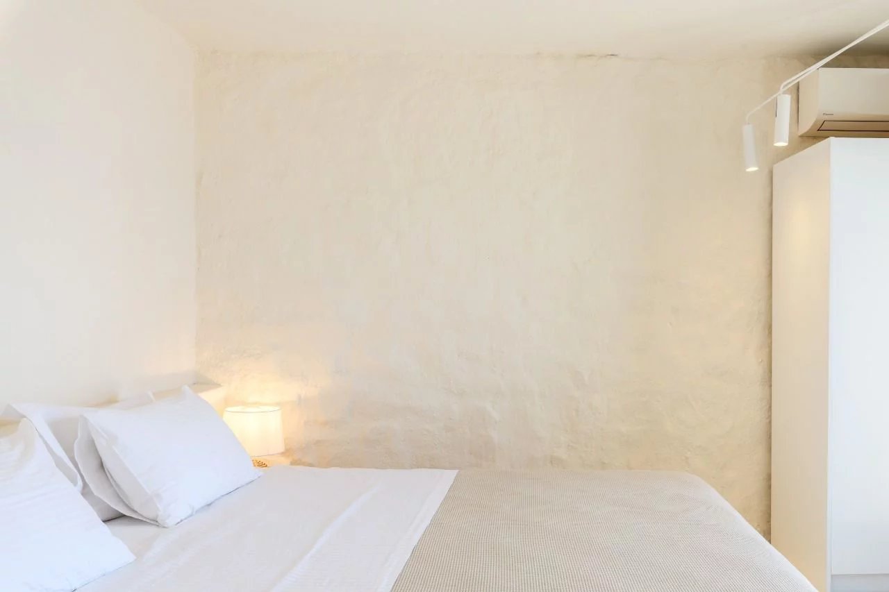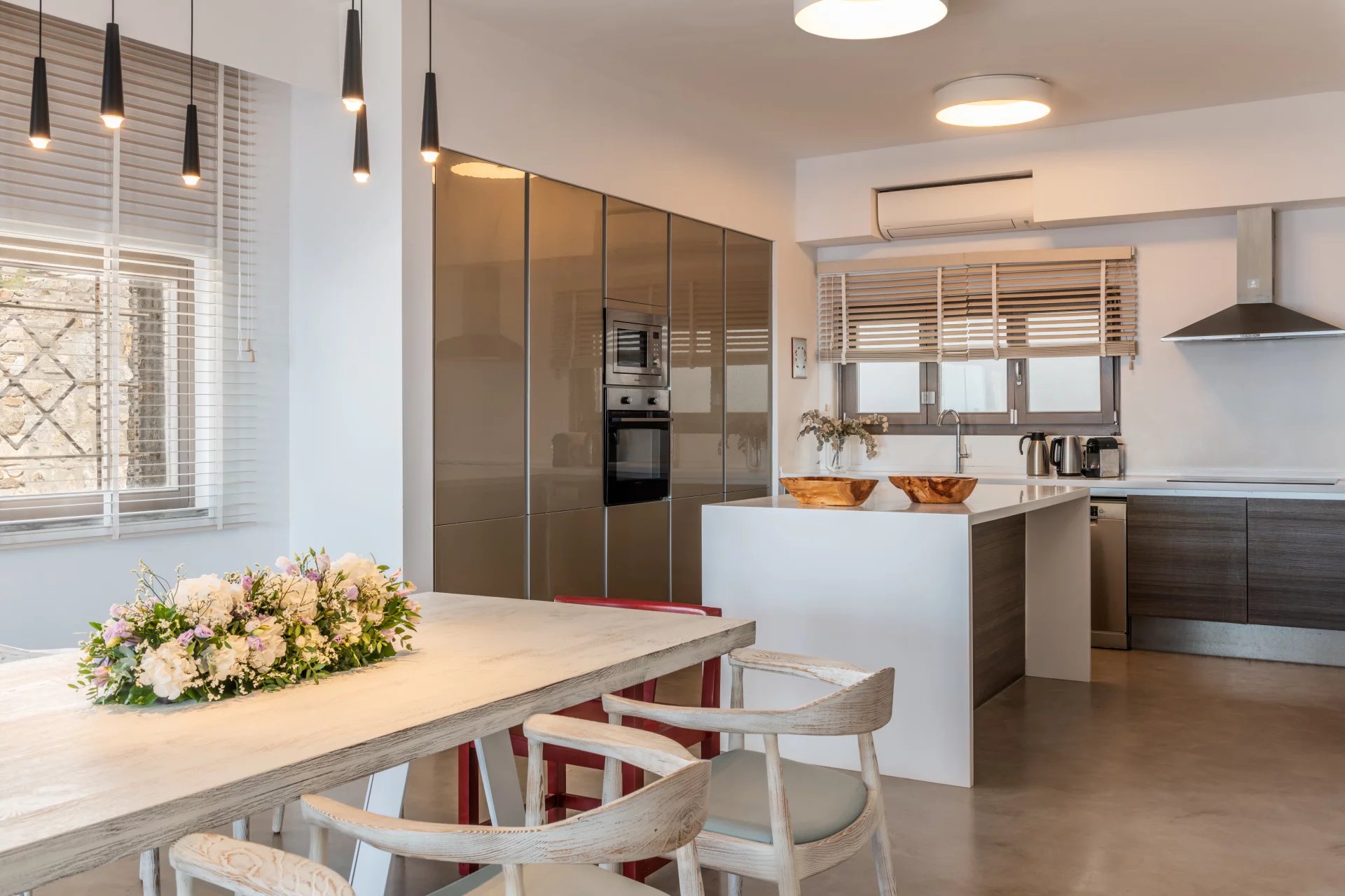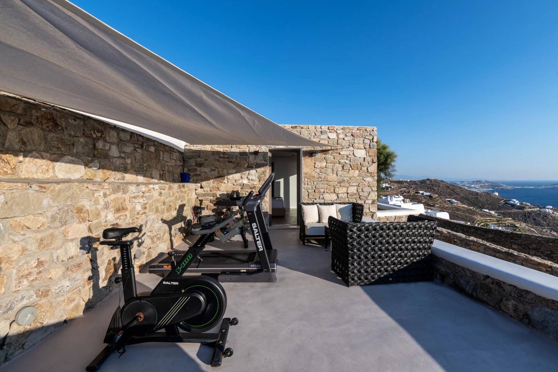 The outdoor areas are designed to enchant guests, featuring a stunning private infinity pool as the centerpiece, along with an alfresco jacuzzi for serene moments with loved ones. A highlight of the space is the pool bar, perfect for serving drinks during unforgettable Mykonian nights. The outdoor area also offers two shaded dining spaces, two shaded lounge areas, and gym equipment for your enjoyment.