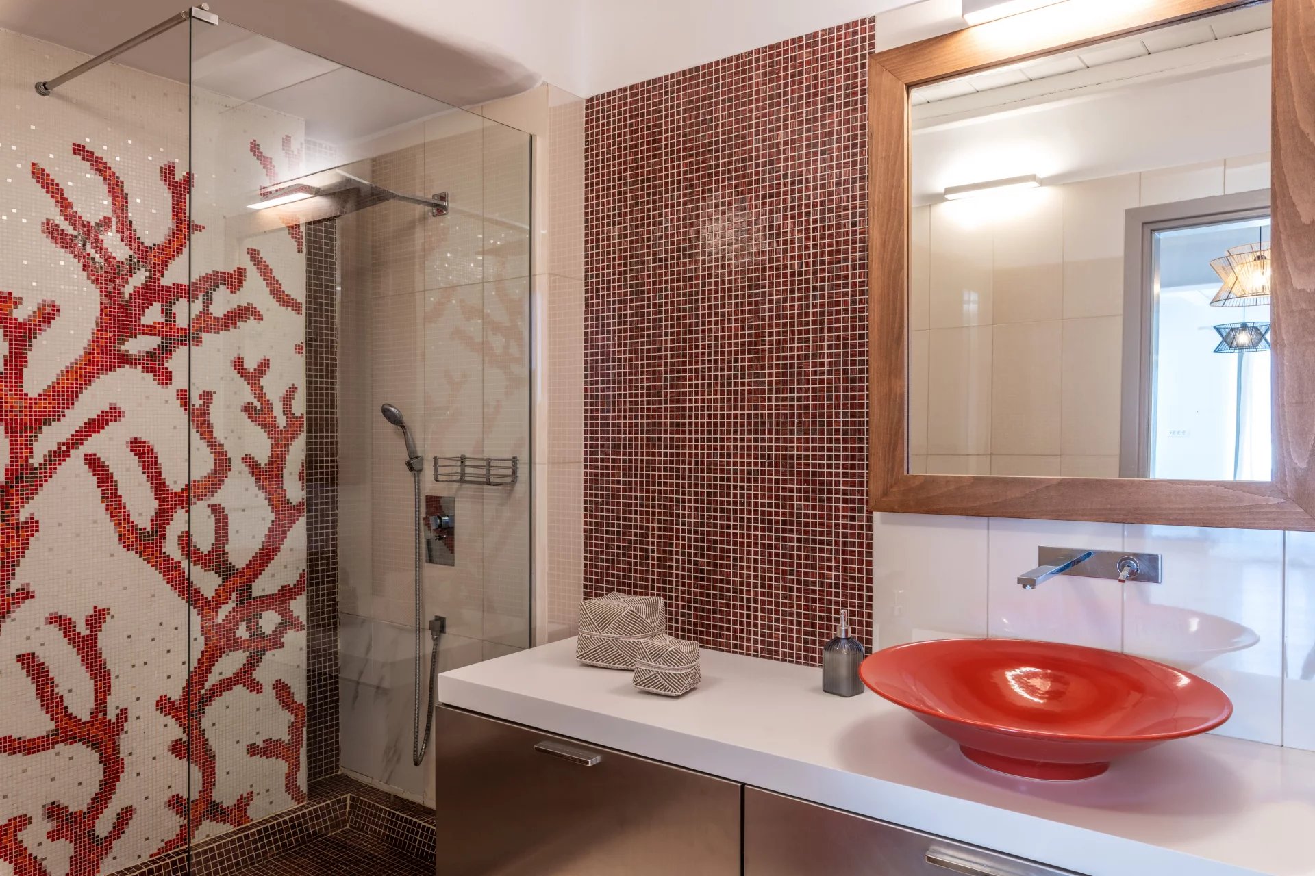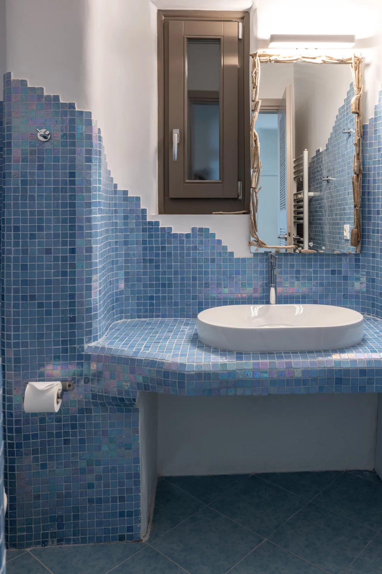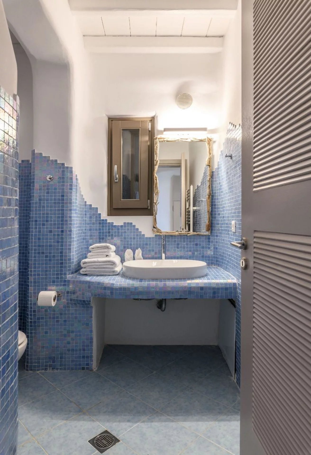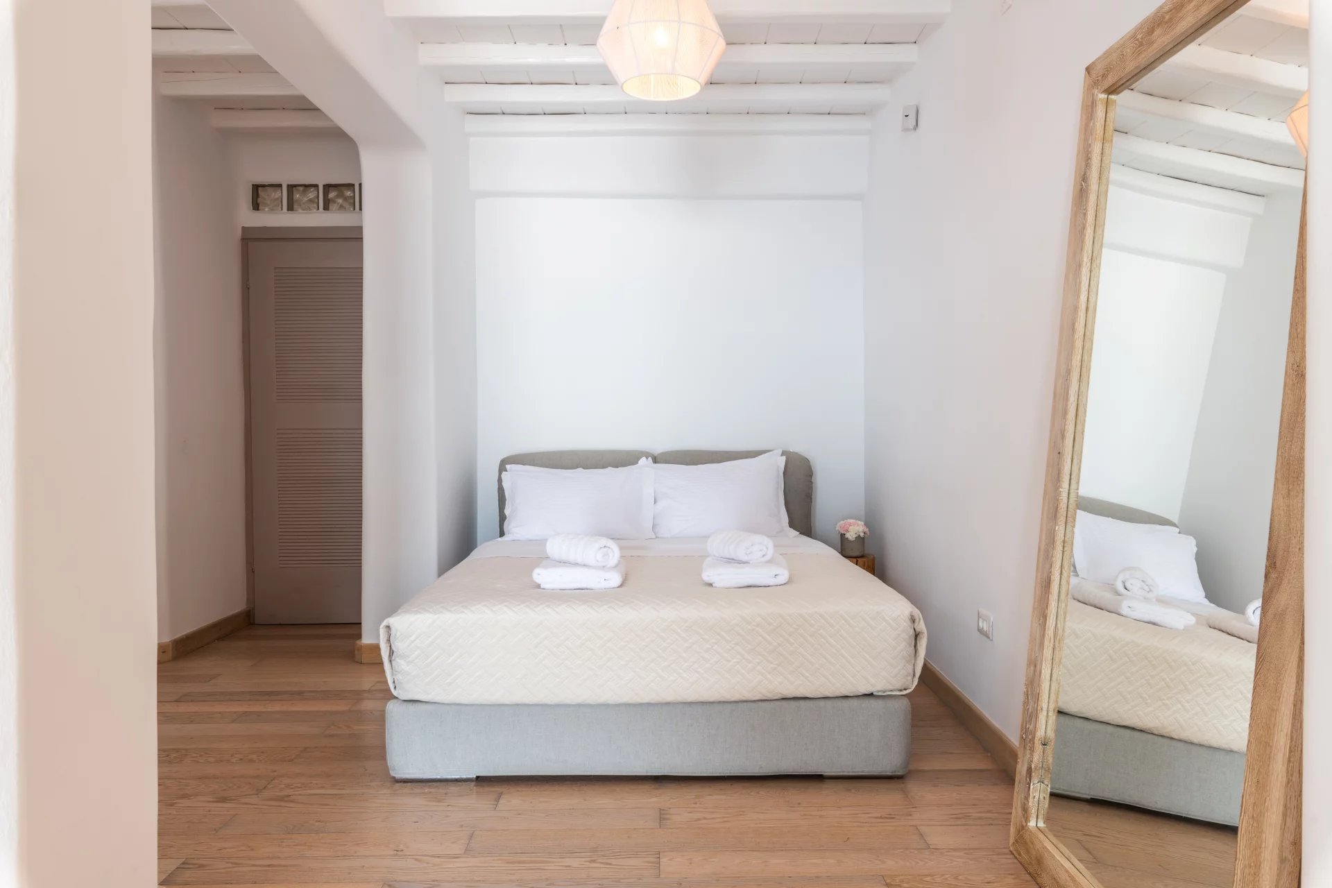 The outdoor areas are designed to enchant guests, featuring a stunning private infinity pool as the centerpiece, along with an alfresco jacuzzi for serene moments with loved ones. A highlight of the space is the pool bar, perfect for serving drinks during unforgettable Mykonian nights. The outdoor area also offers two shaded dining spaces, two shaded lounge areas, and gym equipment for your enjoyment.