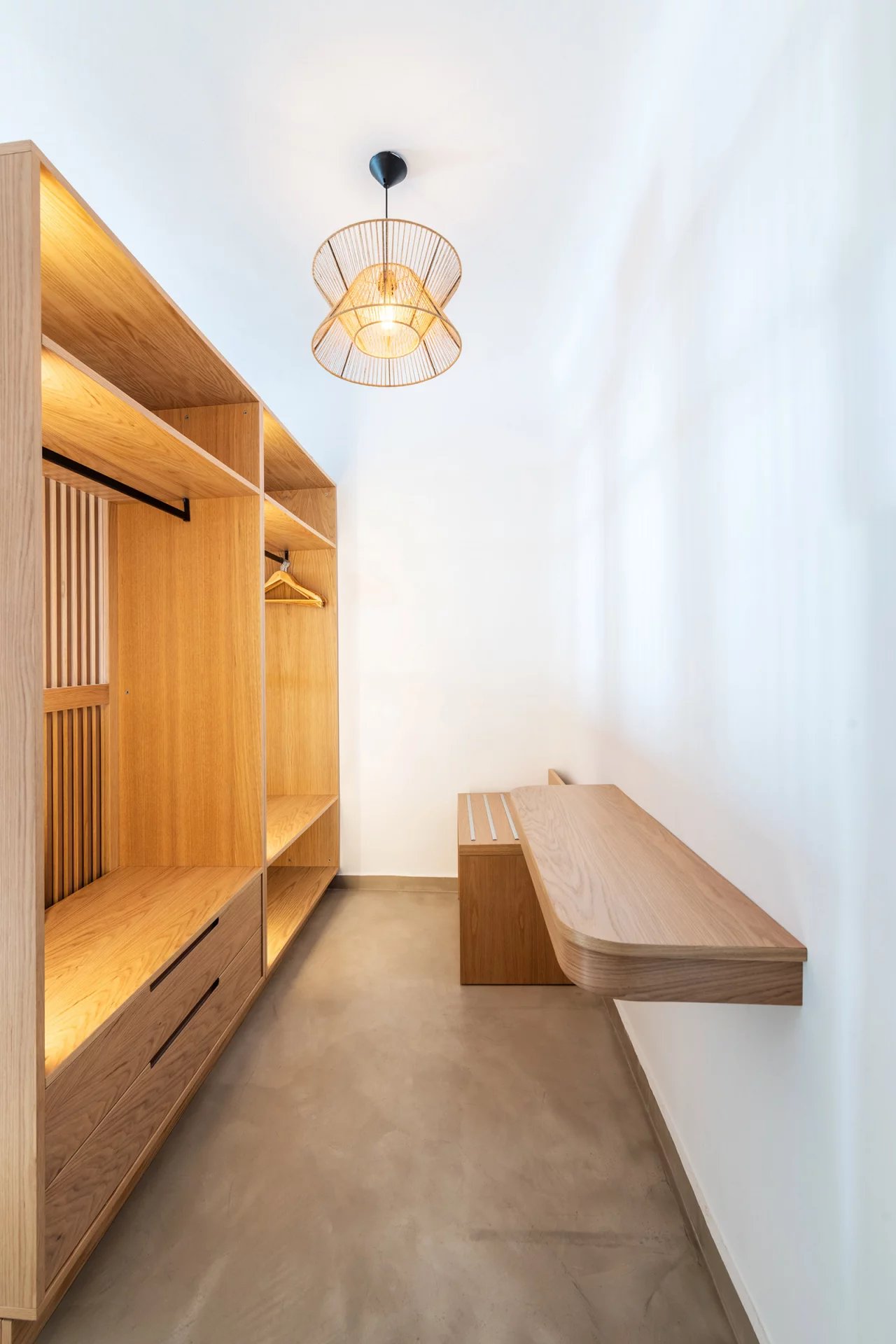 With its modern design and minimalistic interiors in soft pastel tones, the villa exudes an airy ambiance. Each room includes elegant en-suite bathrooms adorned with art deco touches. The ground level hosts an open-plan, fully equipped kitchen, complemented by a dining area and cozy lounge spaces in soothing nude shades.