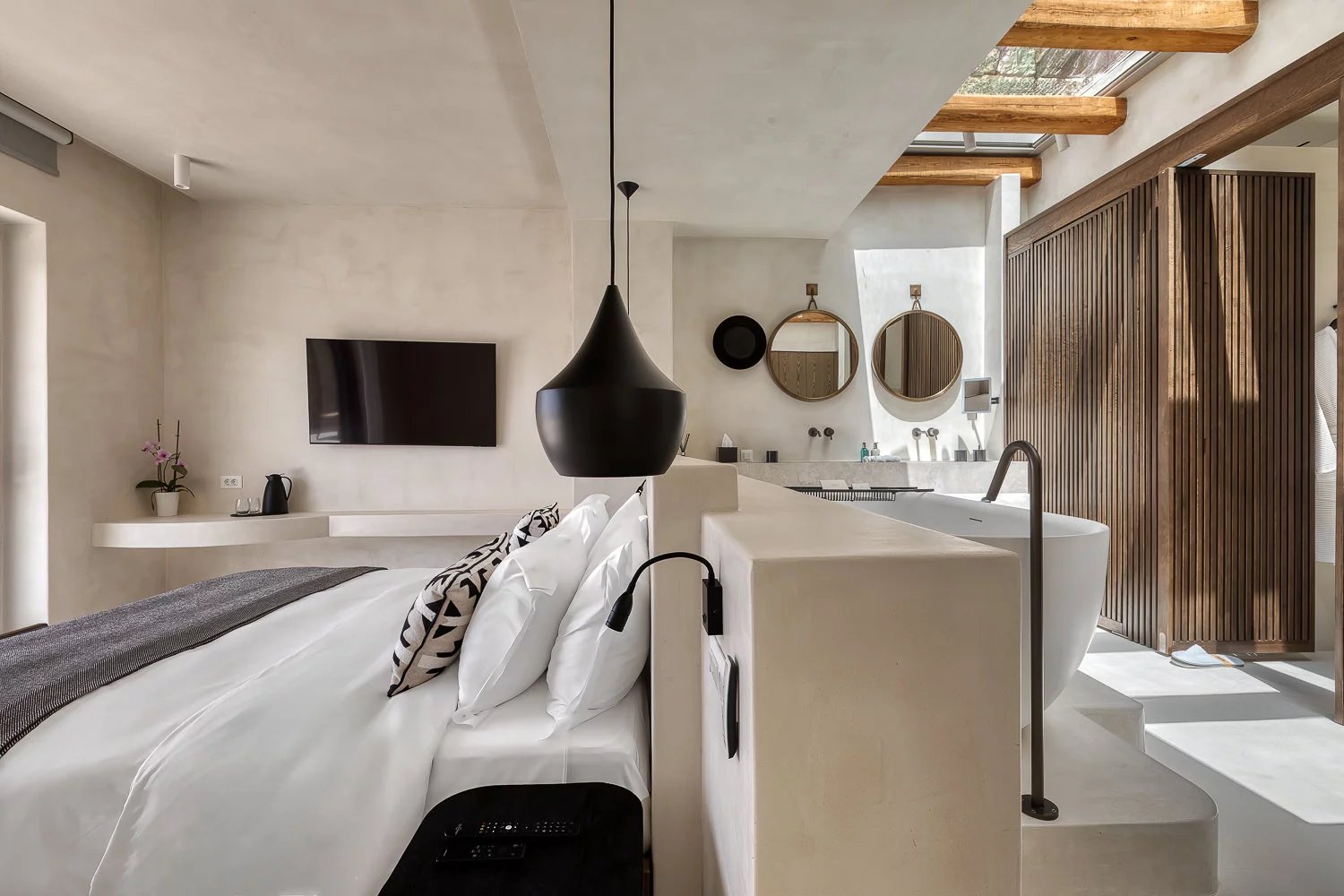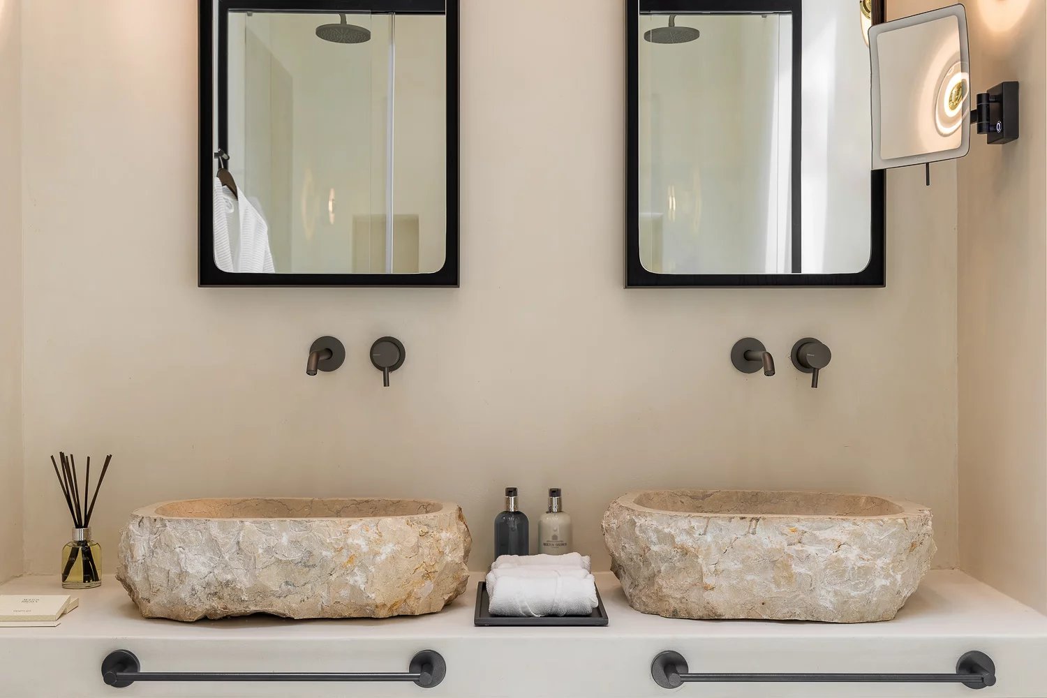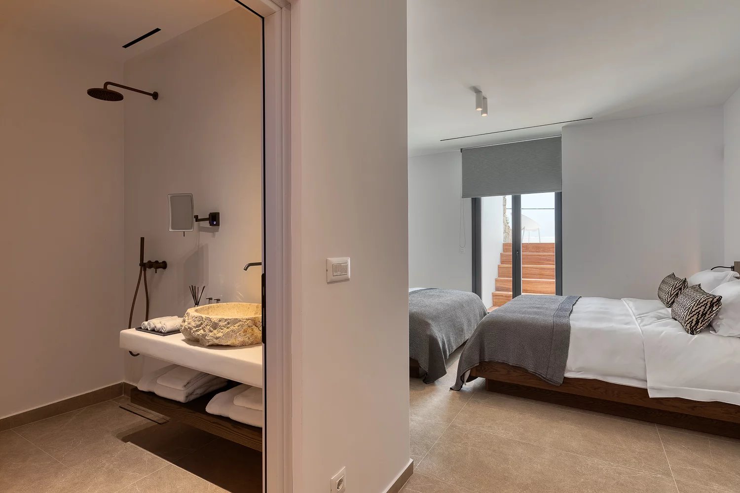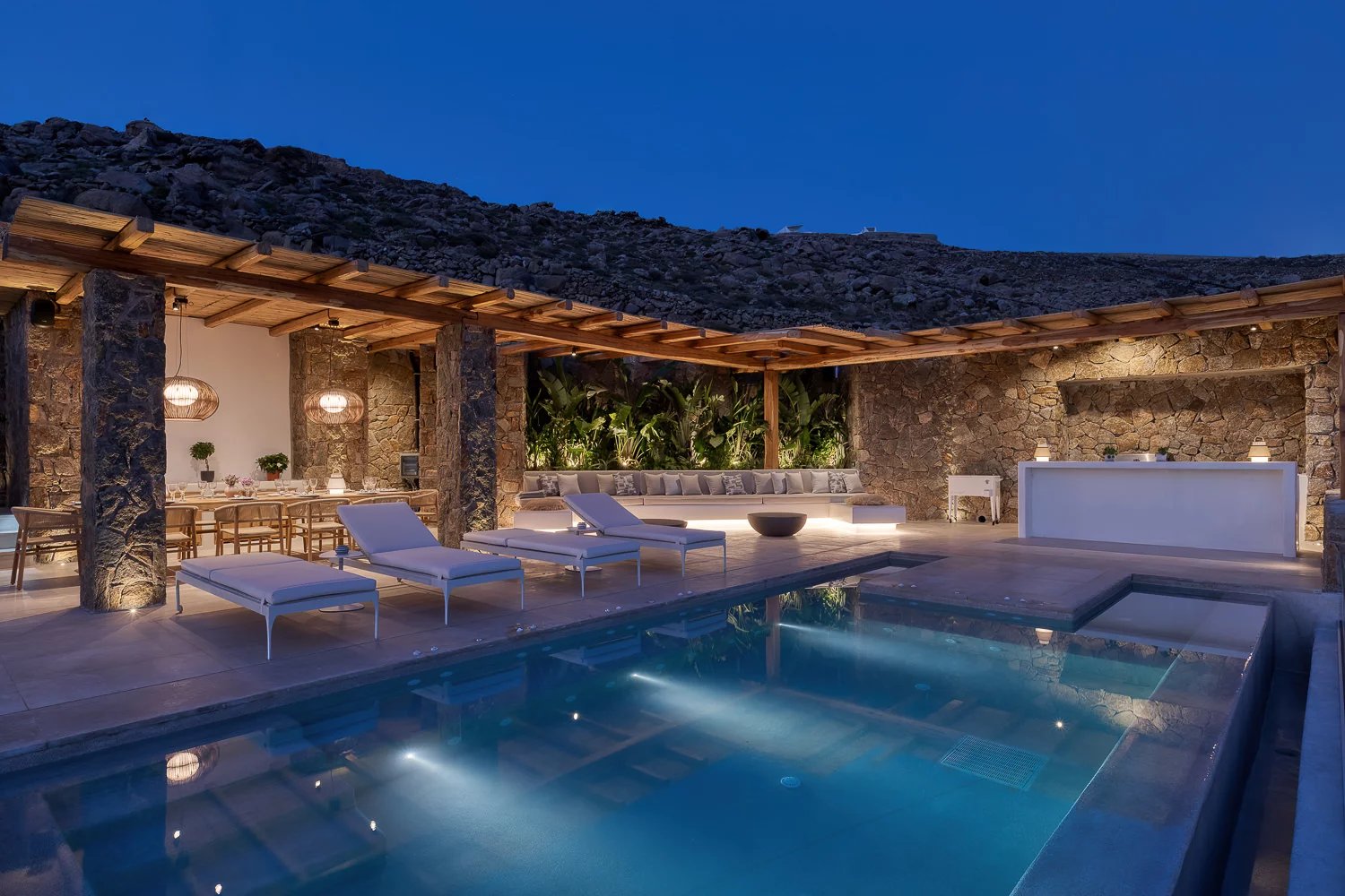 The villa’s bespoke kitchen is a culinary haven, equipped with high-end Gaggenau appliances, perfect for those who appreciate gourmet cooking. A highlight of the property is the expansive terrace, where you can bask in the Mykonian sun beside the heated infinity pool or enjoy meals in the alfresco dining area. For relaxation and indulgence, the villa provides Molton Brown amenities throughout, ensuring a five-star experience.