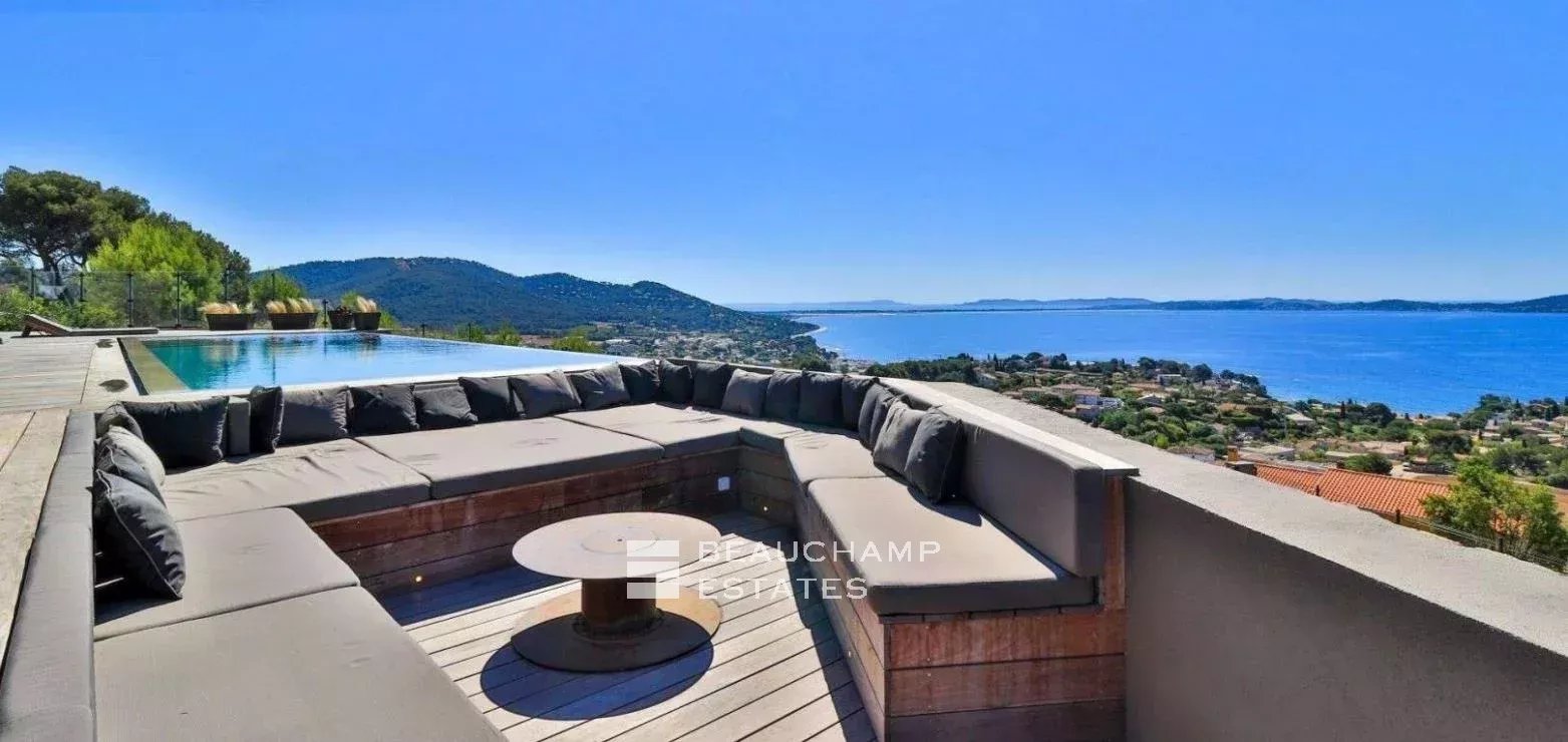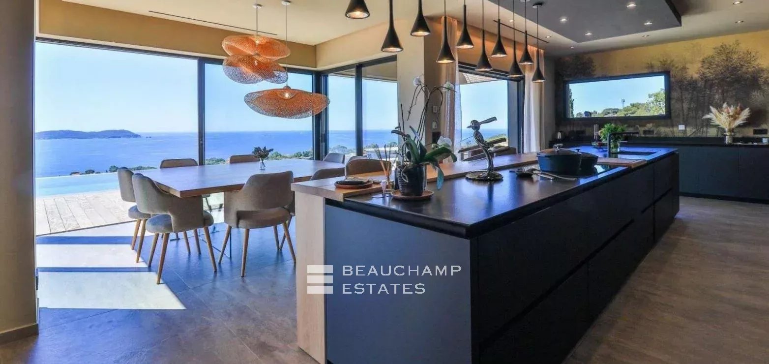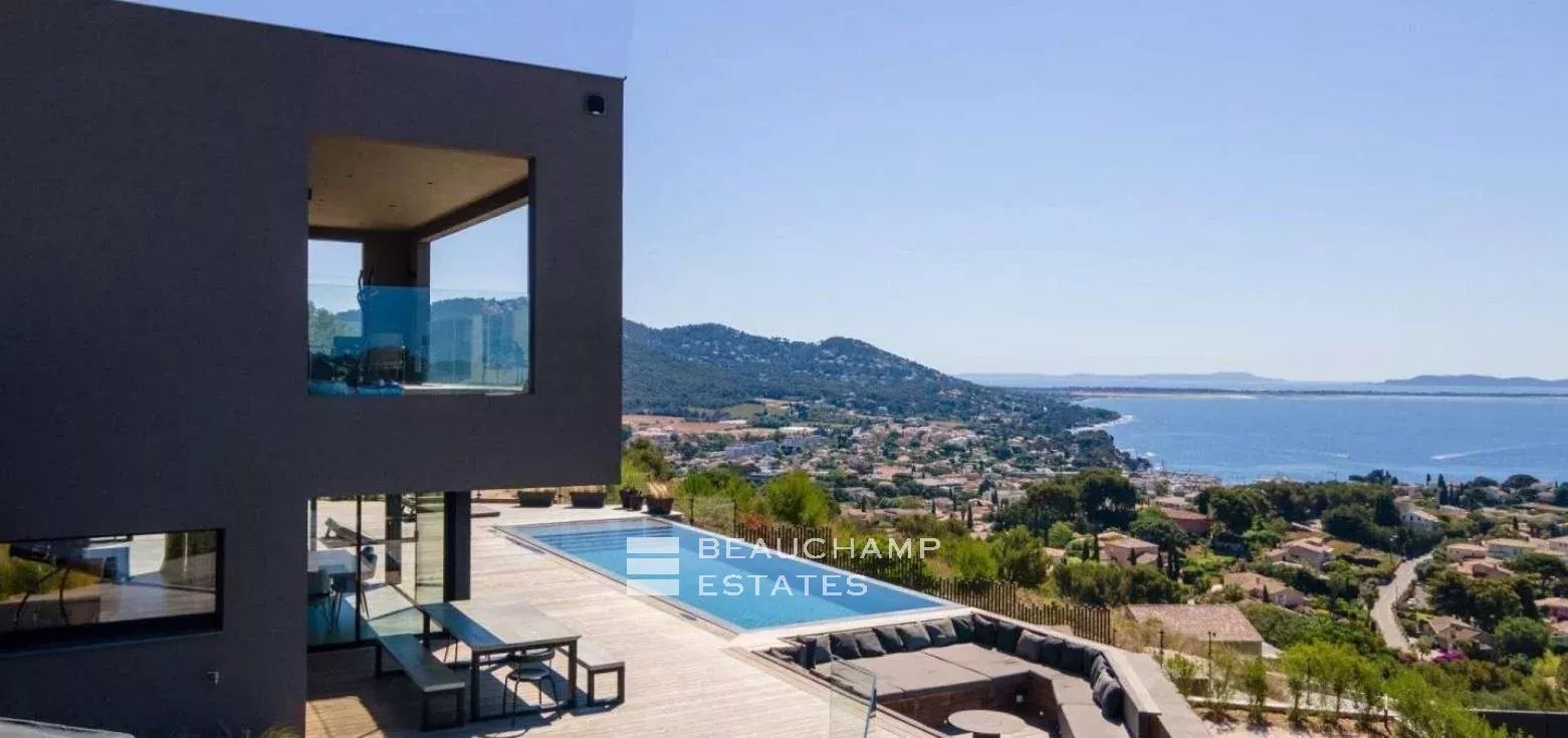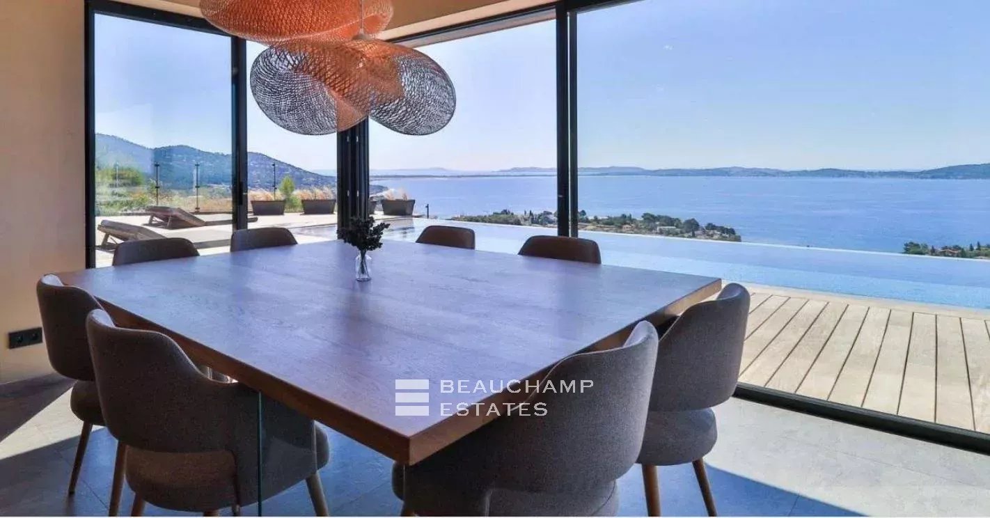 Très belle villa contemporaine de 280 m² construite en 2021 sur un terrain de 2000 m² dominant la baie de l'Almanarre la presqu'île de Giens et Porquerolles. Cette villa aux prestations luxueuses dispose de 5 chambres ensuite avec chacune leur salle de bain ainsi qu'un espace dressing. La pièce de vie s'ouvre sur une terrasse de 300 m² et la piscine afin de pouvoir profiter d'une vue mer exceptionnelle. La piscine miroir fait 12 m de long et est accompagné d'un pool house et d'un jacuzzi 6 places. Garage double et nombreux stationnements.