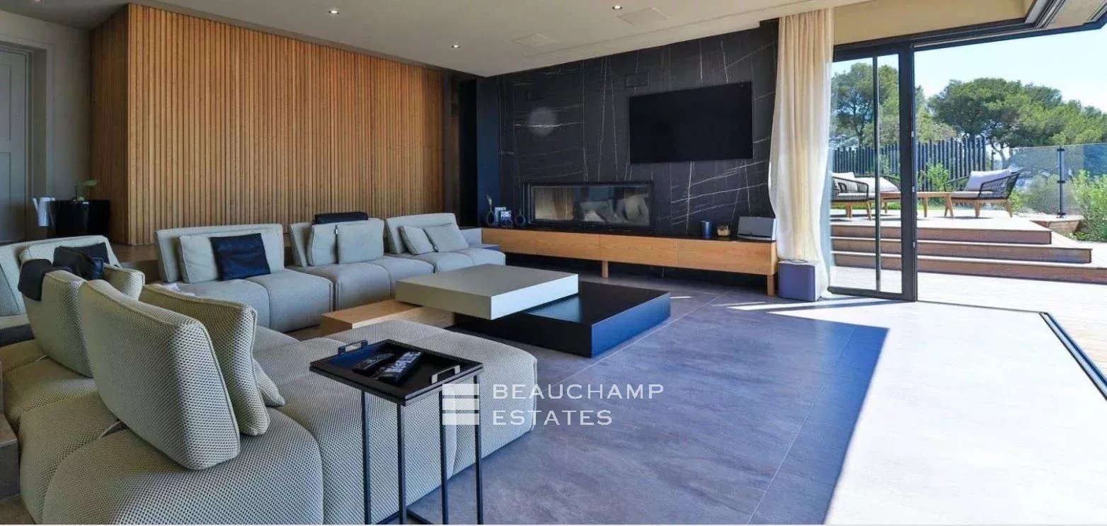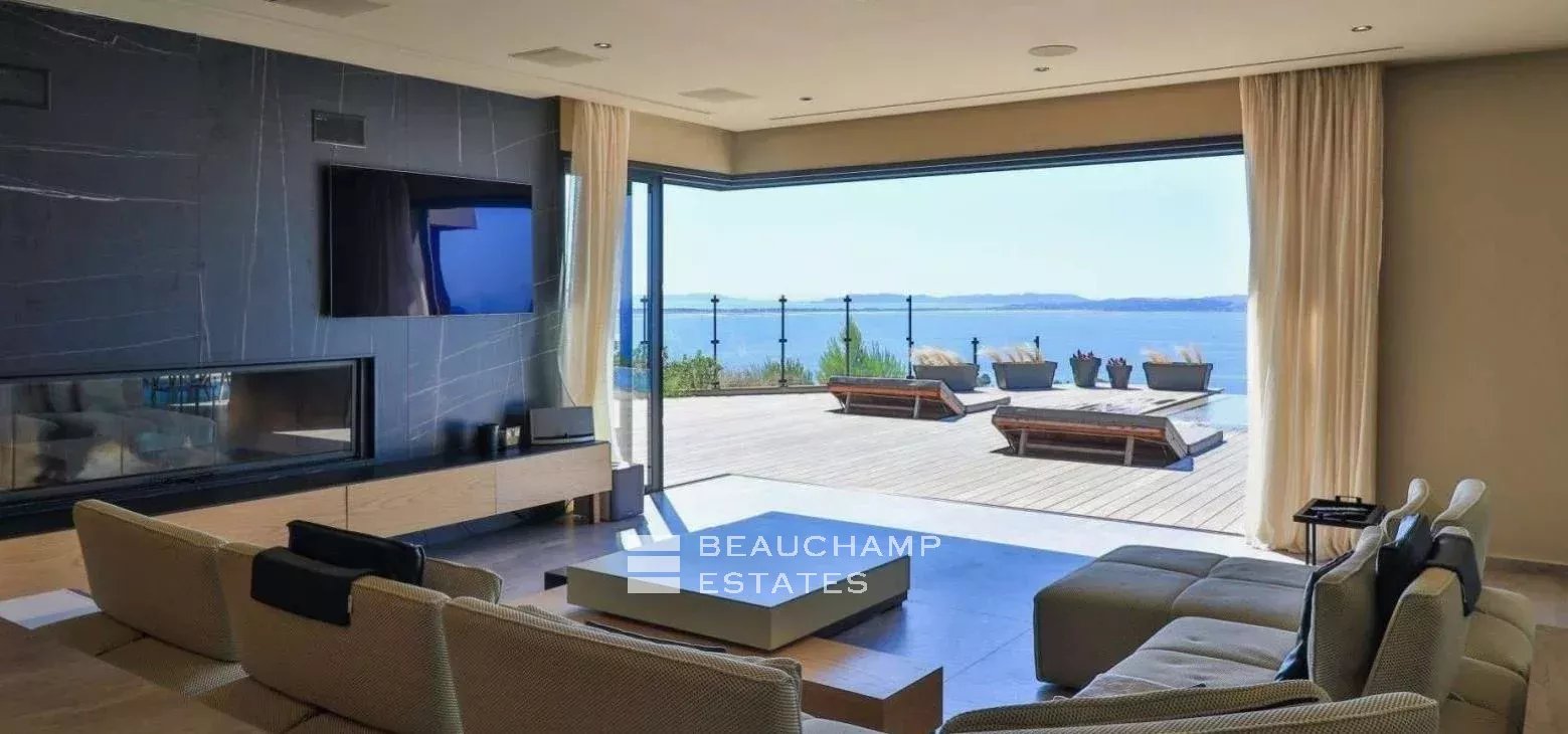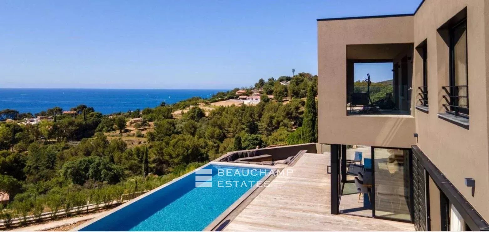 Très belle villa contemporaine de 280 m² construite en 2021 sur un terrain de 2000 m² dominant la baie de l'Almanarre la presqu'île de Giens et Porquerolles. Cette villa aux prestations luxueuses dispose de 5 chambres ensuite avec chacune leur salle de bain ainsi qu'un espace dressing. La pièce de vie s'ouvre sur une terrasse de 300 m² et la piscine afin de pouvoir profiter d'une vue mer exceptionnelle. La piscine miroir fait 12 m de long et est accompagné d'un pool house et d'un jacuzzi 6 places. Garage double et nombreux stationnements.