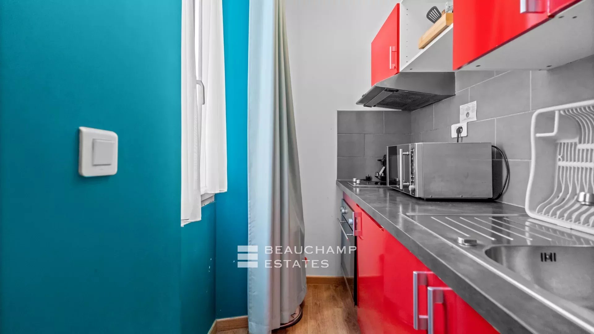 Two-room apartment of 30m², city side with air conditioning, comprises a living room with a double sofa bed, a separate fitted kitchen, a separate bedroom with a double bed and a bathroom with shower and toilet.