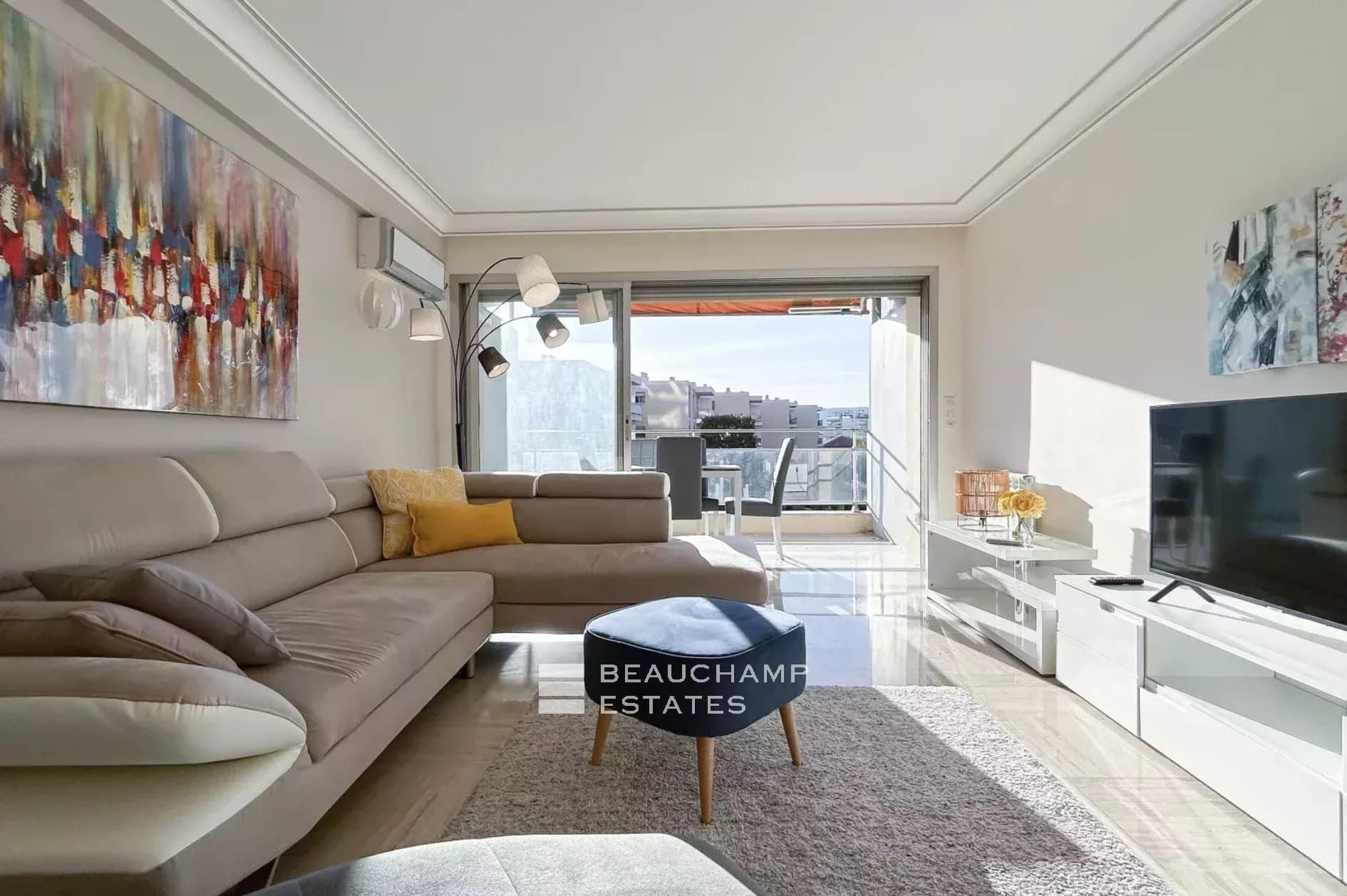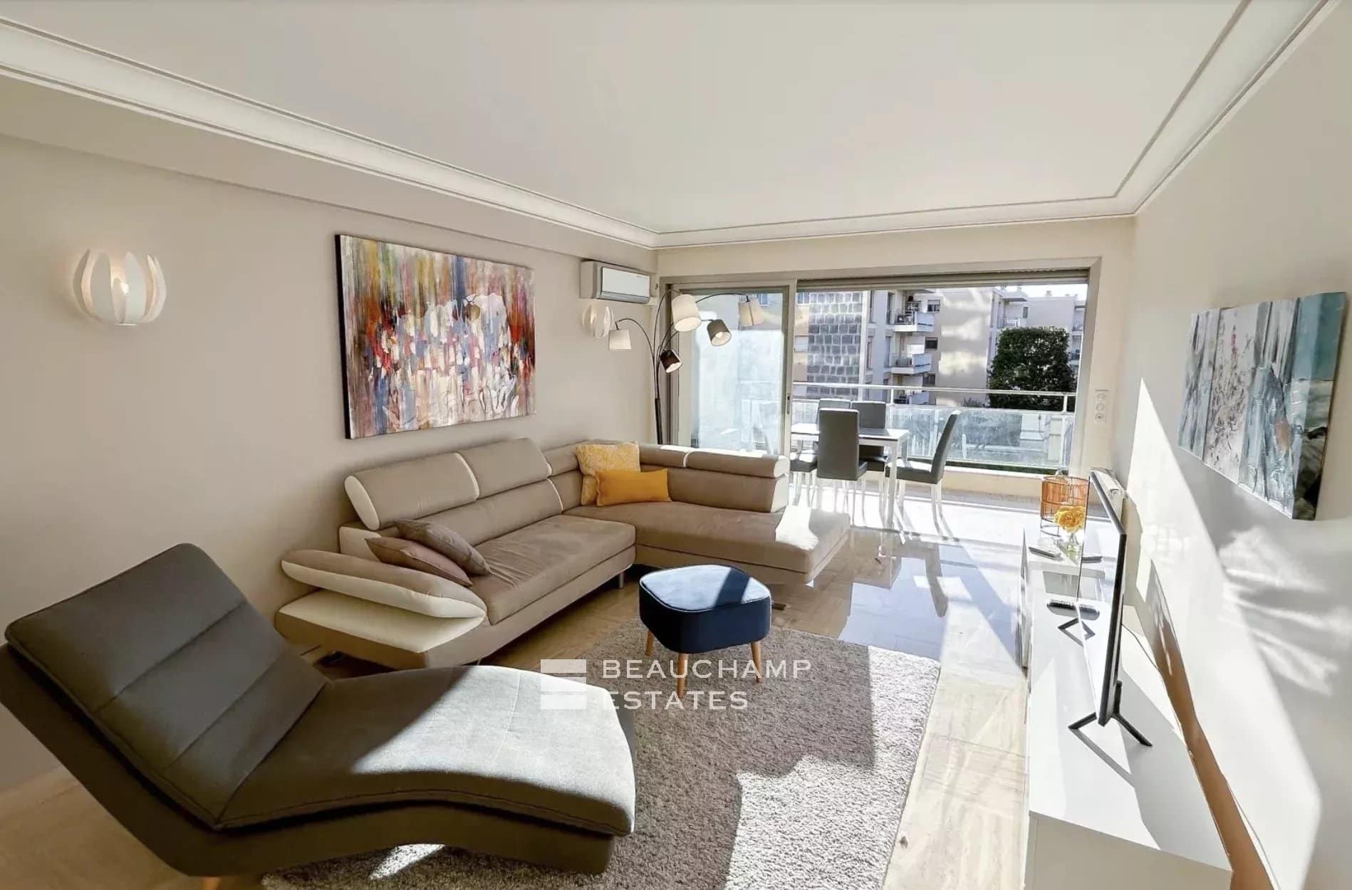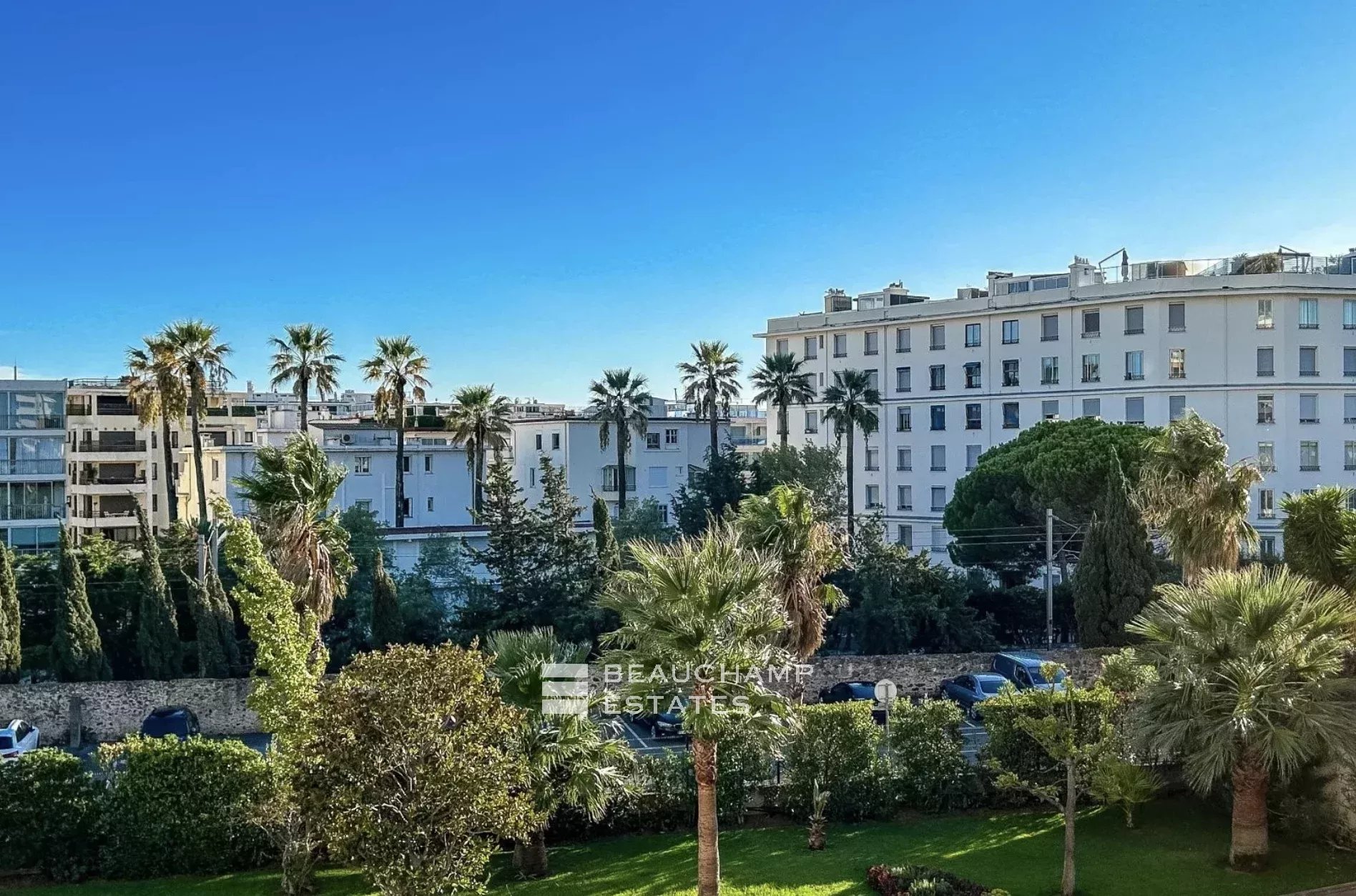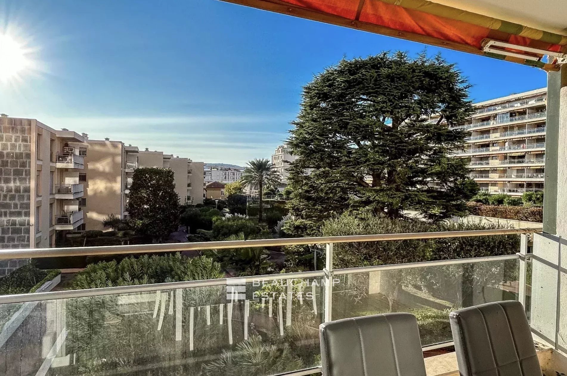 3P - 2 PAS CROISETTE Au sein d'une résidence sécurisée, proche de toutes les commodités et de la célèbre Croisette, cet appartement d'environ 80 m2 se compose d'un hall, séjour lumineux donnant sur une terrasse de 10 m2 exposée Ouest vue verdure et collines, 2 chambres dont une bénéficiant d'une salle de douche, puis une salle de bains avec WC, des WC indépendants, une cuisine entièrement équipée indépendante avec accès sur un balcon exposé Est et communiquant avec les chambres. L'appartement est climatisé et dispose de plusieurs placards de rangements. Une grande place de parking et une cave viennent compléter ce bien.