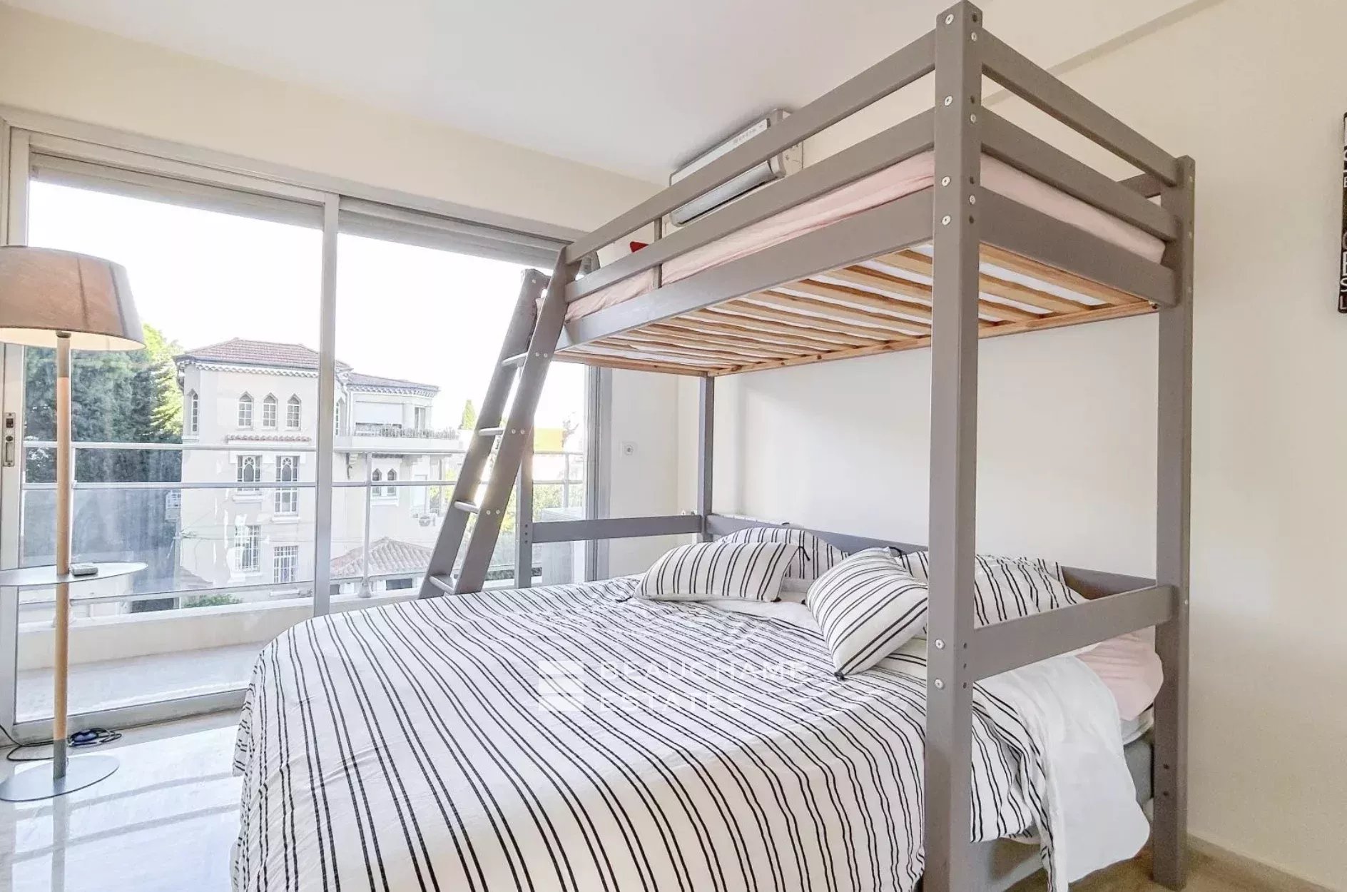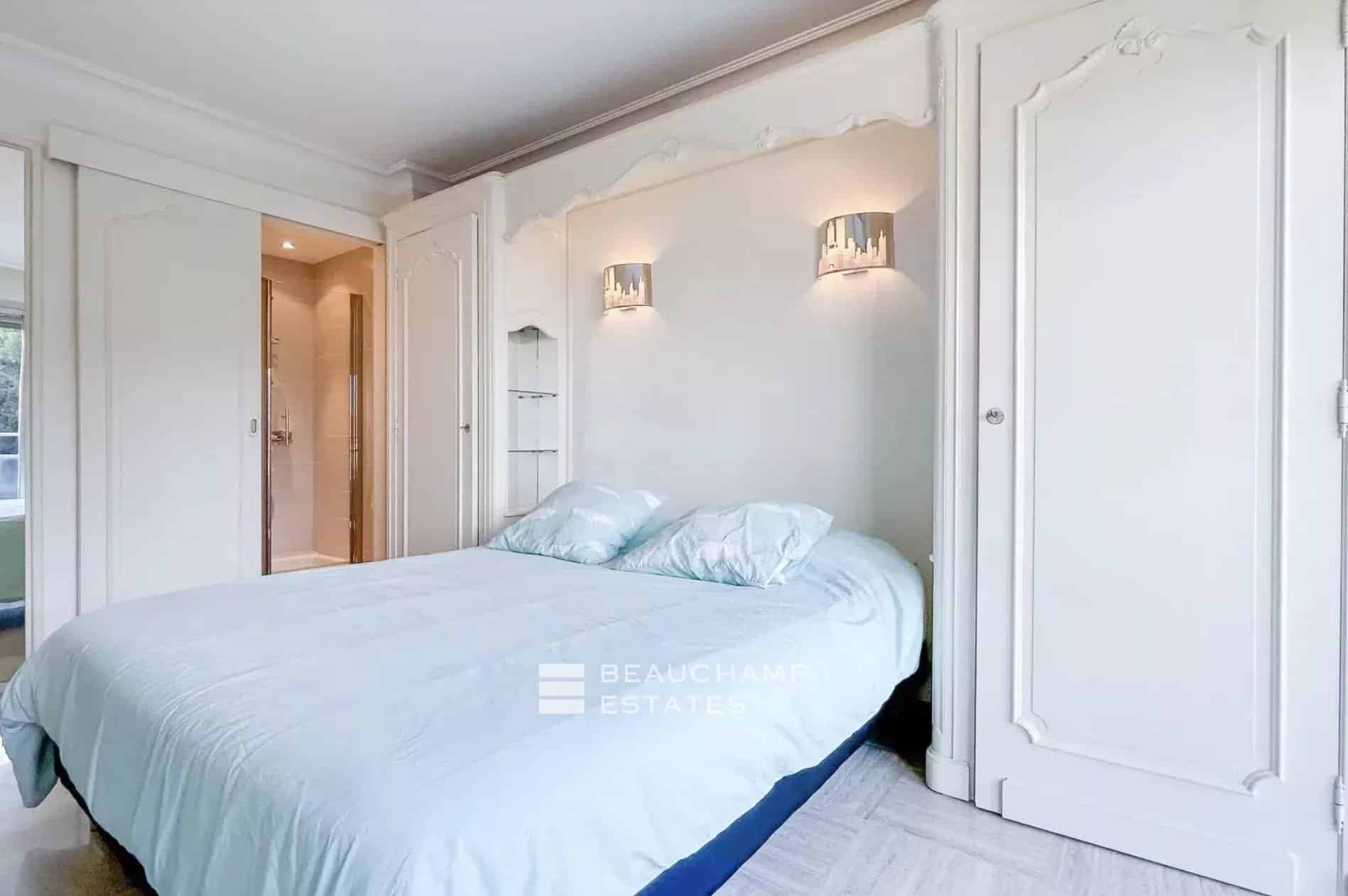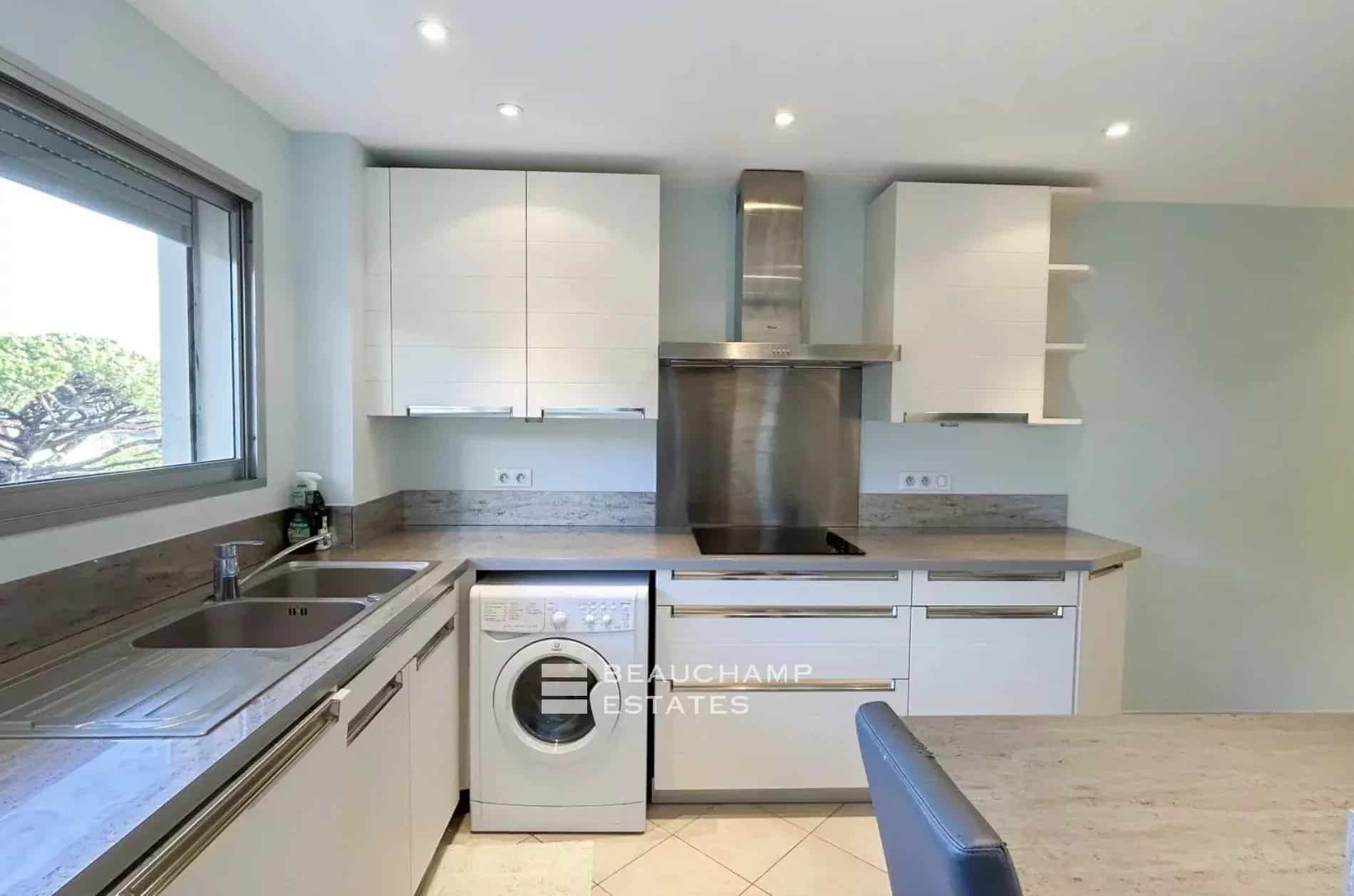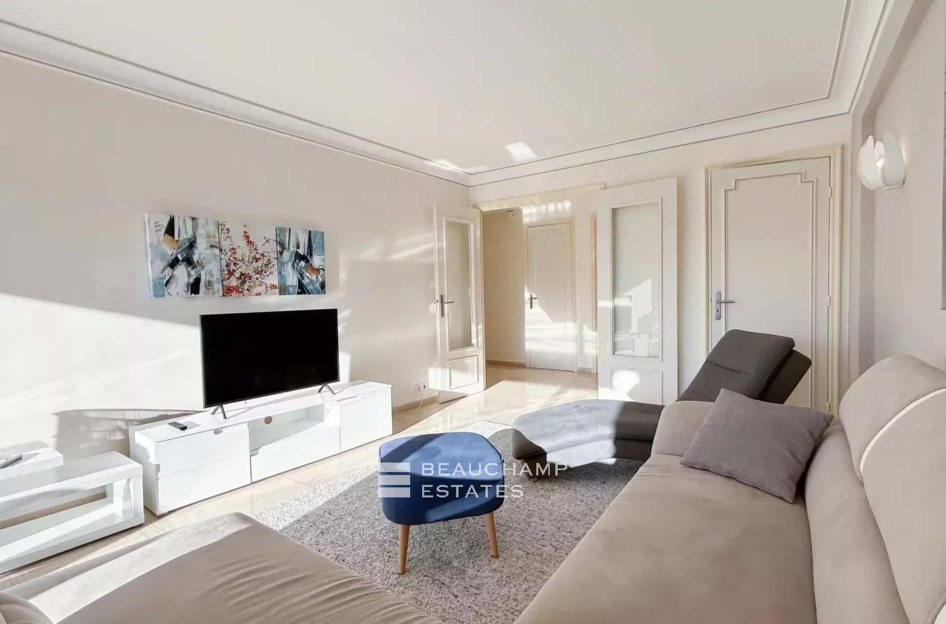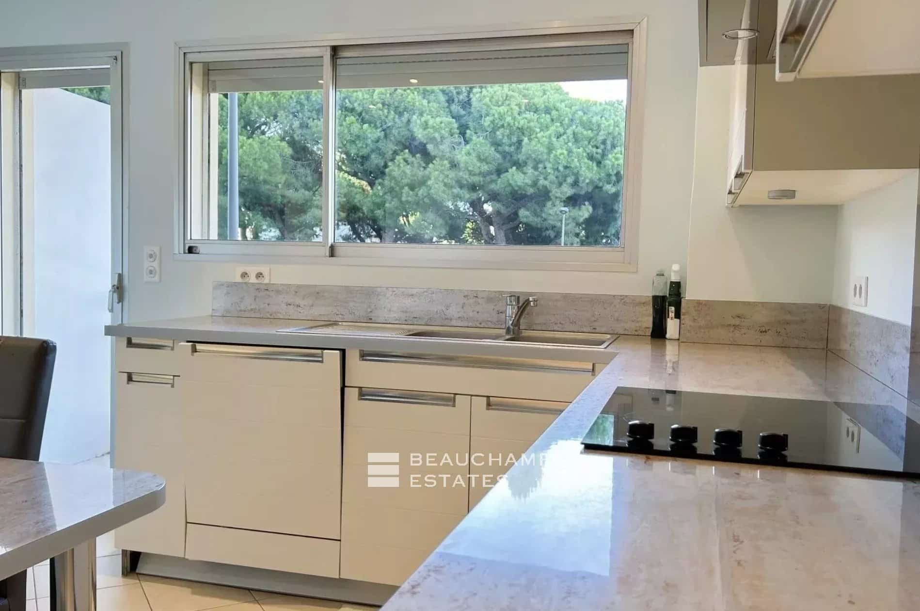 3P - 2 PAS CROISETTE Au sein d'une résidence sécurisée, proche de toutes les commodités et de la célèbre Croisette, cet appartement d'environ 80 m2 se compose d'un hall, séjour lumineux donnant sur une terrasse de 10 m2 exposée Ouest vue verdure et collines, 2 chambres dont une bénéficiant d'une salle de douche, puis une salle de bains avec WC, des WC indépendants, une cuisine entièrement équipée indépendante avec accès sur un balcon exposé Est et communiquant avec les chambres. L'appartement est climatisé et dispose de plusieurs placards de rangements. Une grande place de parking et une cave viennent compléter ce bien.