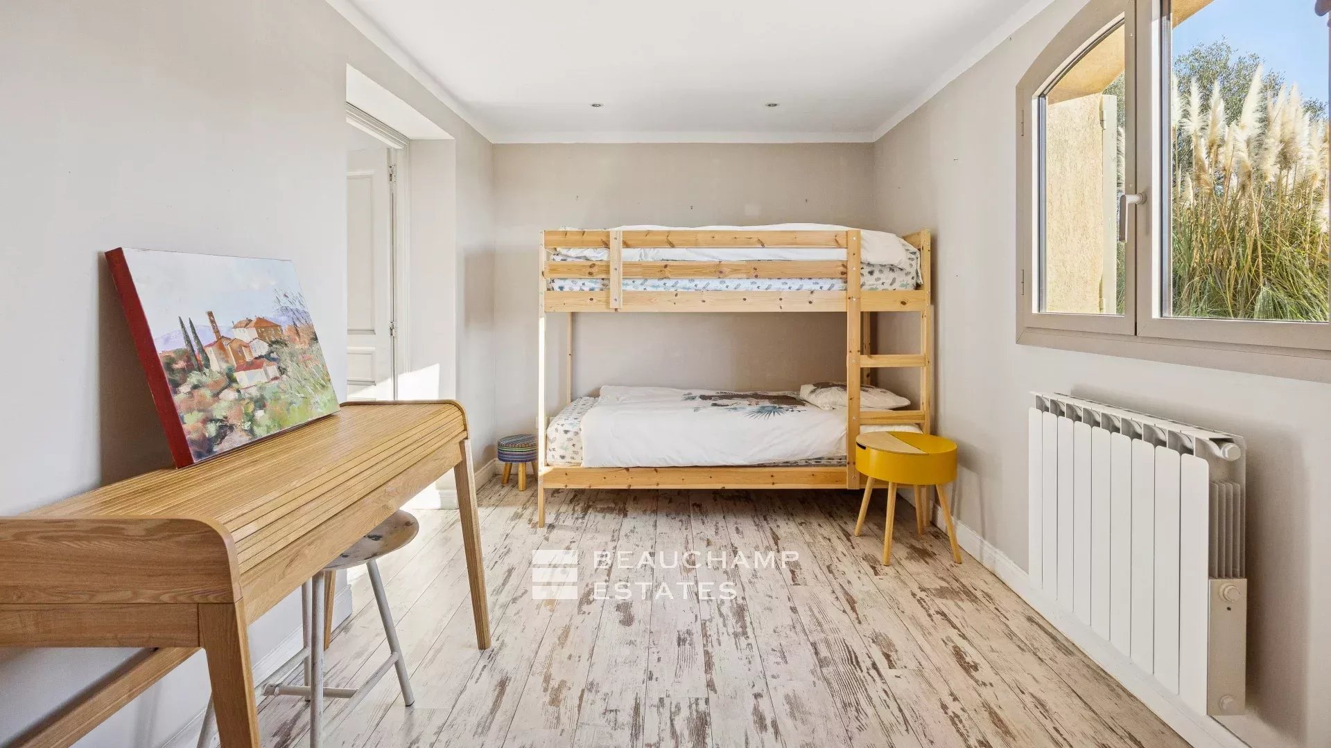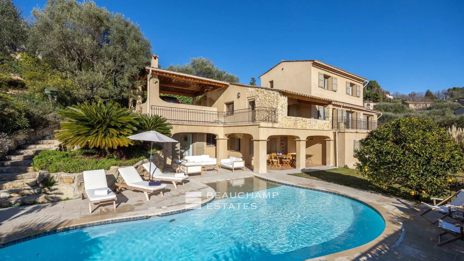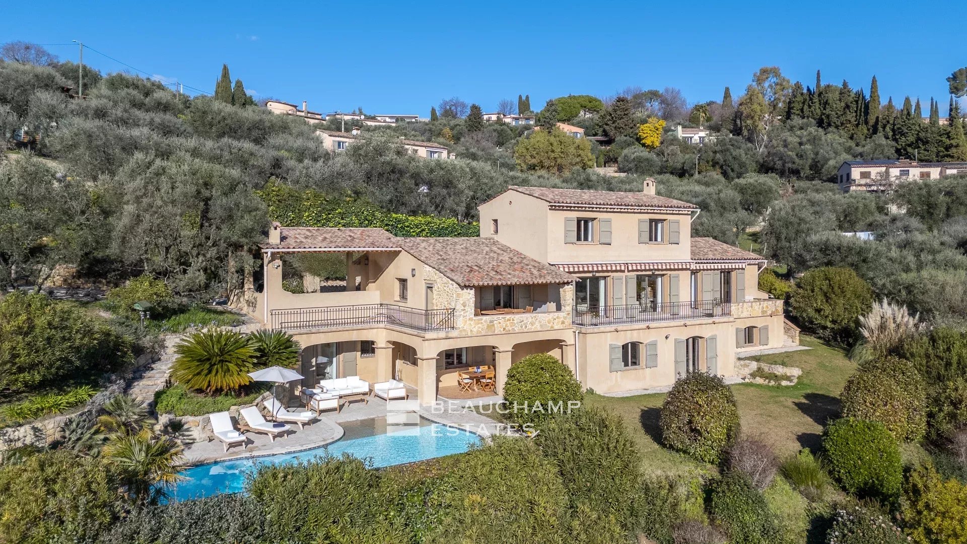 Located in the heart of a residential neighborhood in Opio, close to shops and the golf course, this charming 300m² villa sits on a beautiful 3,200m² terraced plot with trees.