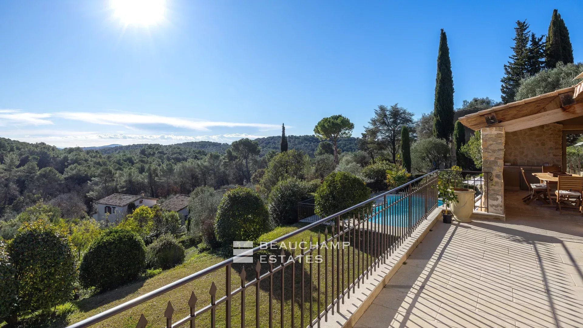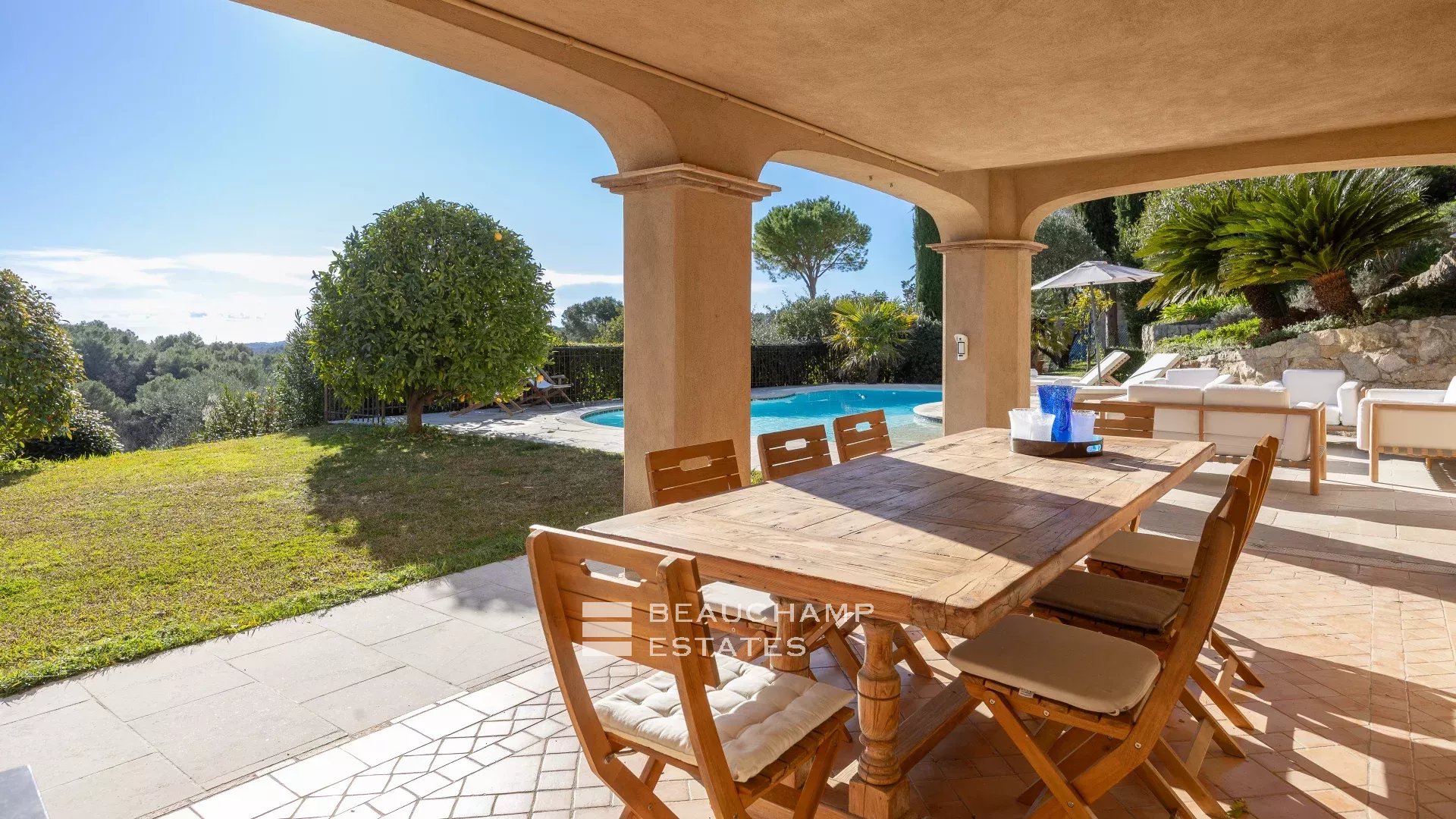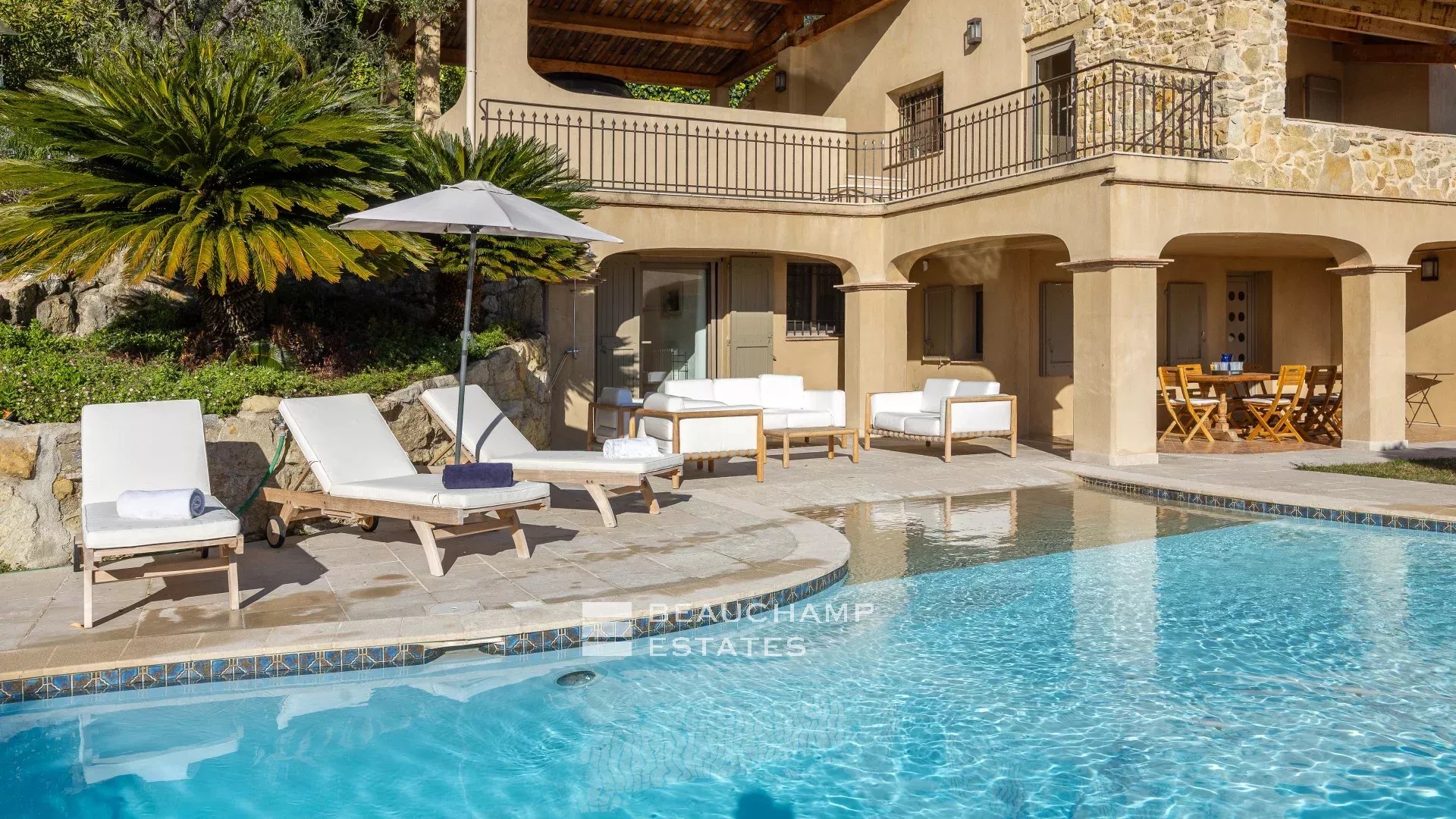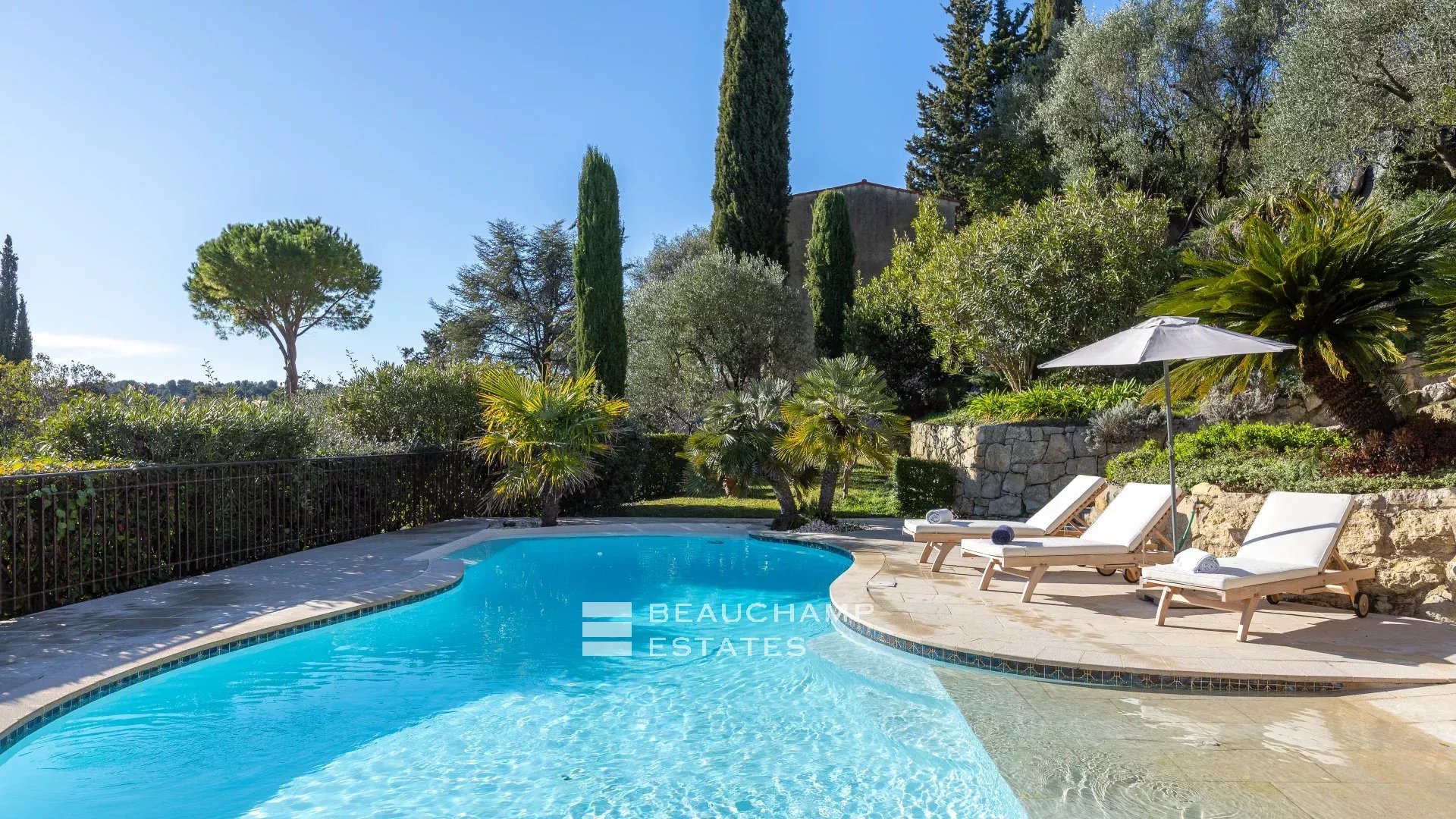 Located in the heart of a residential neighborhood in Opio, close to shops and the golf course, this charming 300m² villa sits on a beautiful 3,200m² terraced plot with trees.