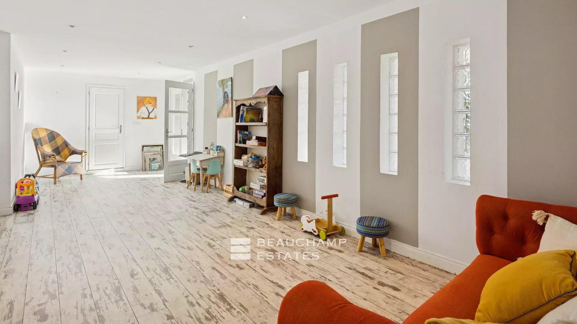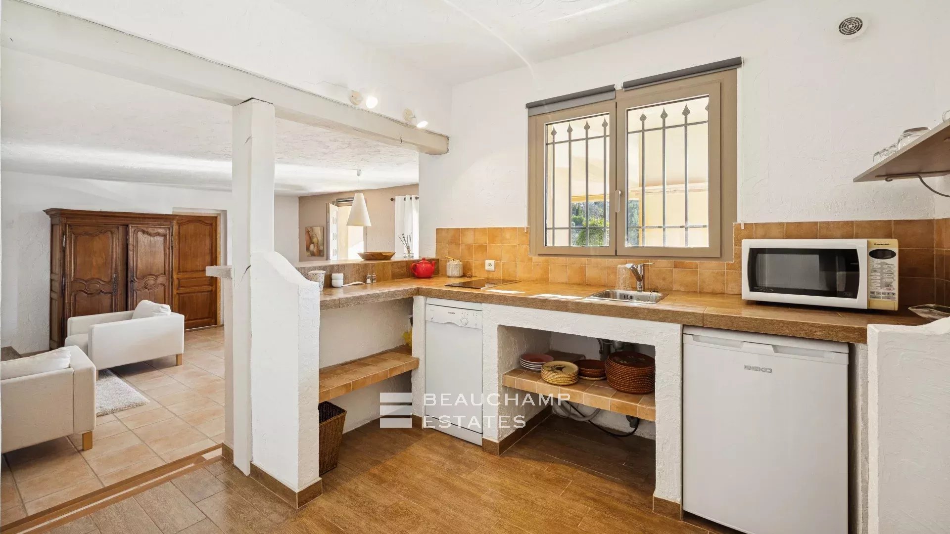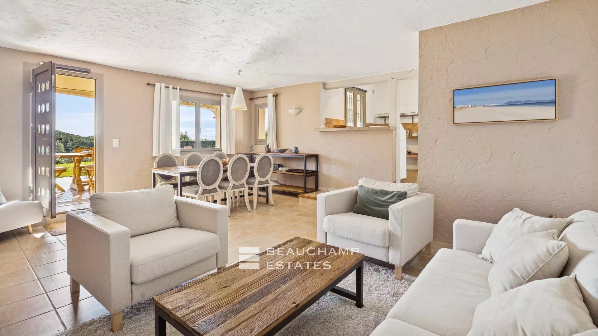 - A living room with a lovely bright lounge and dining room, opening onto the terrace
