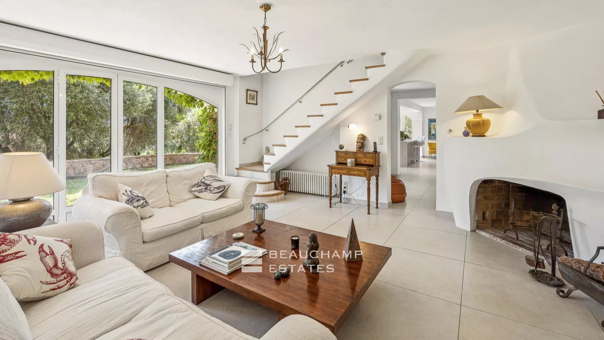 The villa features a bright and airy living space adorned with a unique artist-designed fireplace, as well as a large, fully equipped kitchen that opens seamlessly onto a terrace — ideal for relaxed gatherings with family and friends.