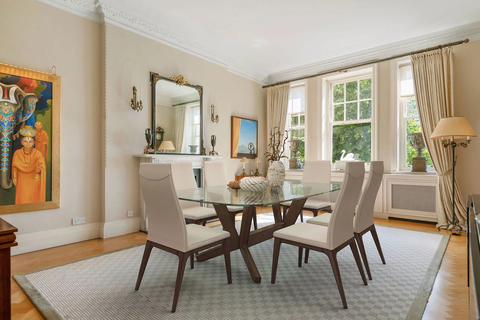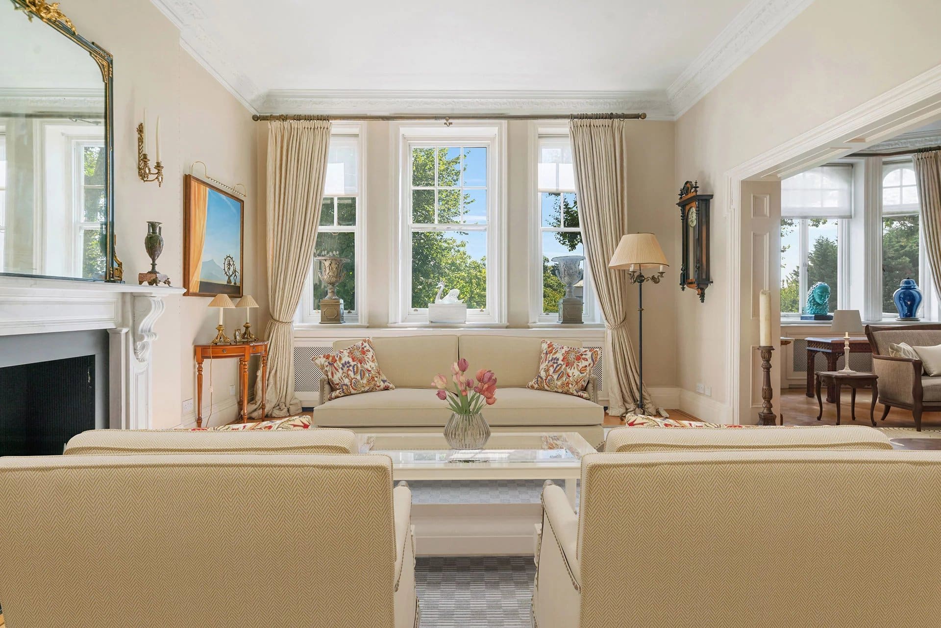 A grand apartment on the first floor of this iconic block in St John’s Wood comprising 2778 sq ft, with stunning period features and three generous reception rooms overlooking Regent’s Park. The flat also has a small balcony off one of the reception rooms.