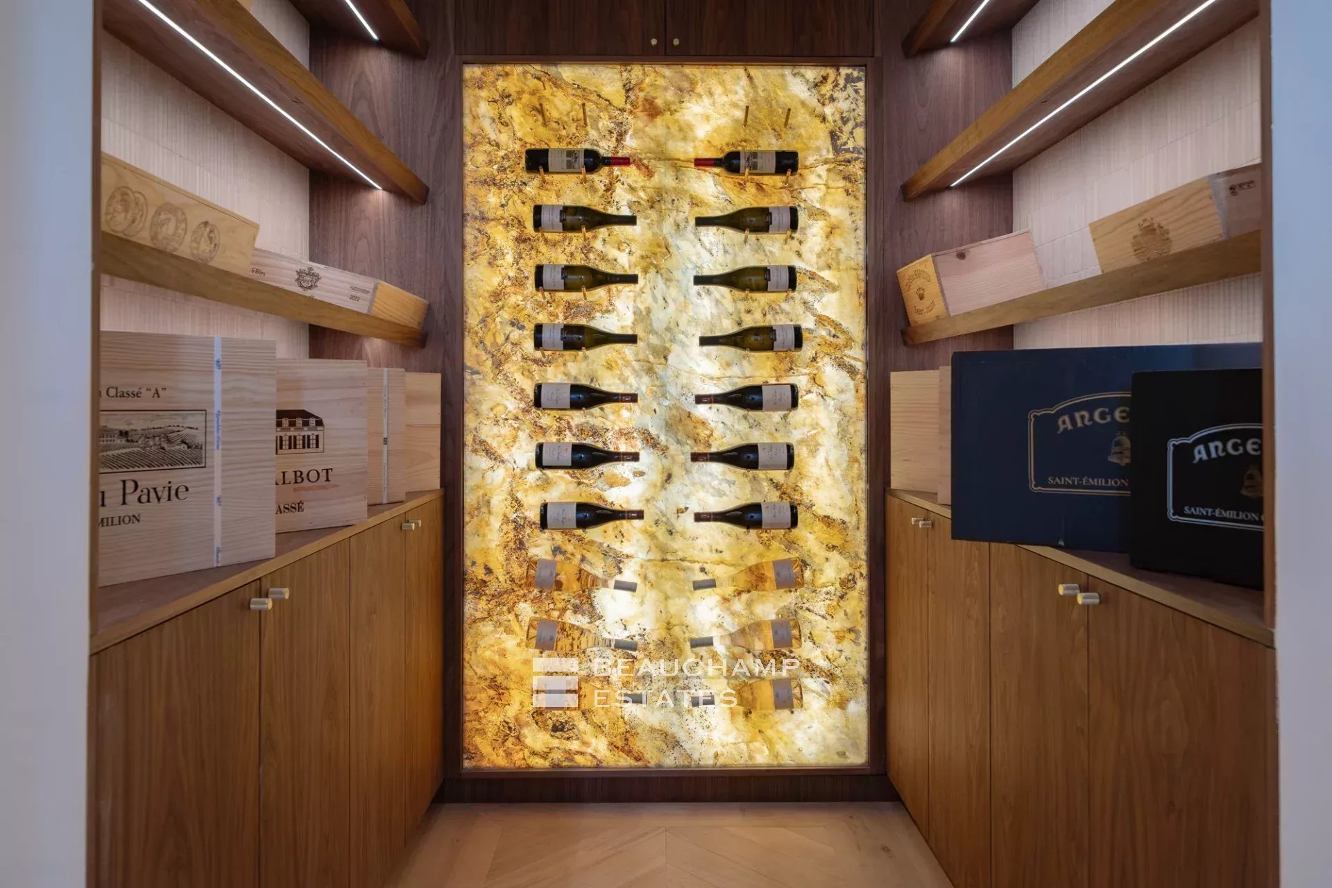 A majestic entrance hall serves the various rooms of the apartment, including a magnificent glazed wine cellar, a large bedroom en suite, a large double living/dining room, as well as a