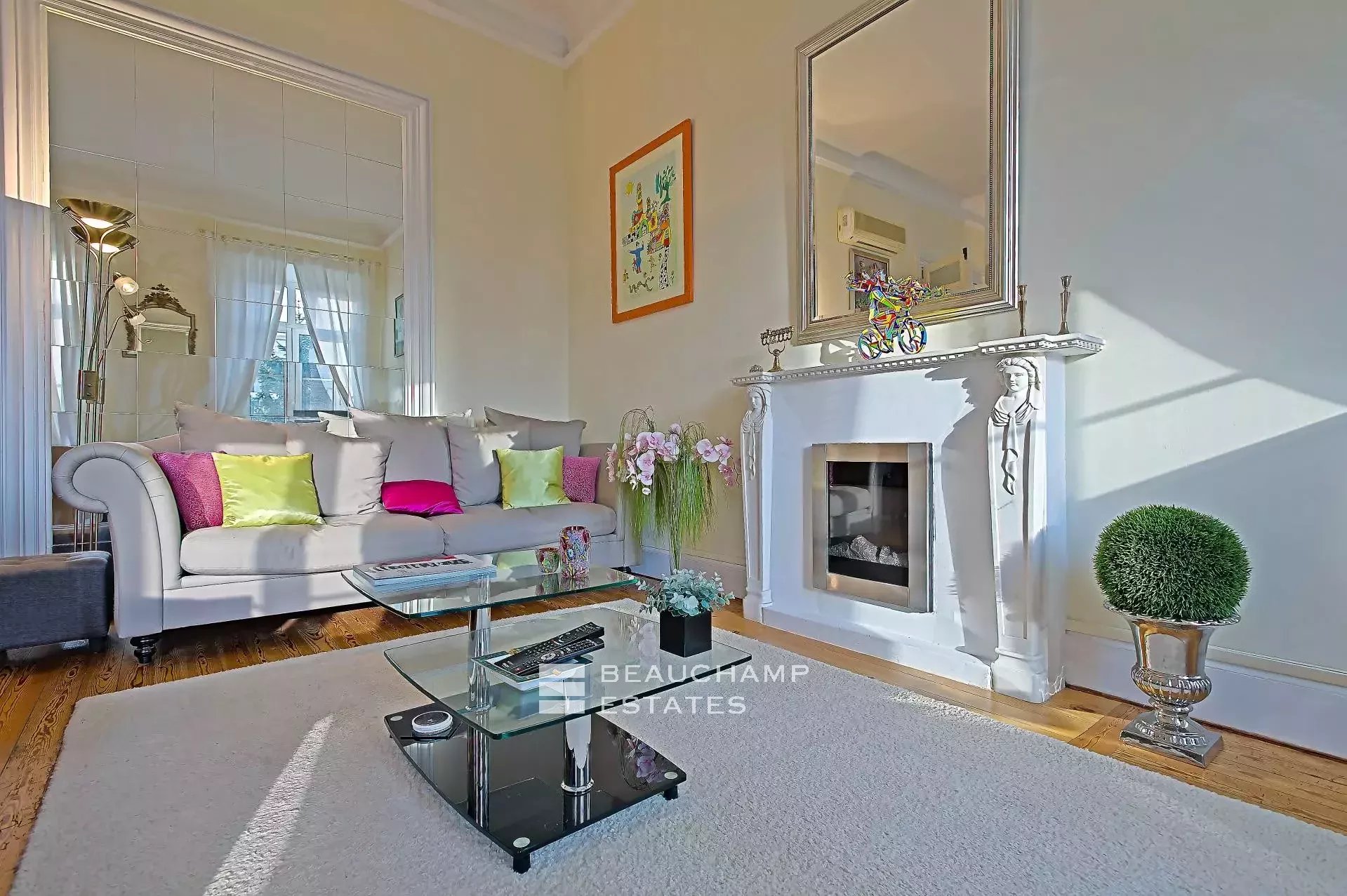- An open and bright living space tastefully decorated with a fire place, 2 sofas, flat screen TV, dining table for 6 people, wooden floors and very high ceilings