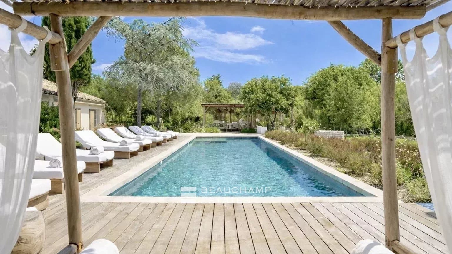 The fully equipped pool house, featuring a cozy lounge area, invites you to enjoy an aperitif in complete tranquility, while the wooden sun loungers promise blissful moments of relaxation.