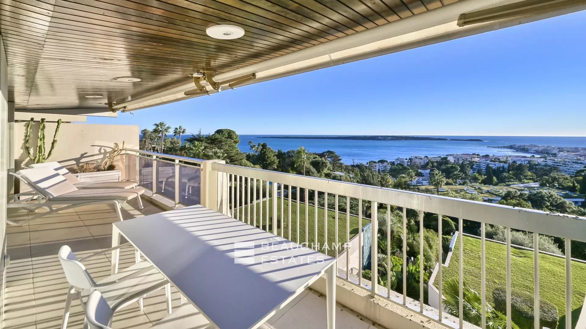 This top-floor flat of 125 sqm with large terrace lift is in a very quiet location and offers panoramic sea views from the Lérins Islands to the Esterel. It is located in a high-end secure residence with a caretaker.
