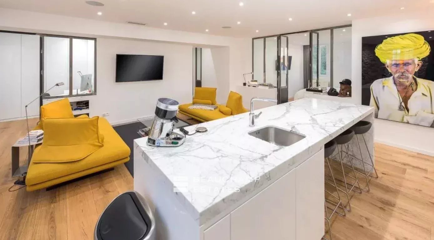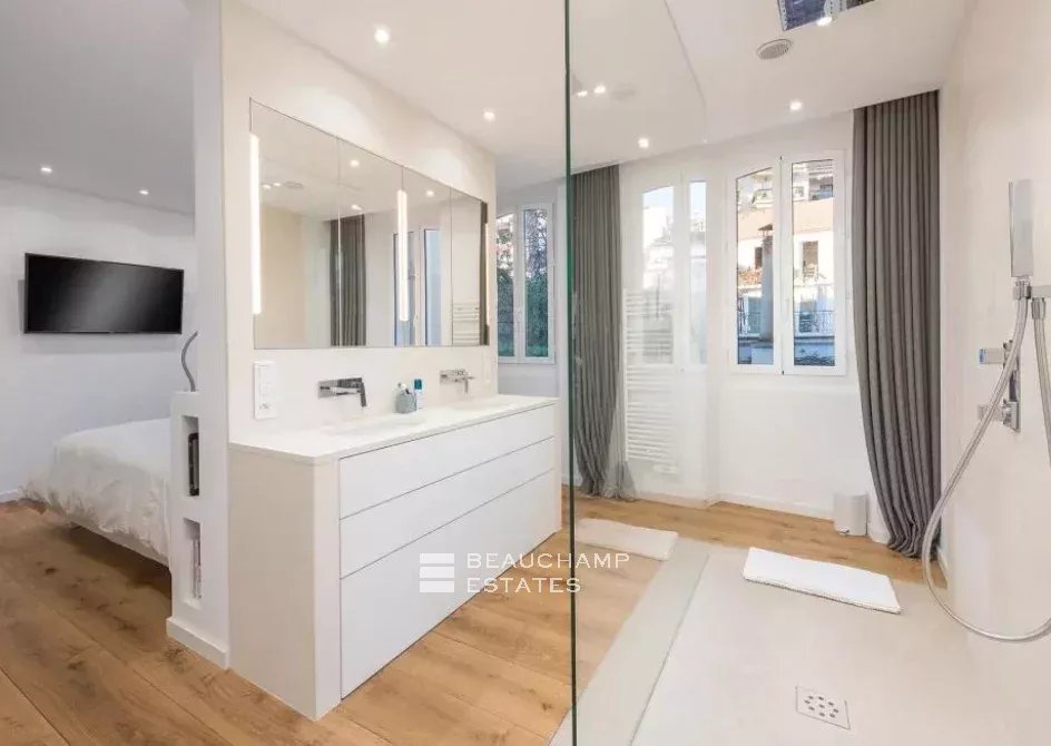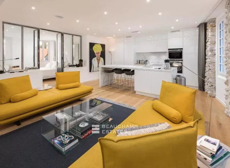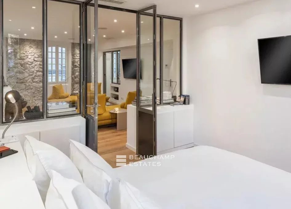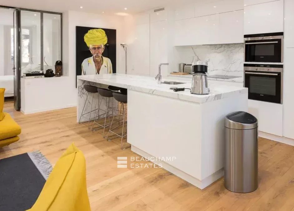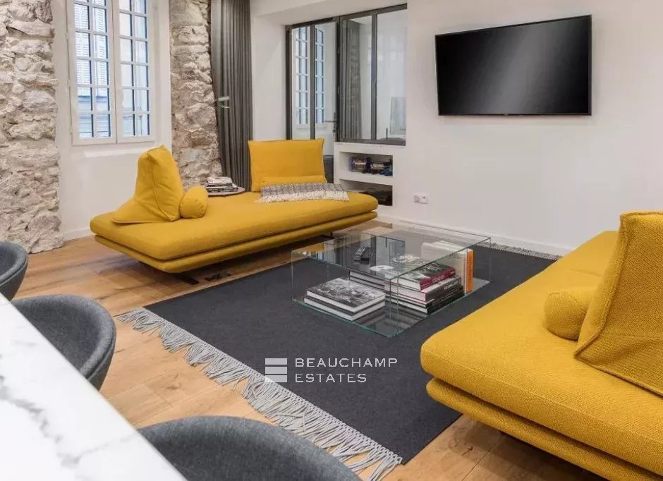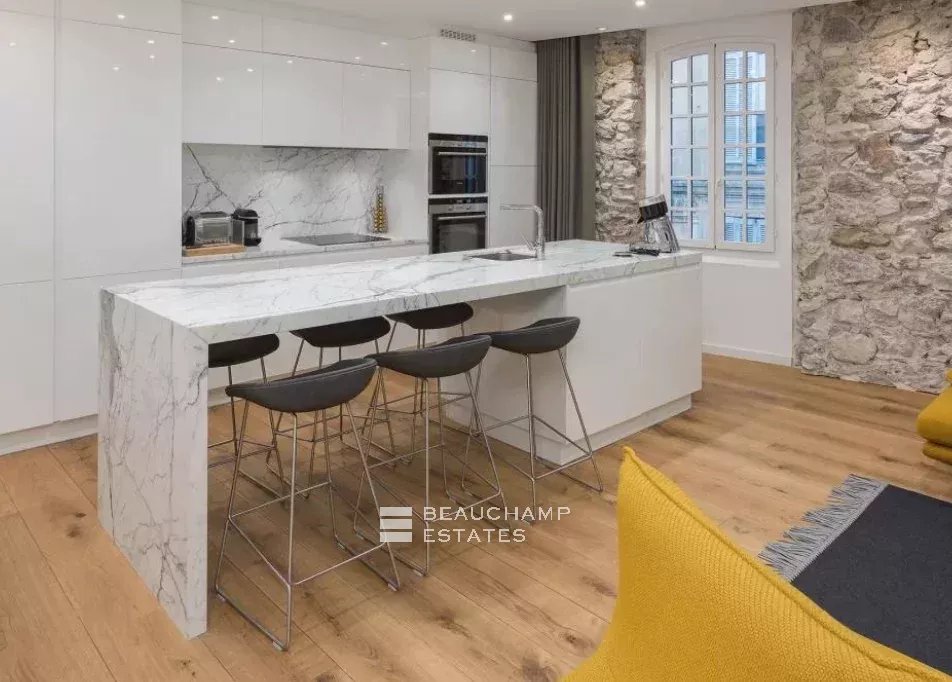 Close to the Old Port and Palais des Festivals, Forville market, in an old building with beautiful facades, charming, fully-renovated 103 m2 apartment.