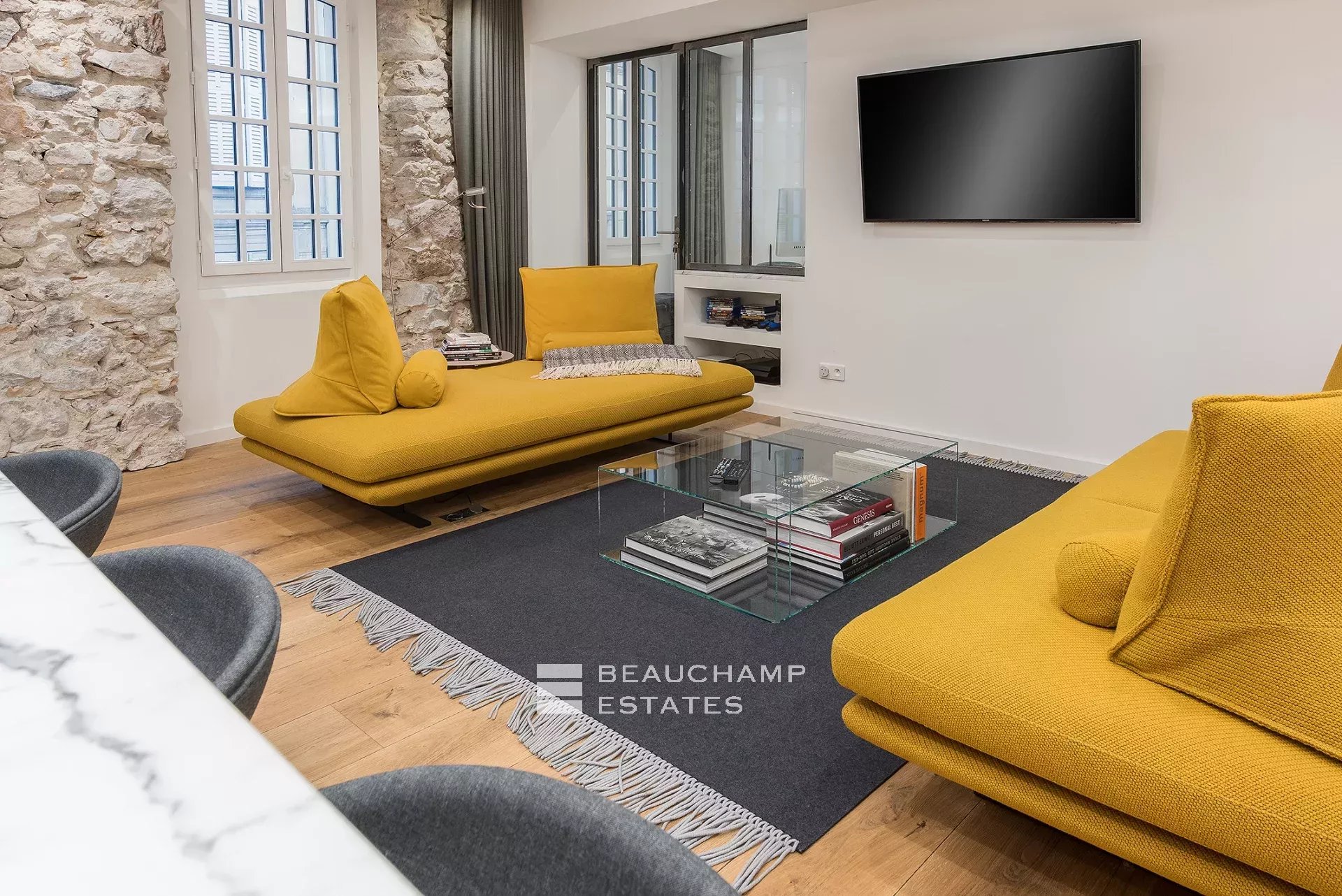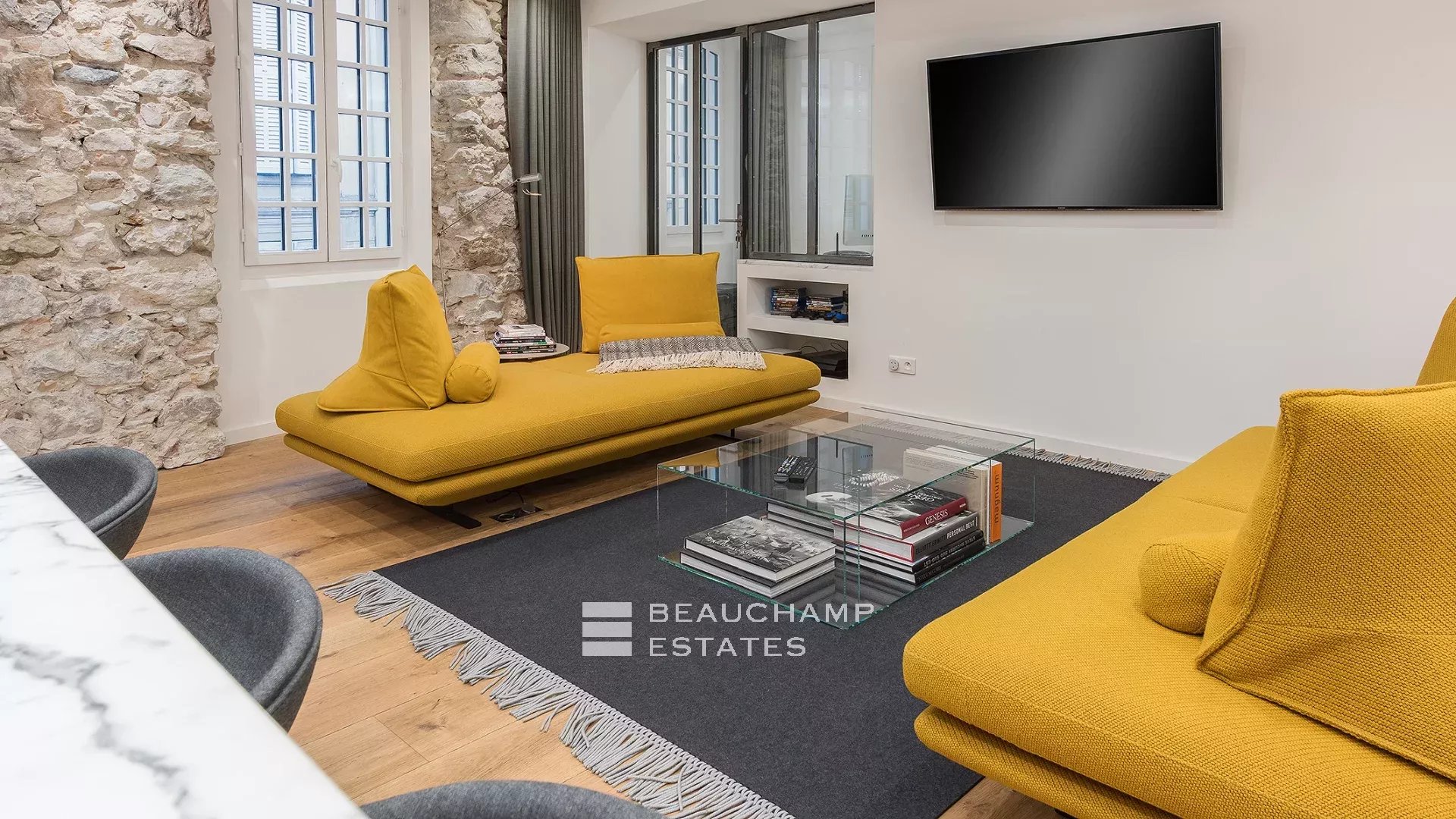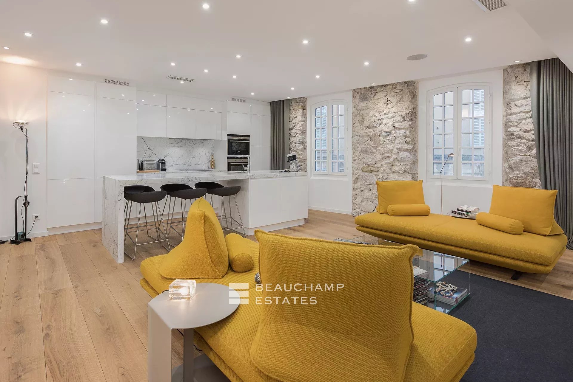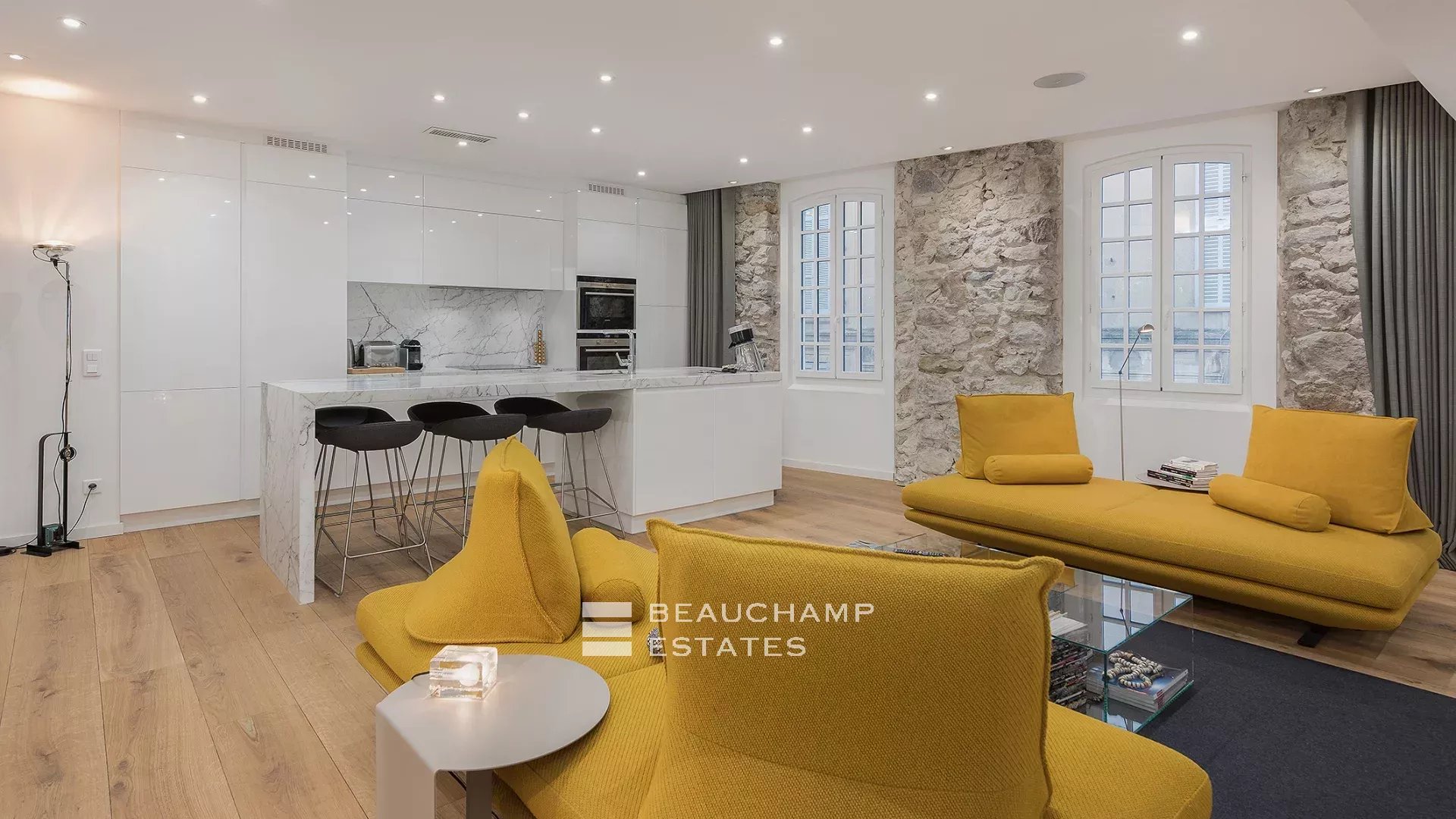 Close to the Old Port and Palais des Festivals, Forville market, in an old building with beautiful facades, charming, fully-renovated 103 m2 apartment.