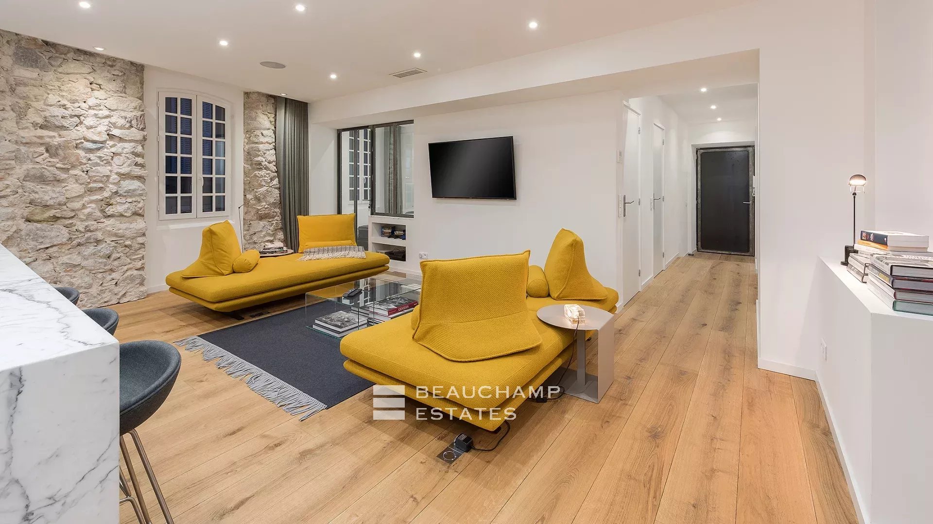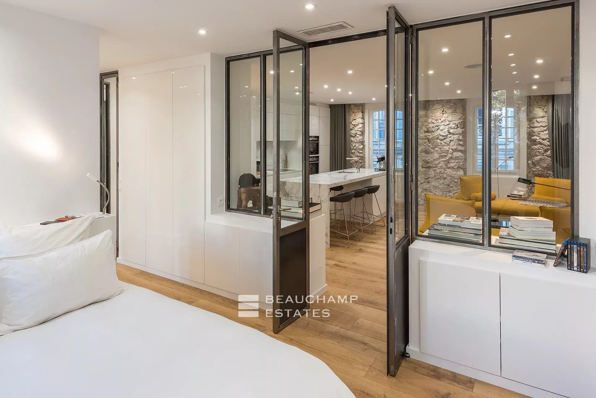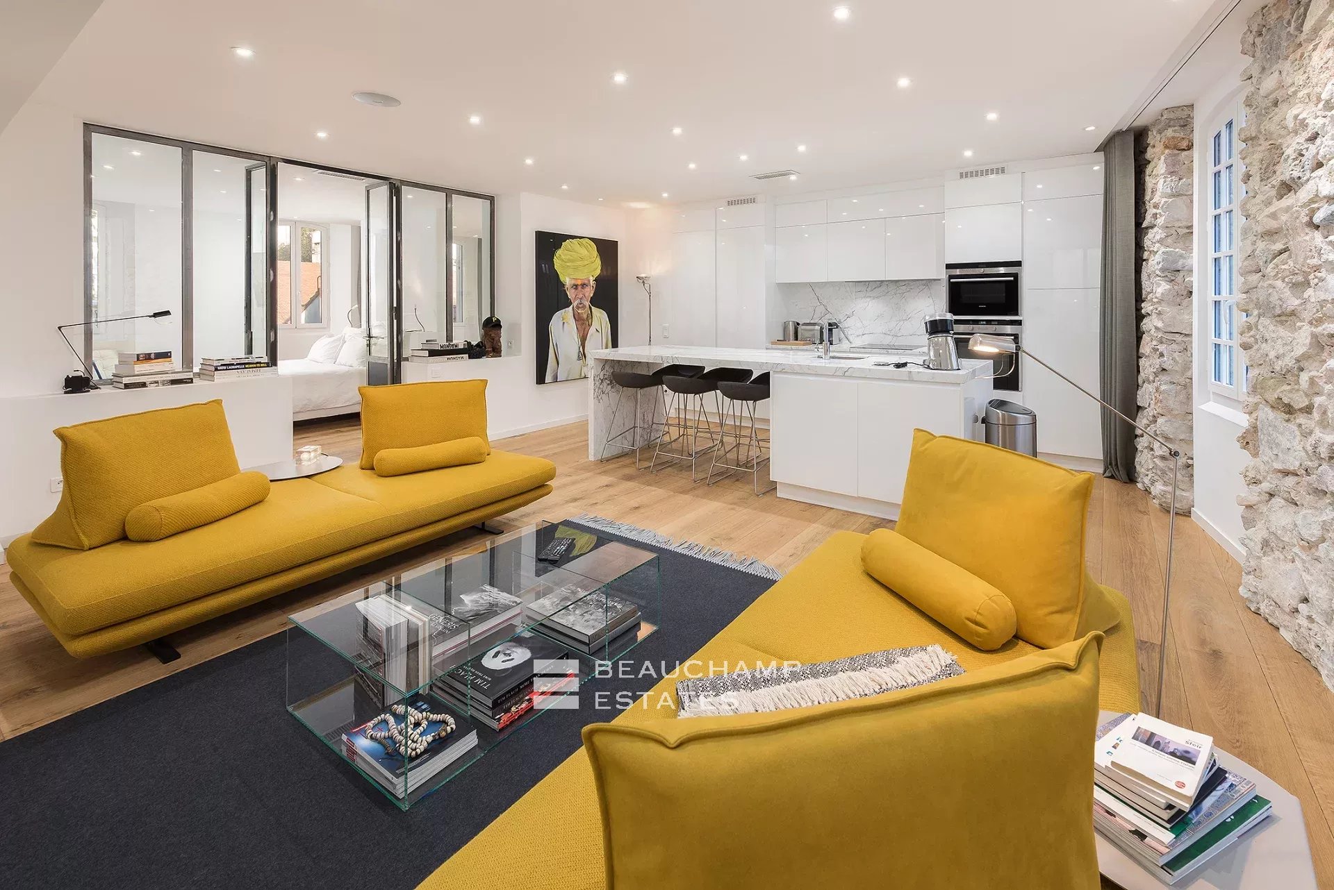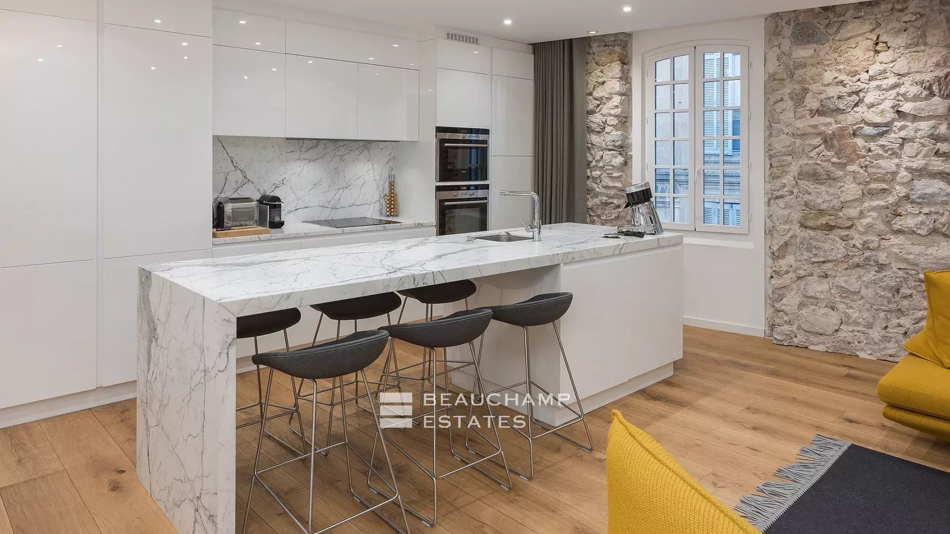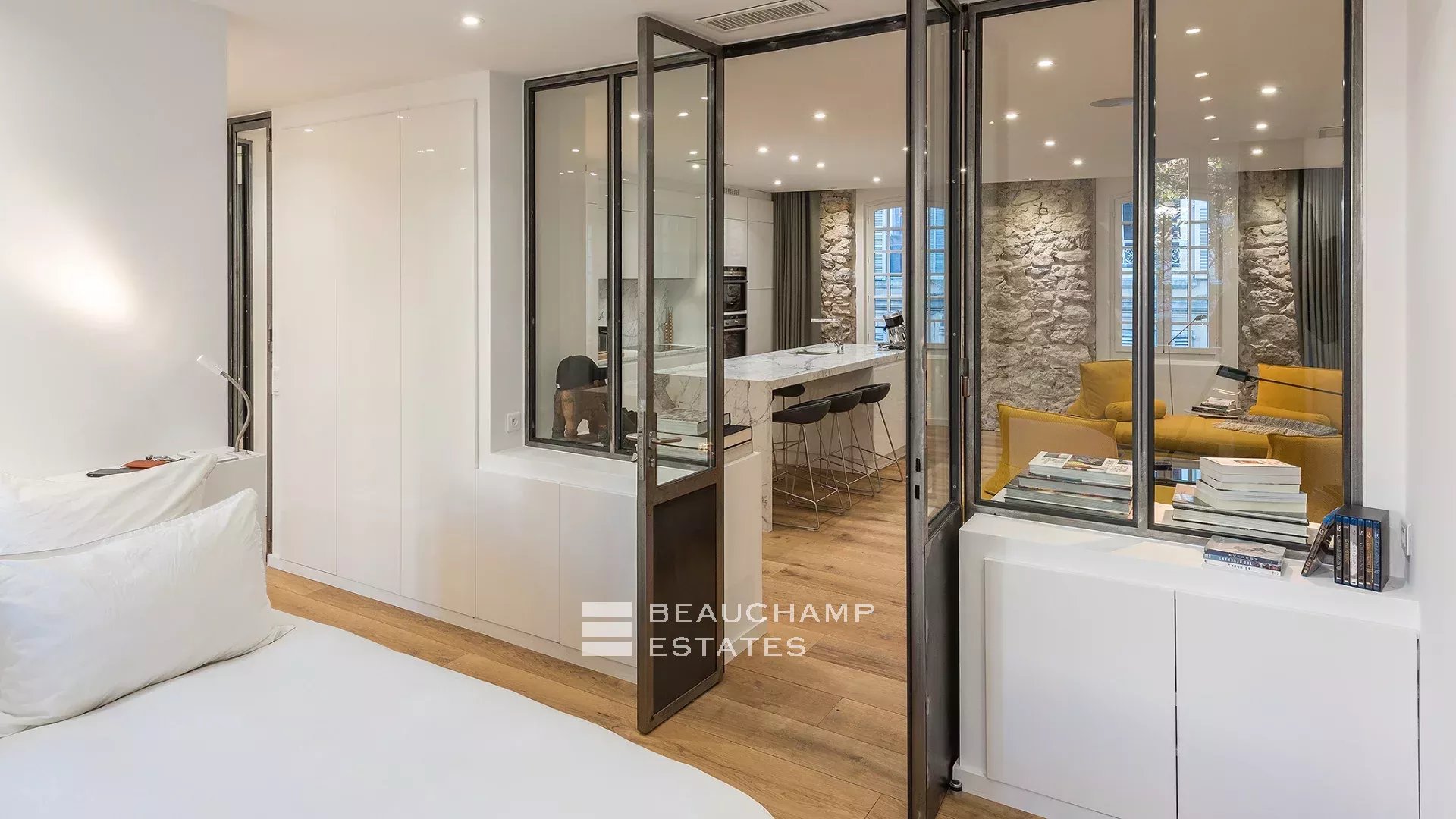Close to the Old Port and Palais des Festivals, Forville market, in an old building with beautiful facades, charming, fully-renovated 103 m2 apartment.