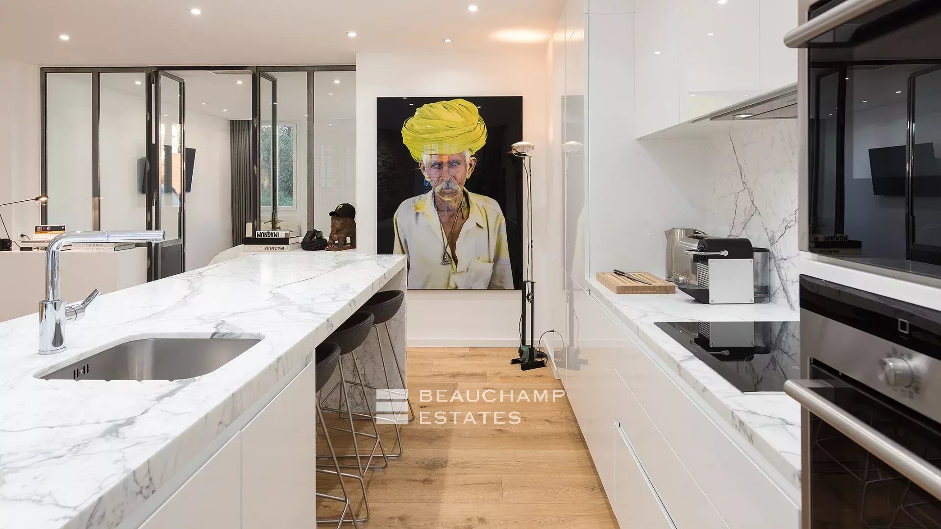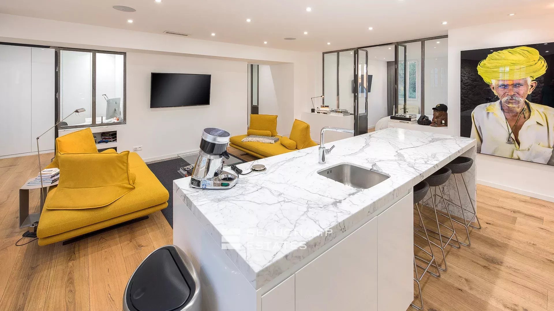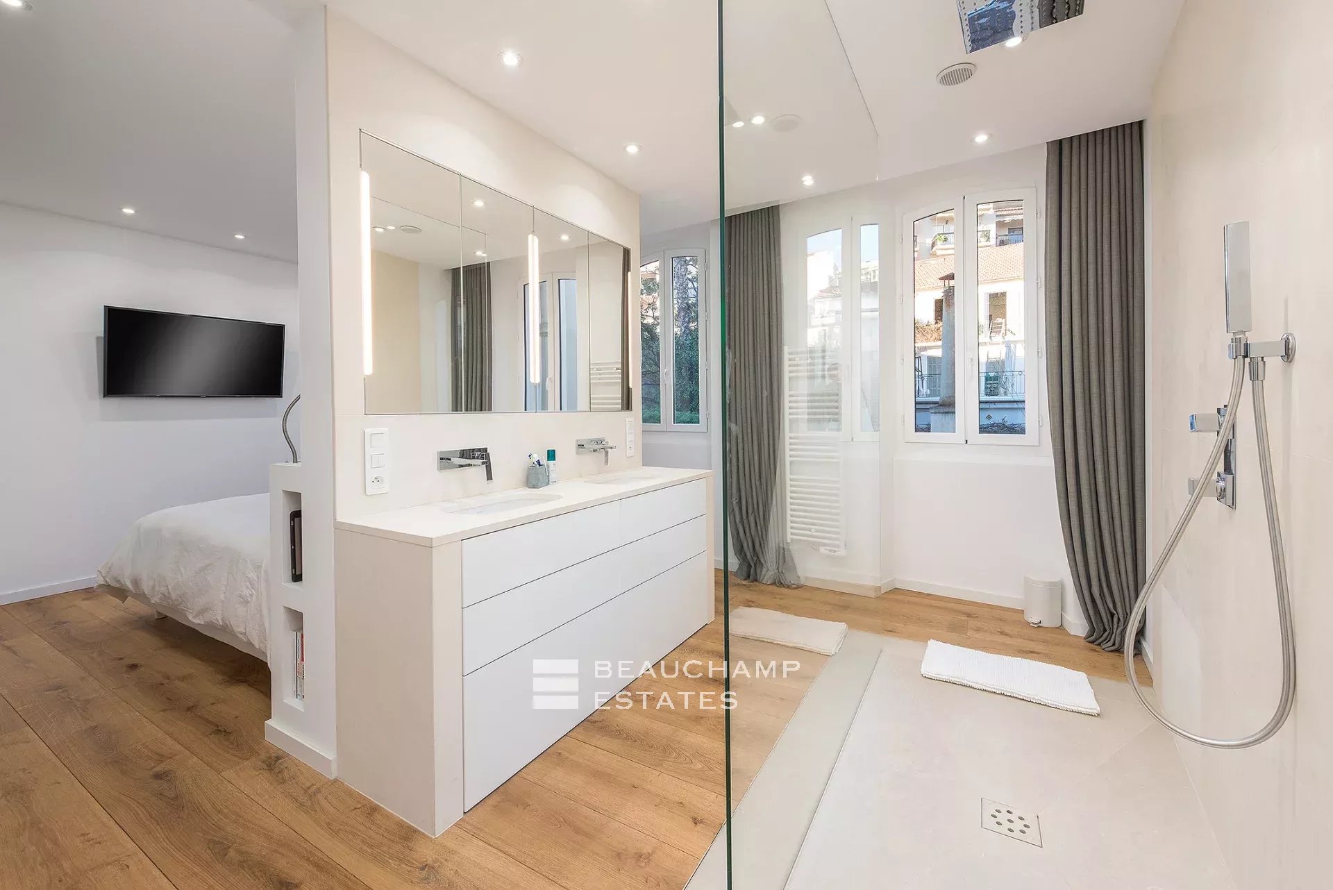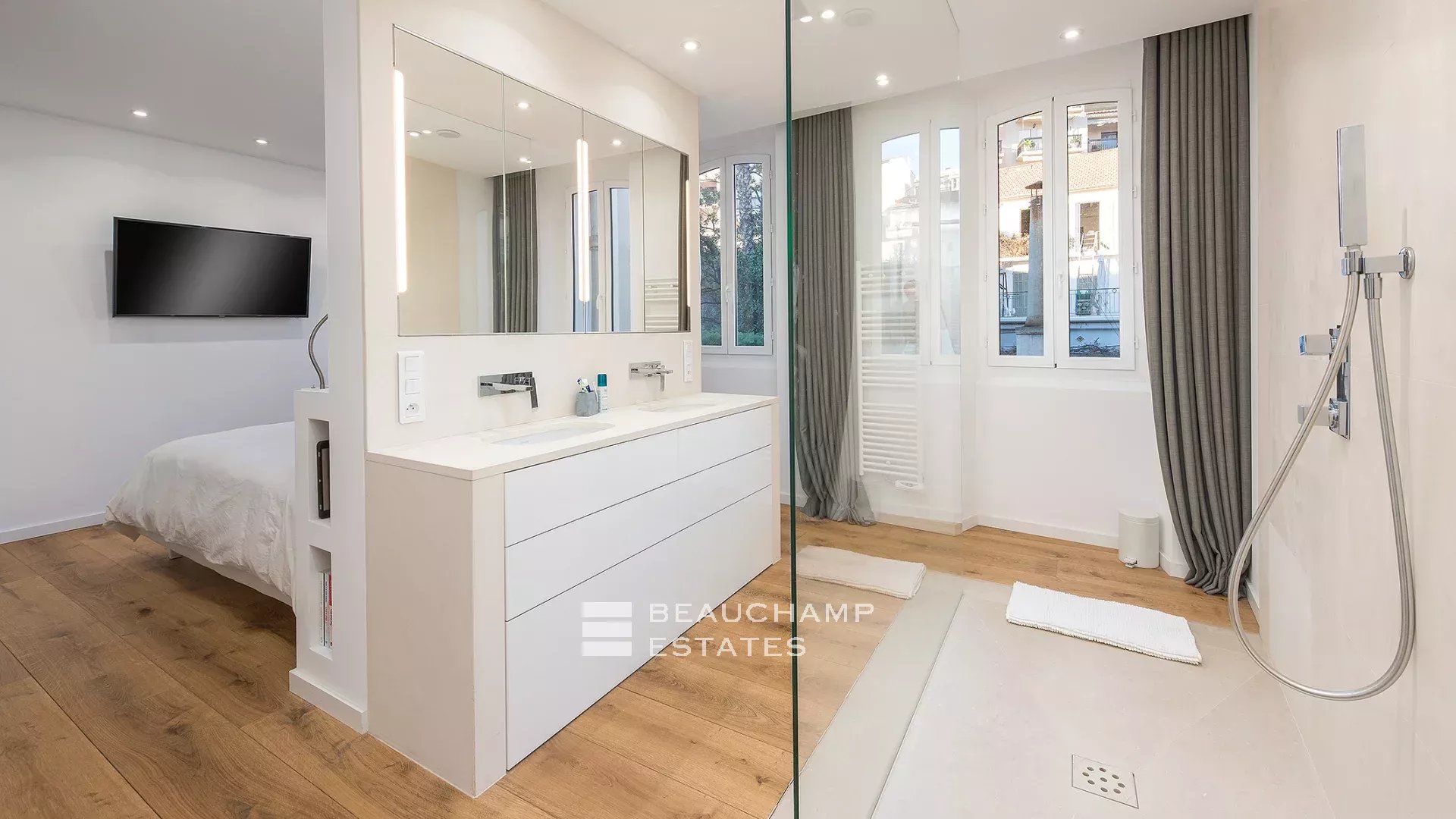 Close to the Old Port and Palais des Festivals, Forville market, in an old building with beautiful facades, charming, fully-renovated 103 m2 apartment.
