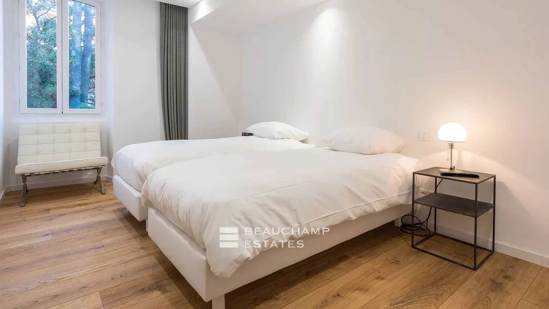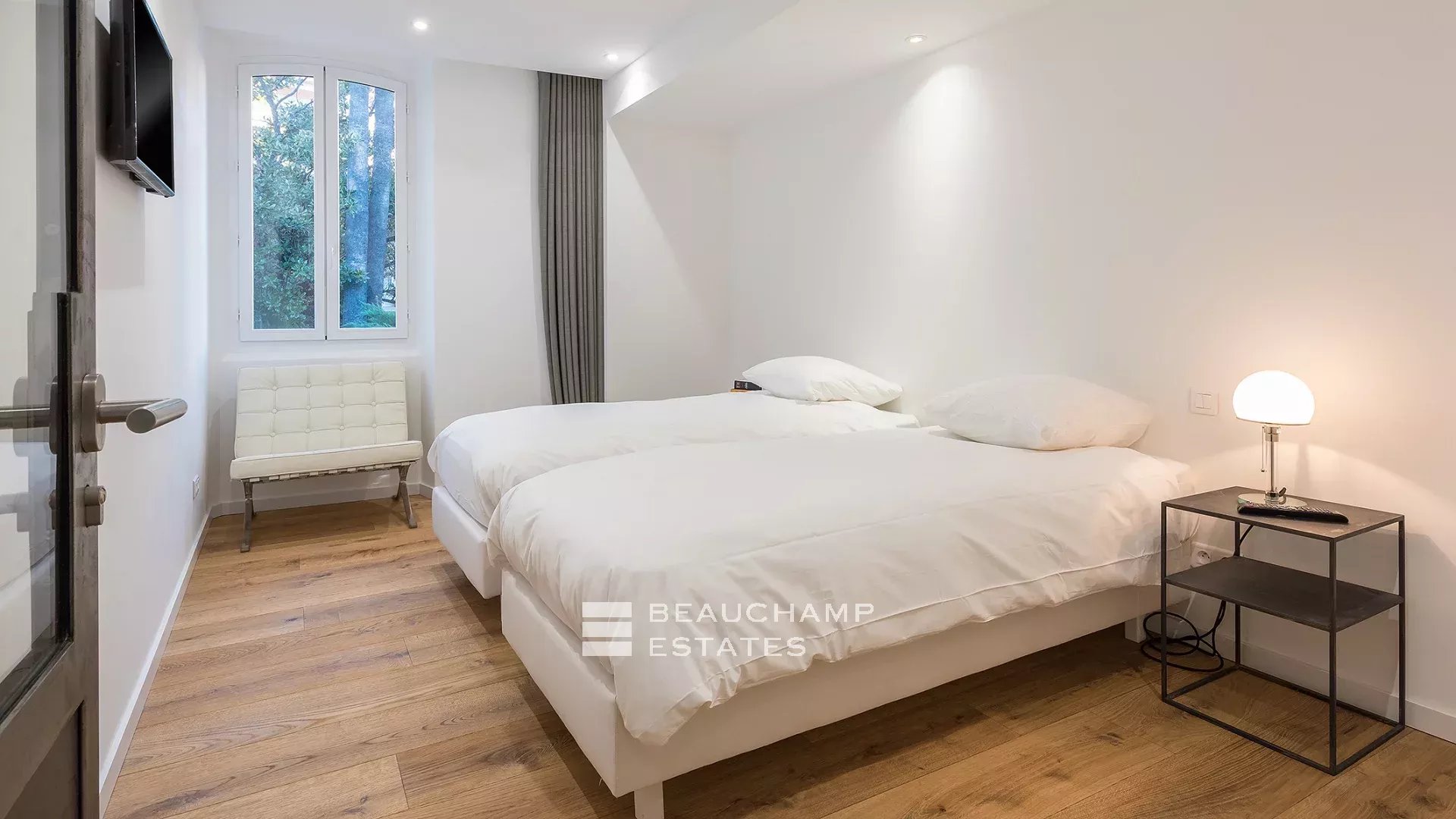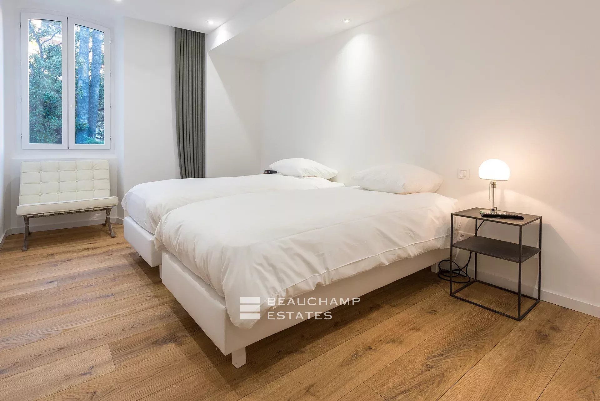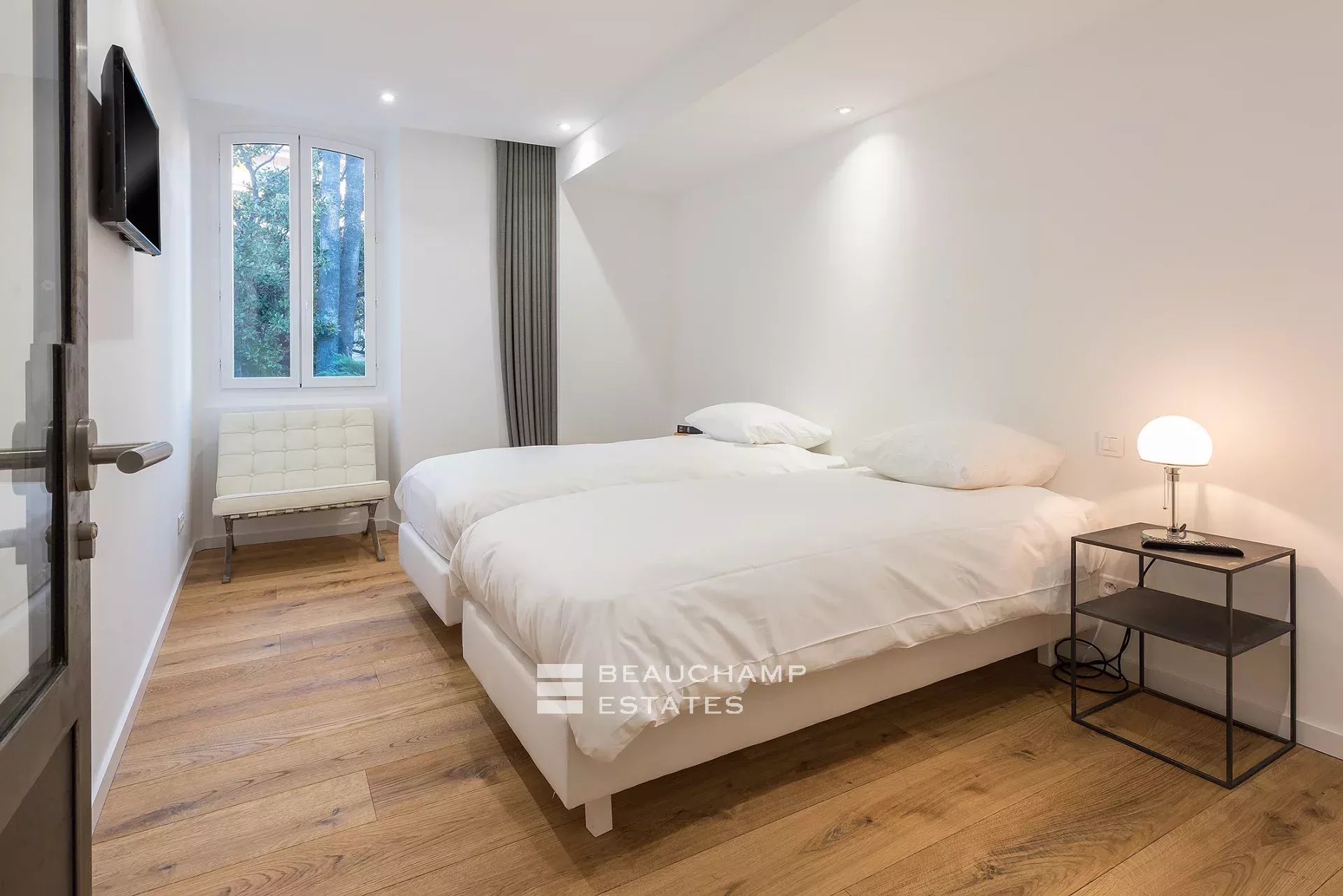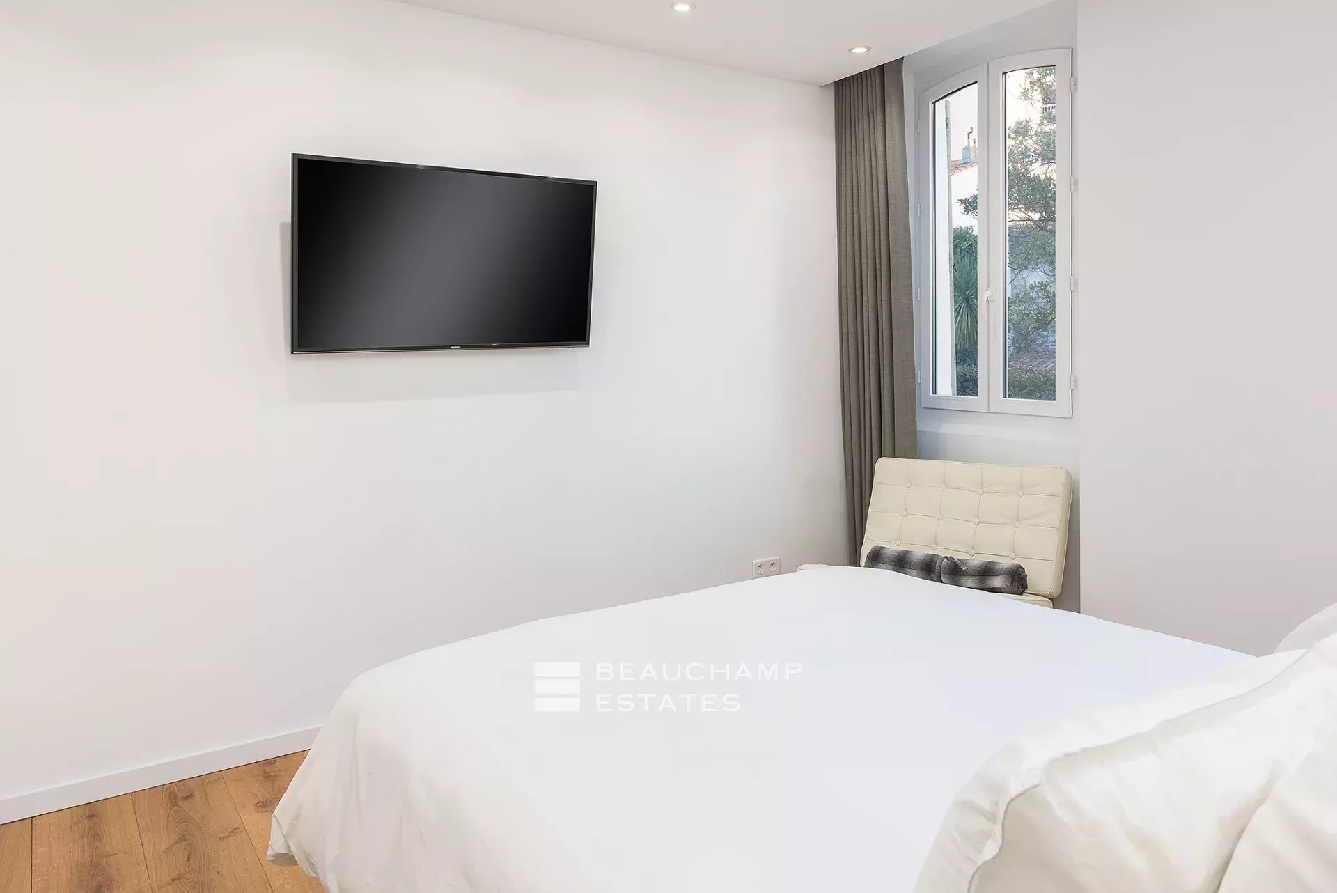 Entrance hall, living room with south-facing fitted kitchen, beautiful master bedroom with en-suite shower room and WC, fitted closets, quiet garden view. Two further bedrooms overlooking the garden, independent shower room, guest WC. A study.