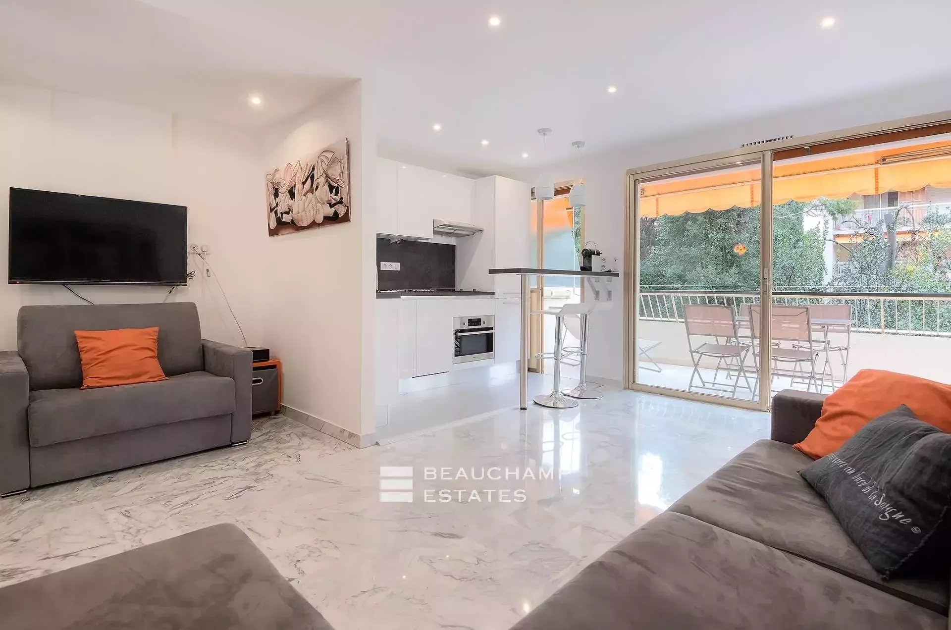 This modern studio apartment has been entirely renovated with contemporary decor and features a sunny terrace. It is situated behind the Martinez hotel, only minutes away from the Croisette and a 19 minute walk to the Palais. It consists of :