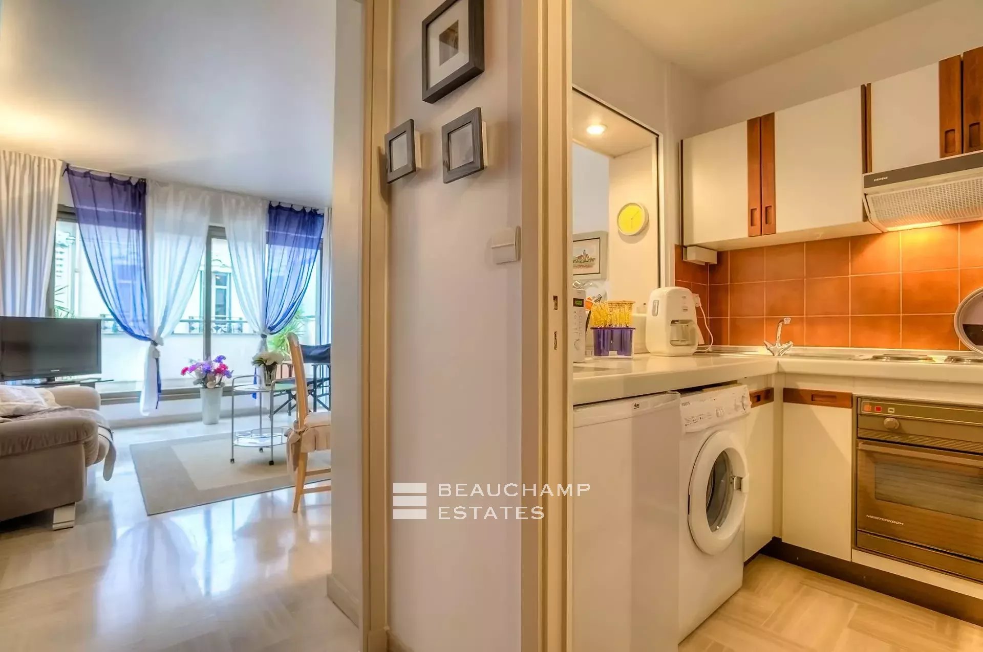 Nice studio apartment located within 5 minutes walk to the Palais des Festivals in a luxurious residence and enjoys a terrace. It is comprised of :