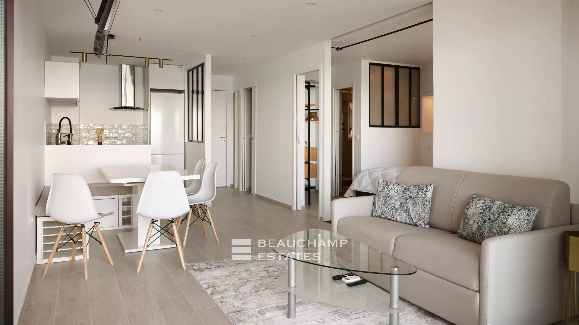 It features an entrance, a living room opening onto the terrace, a fully equipped open kitchen, and a bedroom with an en-suite shower room.