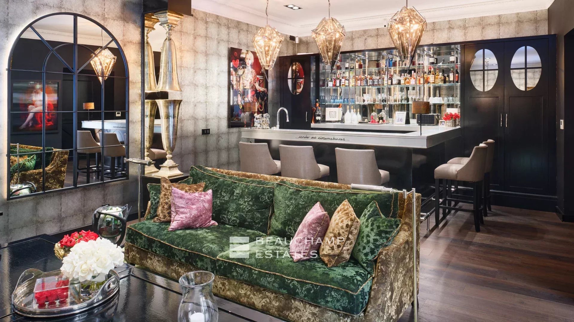 On the ground floor, it comprises a beautiful entrance hall, a living room with a superb zinc bar, a fitted kitchen and a utility room.