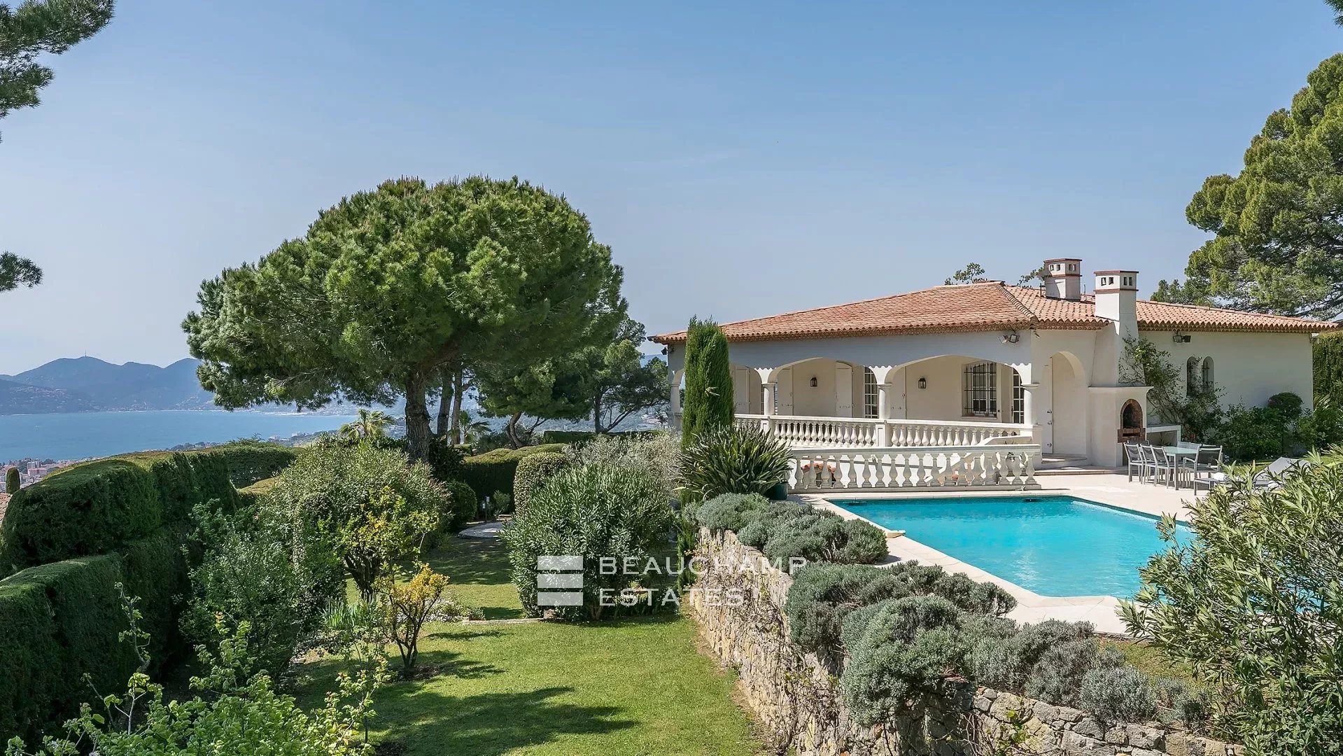 There is a large living/dining room with sea view and a delightful mature garden with palm trees and lawn with views to the Cap d’Antibes and the Esterel hills.