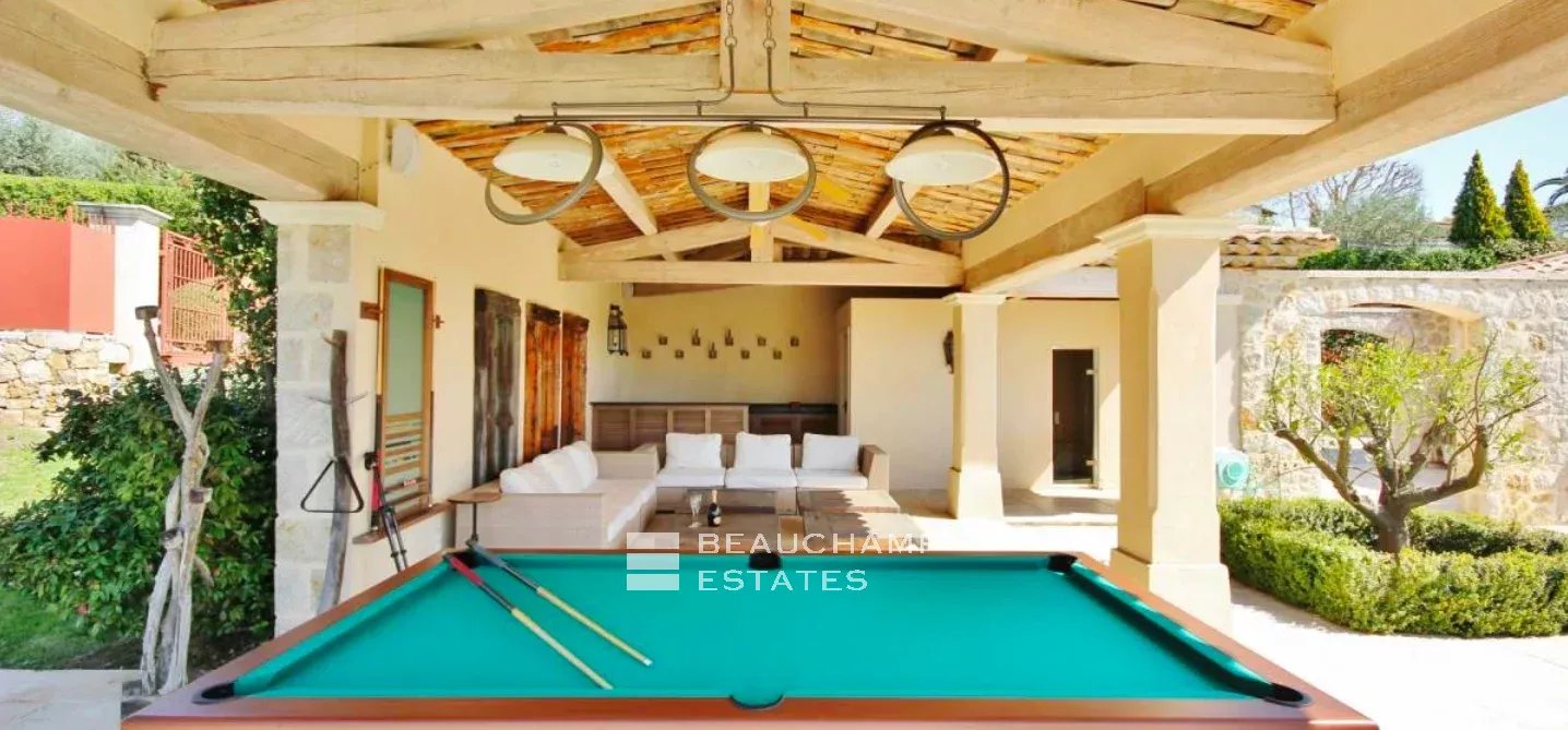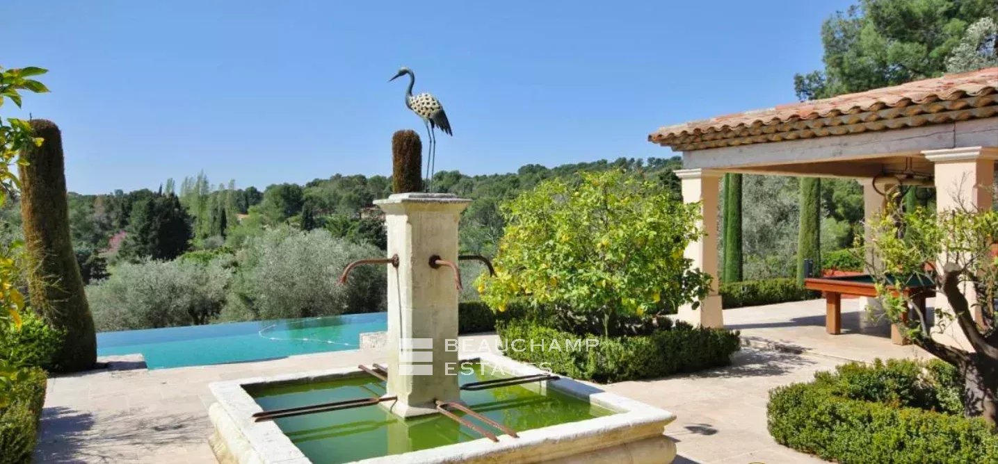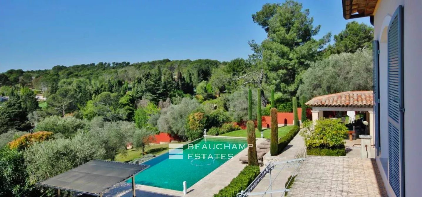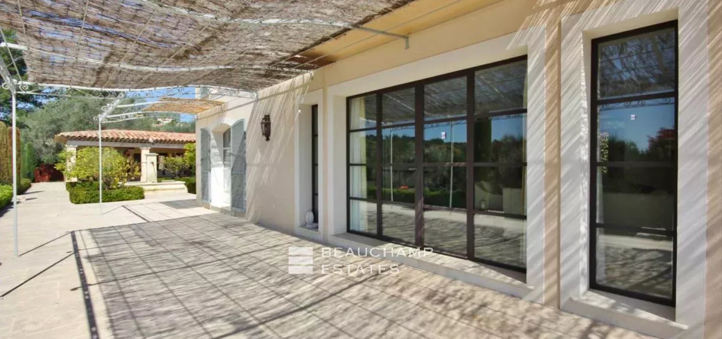 Castellaras, 5 bedroom villa, peaceful with open views and location close to international schools. Luminous living area of 310 sqm set on landscaped grounds of 6100 sqm with swimming pool. On the ground floor: living rooms, kitchen, guest bedroom with en-suite bathroom, office. Upstairs: master bedroom suite with dressing room, three guest bedrooms with en-suite shower room. Basement: service quarters and laundry room. In addition: XL pool house with summer kitchen, double garage, fitness room, hammam.