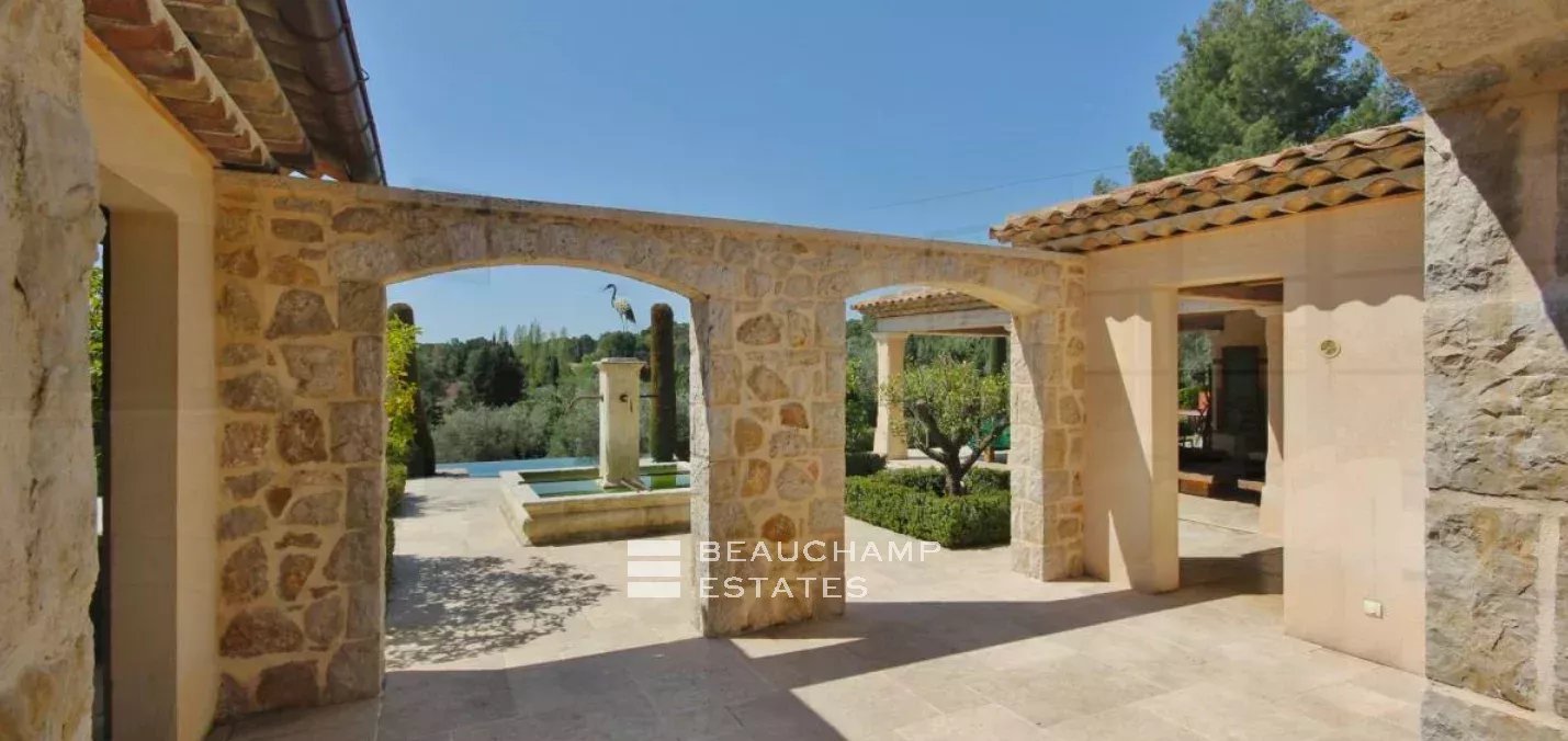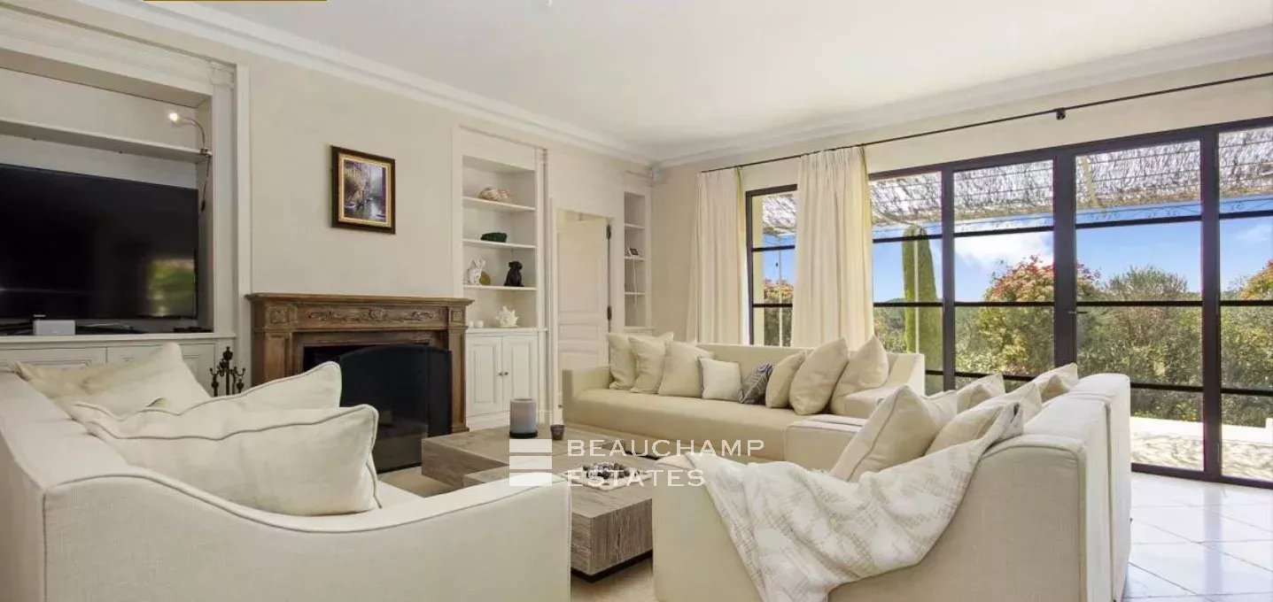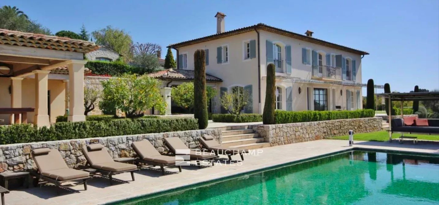 Castellaras, 5 bedroom villa, peaceful with open views and location close to international schools. Luminous living area of 310 sqm set on landscaped grounds of 6100 sqm with swimming pool. On the ground floor: living rooms, kitchen, guest bedroom with en-suite bathroom, office. Upstairs: master bedroom suite with dressing room, three guest bedrooms with en-suite shower room. Basement: service quarters and laundry room. In addition: XL pool house with summer kitchen, double garage, fitness room, hammam.
