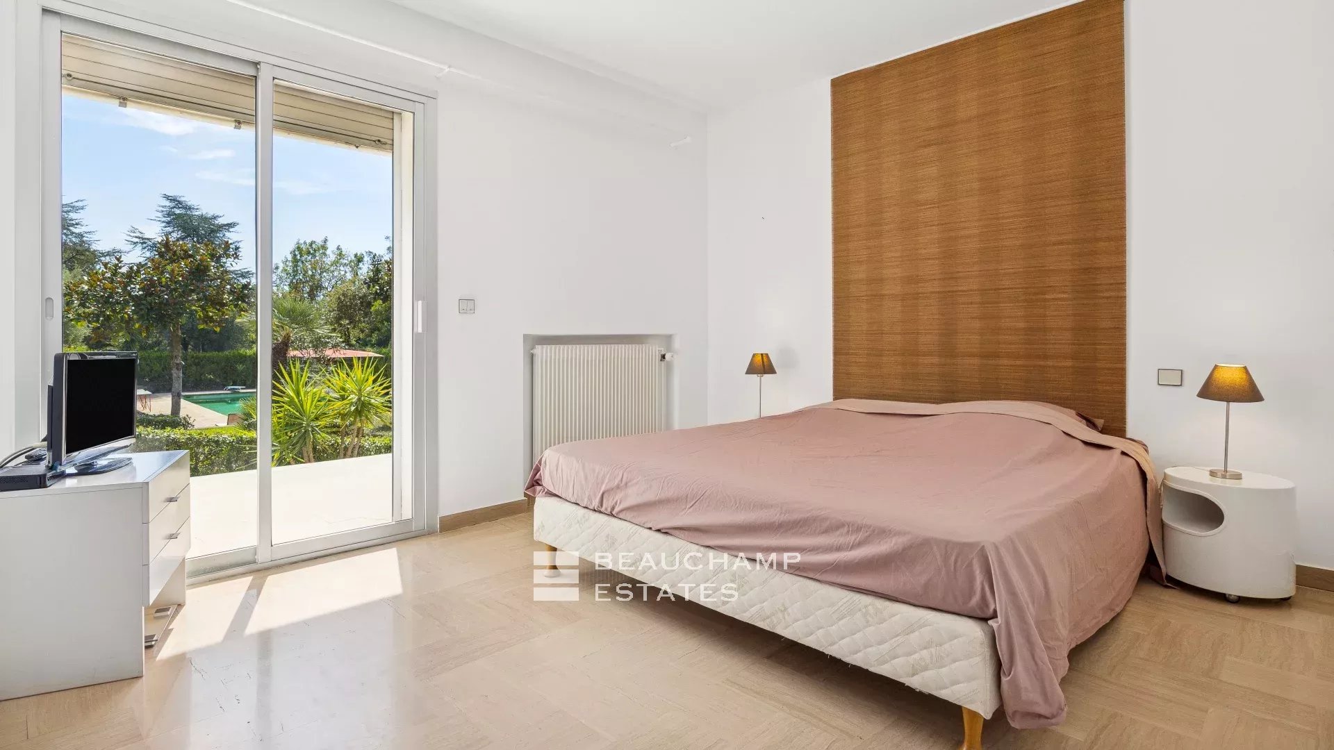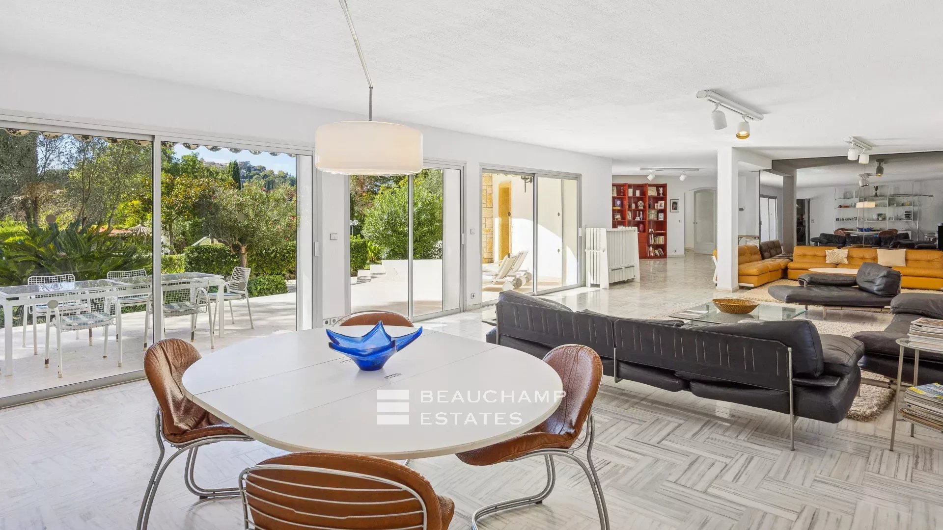 Nestled in a peaceful and sought-after residential area, this elegant 415 sqm villa in Mougins sits on a beautifully landscaped plot of 6,445 sqm with views over the village of Mougins.