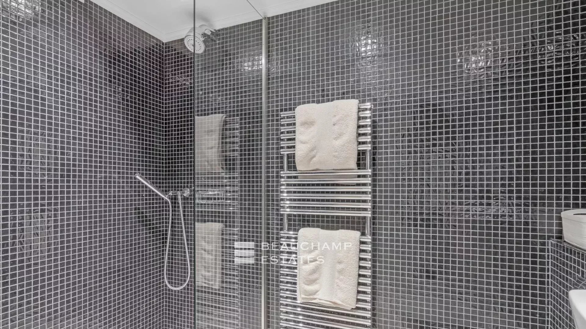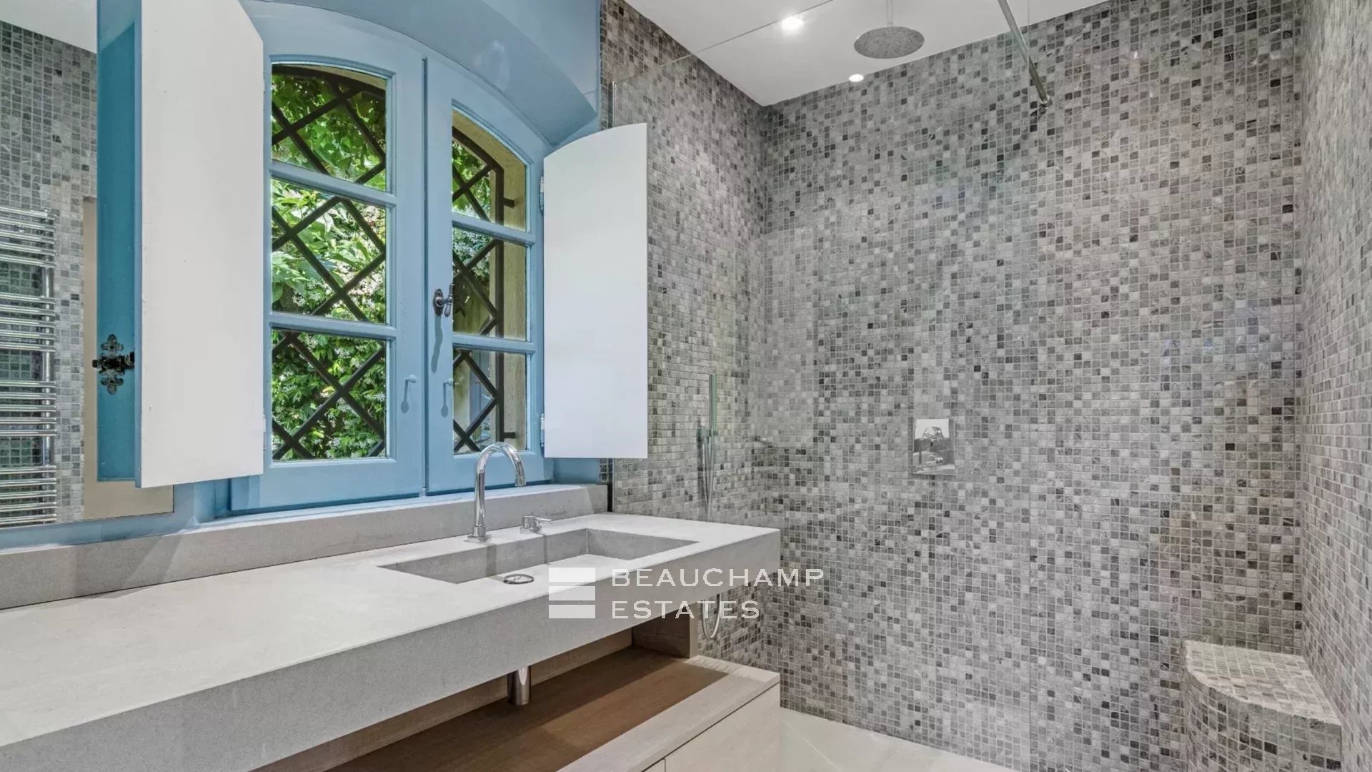 The landscaped garden of over 4,000 sqm features a large 17-metre heated swimming pool, perfect for making the most of summer days. Designed areas around the pool, an outdoor lounge, and a barbecue provide the perfect setting for relaxing and sharing convivial moments in complete privacy.