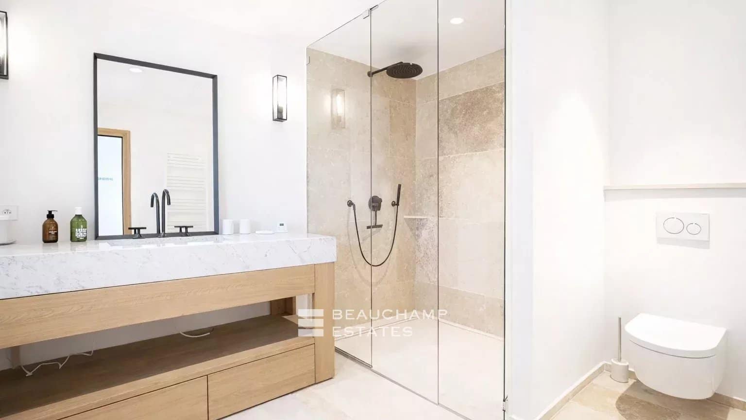 This brand-new villa boasts luxurious finishes and six spacious suites, each with its own private bathroom and WC. The bright living area opens onto a TV lounge and a fully equipped high-end kitchen. Large bay windows create a seamless transition between the indoors and outdoors. An elegant entrance leads to a guest WC and a laundry room. A large garage completes this exceptional property.