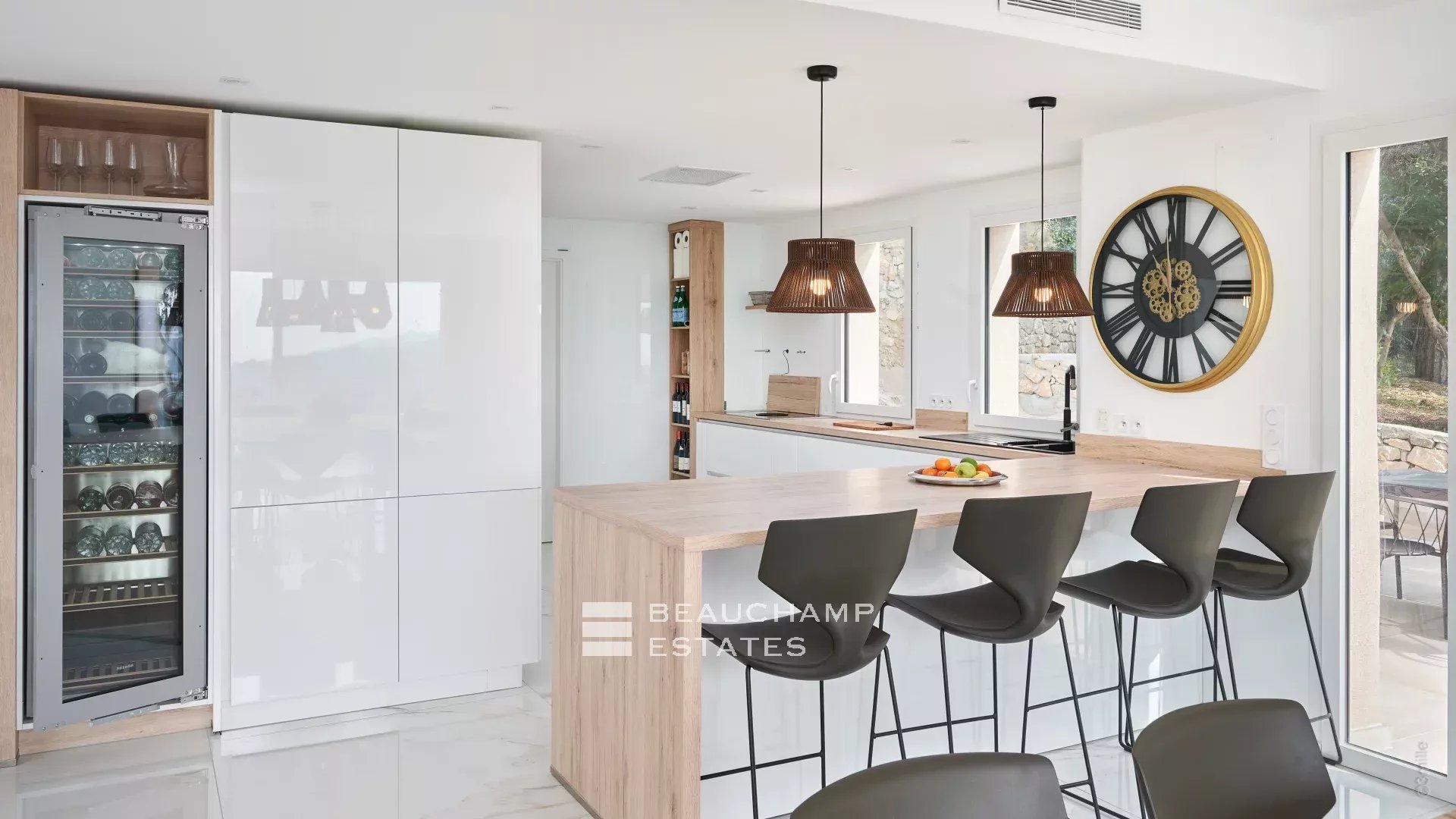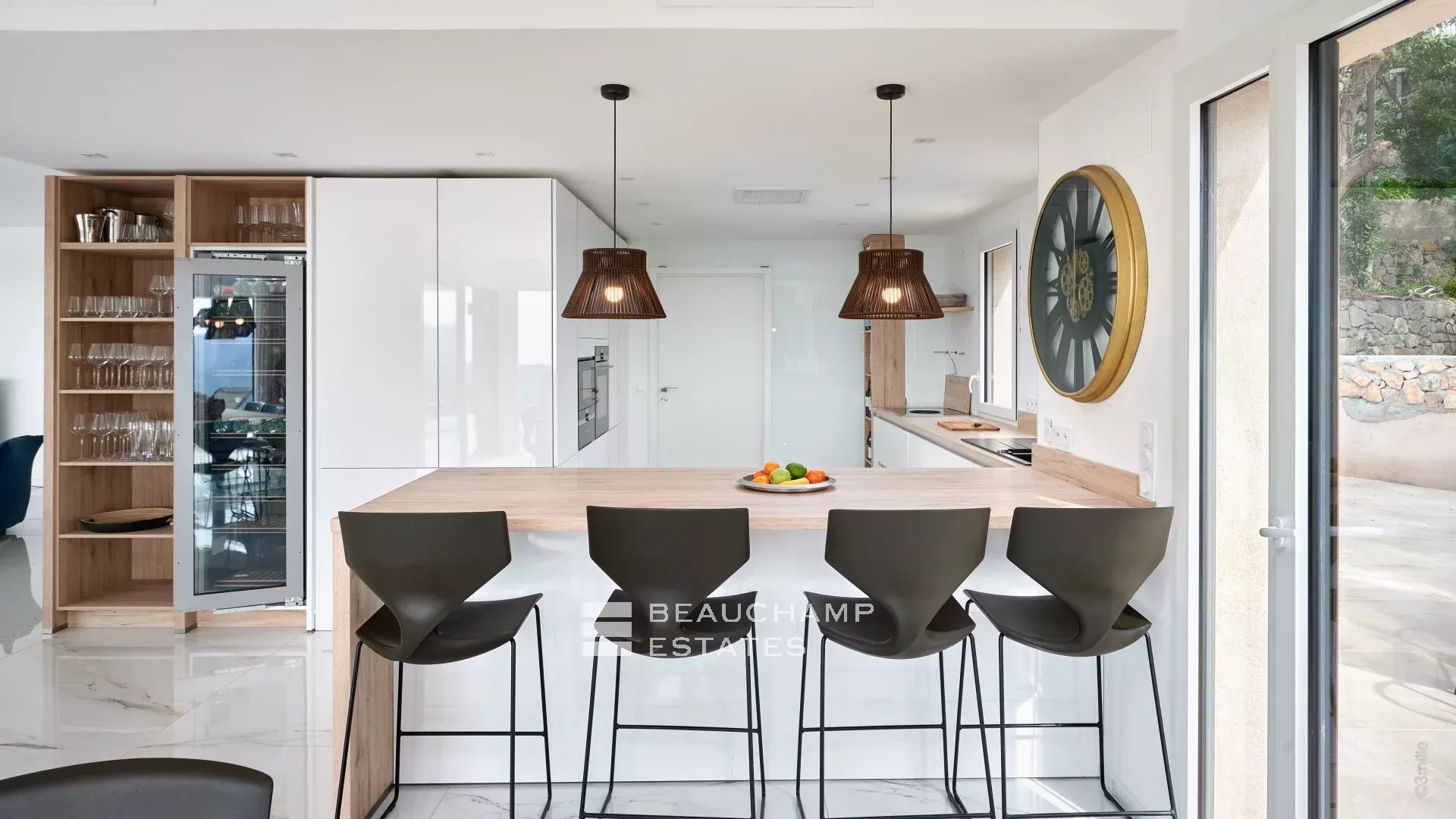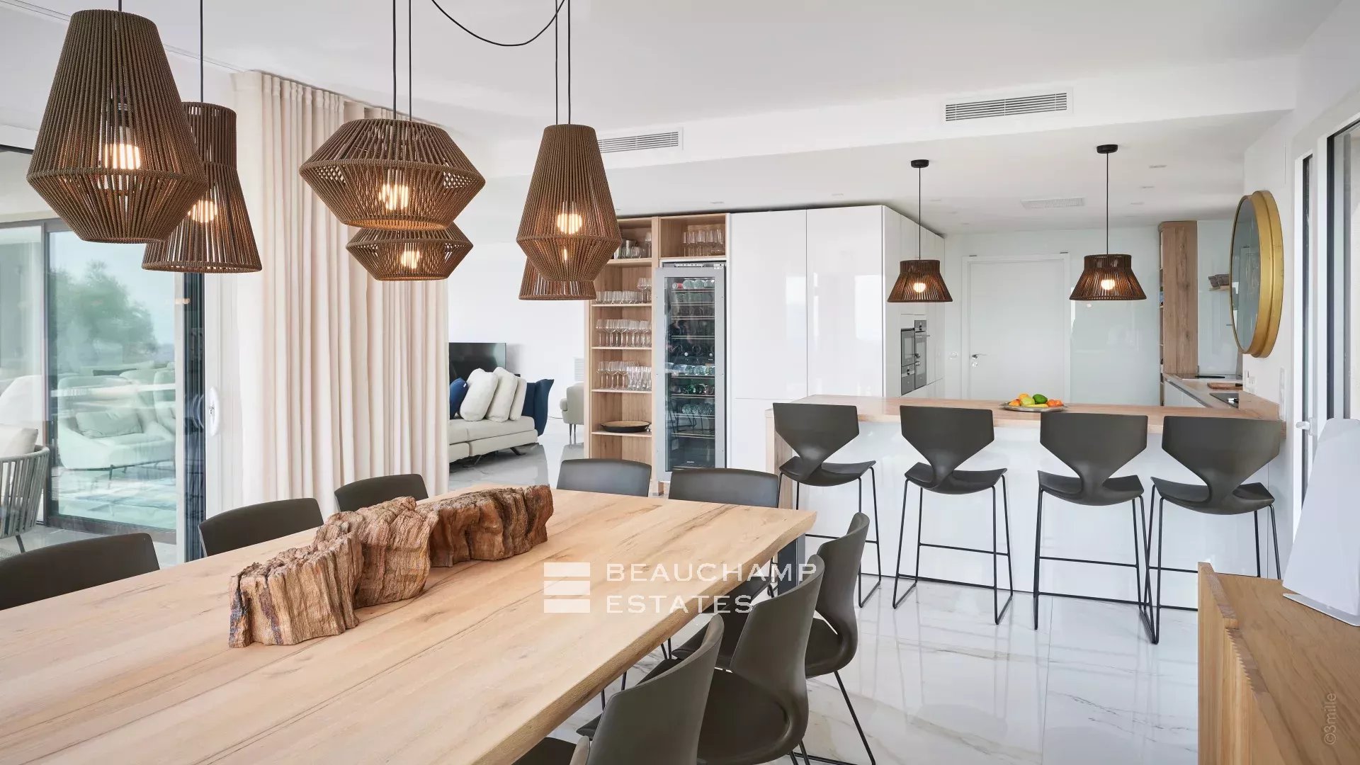 - Dining space and a fully equipped open kitchen (with a wall-mounted wine cellar)
