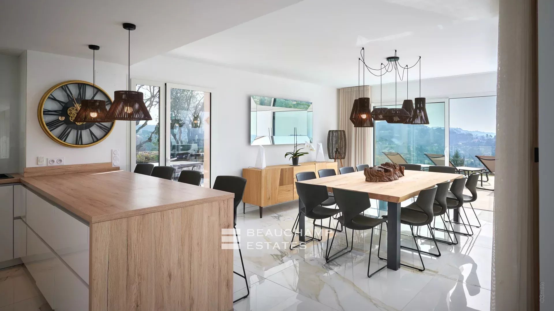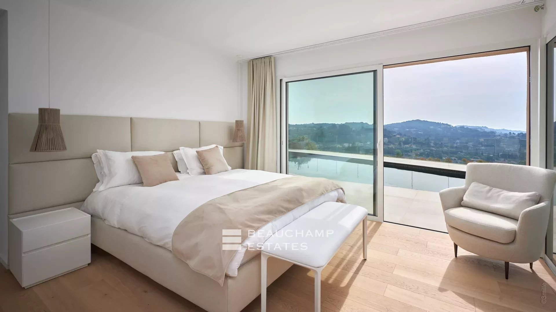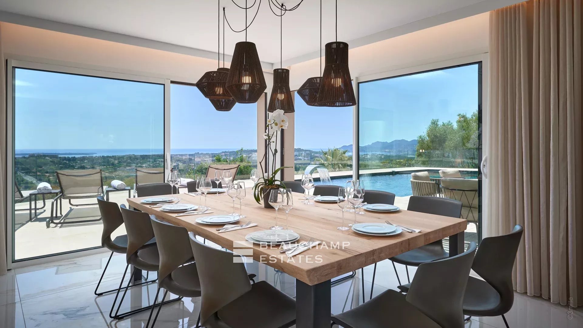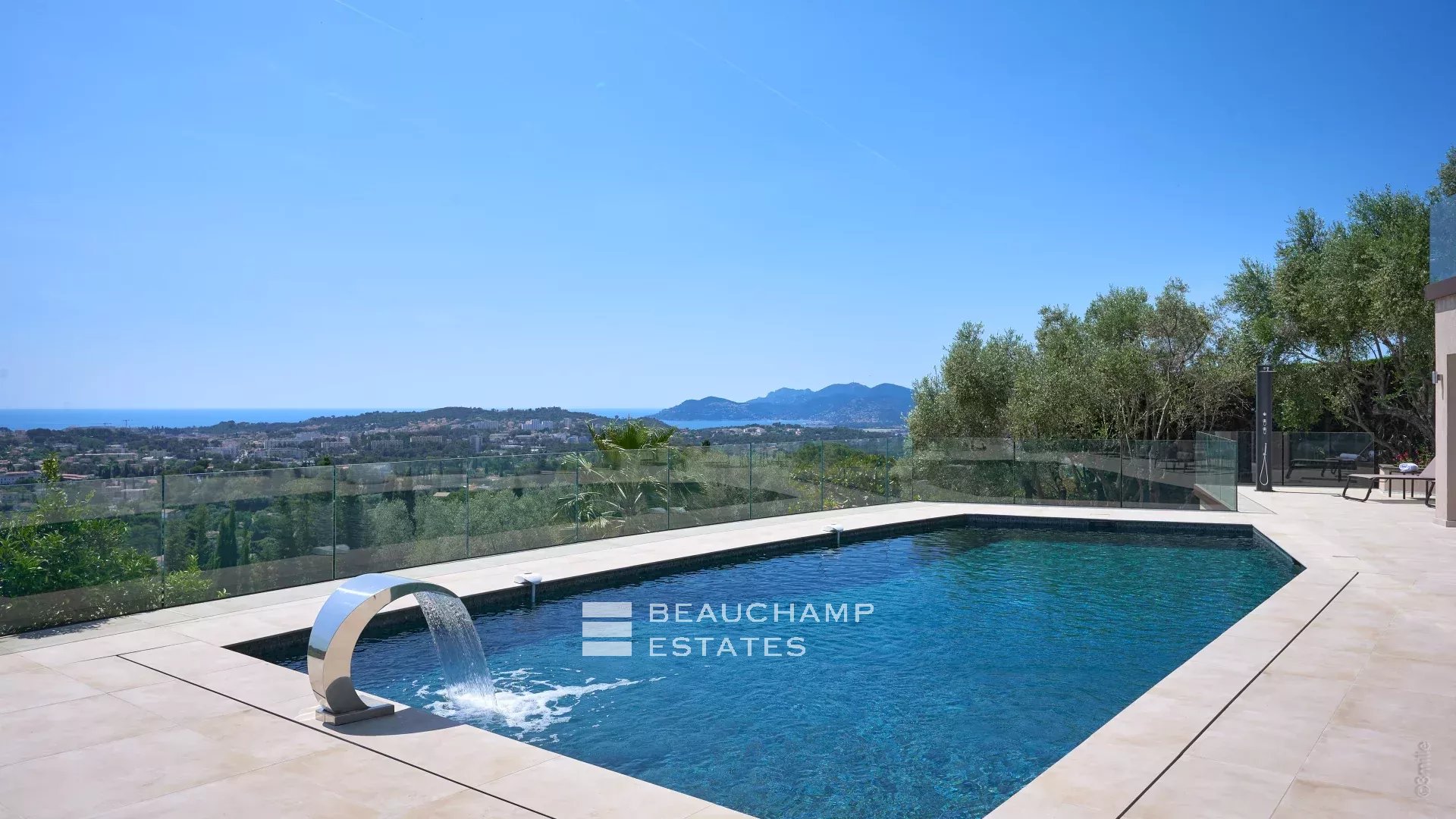Just a few steps away from the historic village of Mougins, this contemporary villa spans 600 m2 across three meticulously organized levels, offering panoramic sea views.