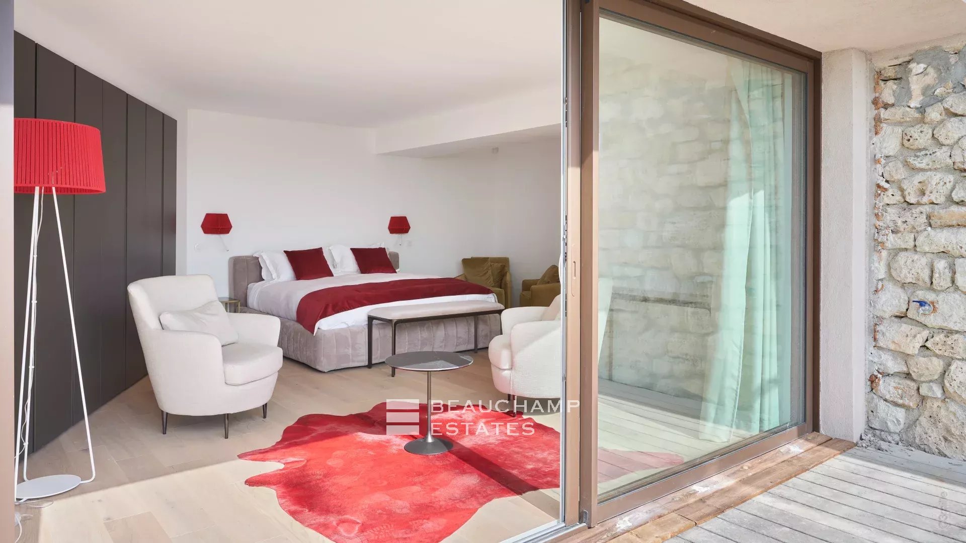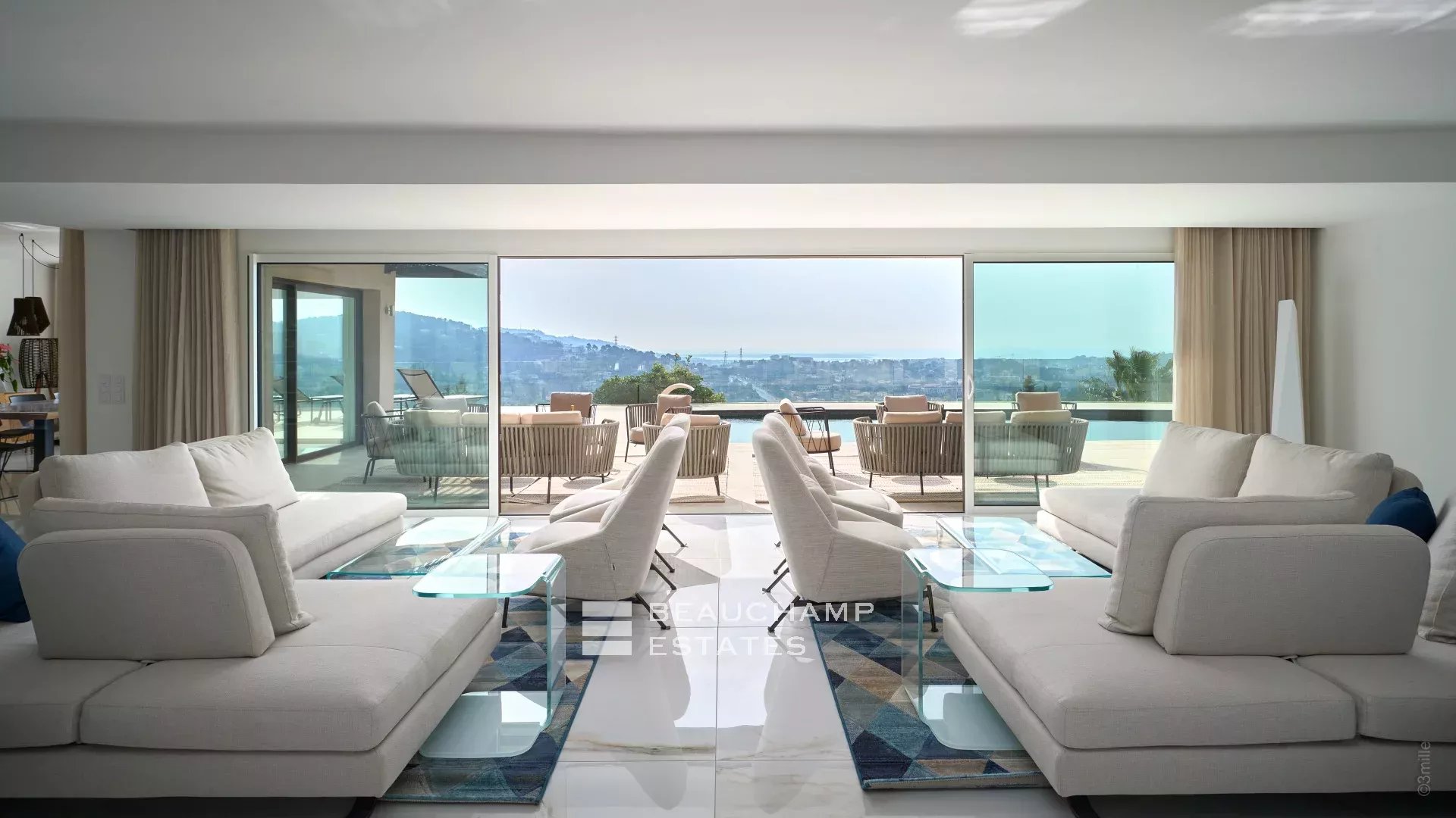 - A bright and spacious reception room facing the pool with sea and garden views, comprising a comfortable living area