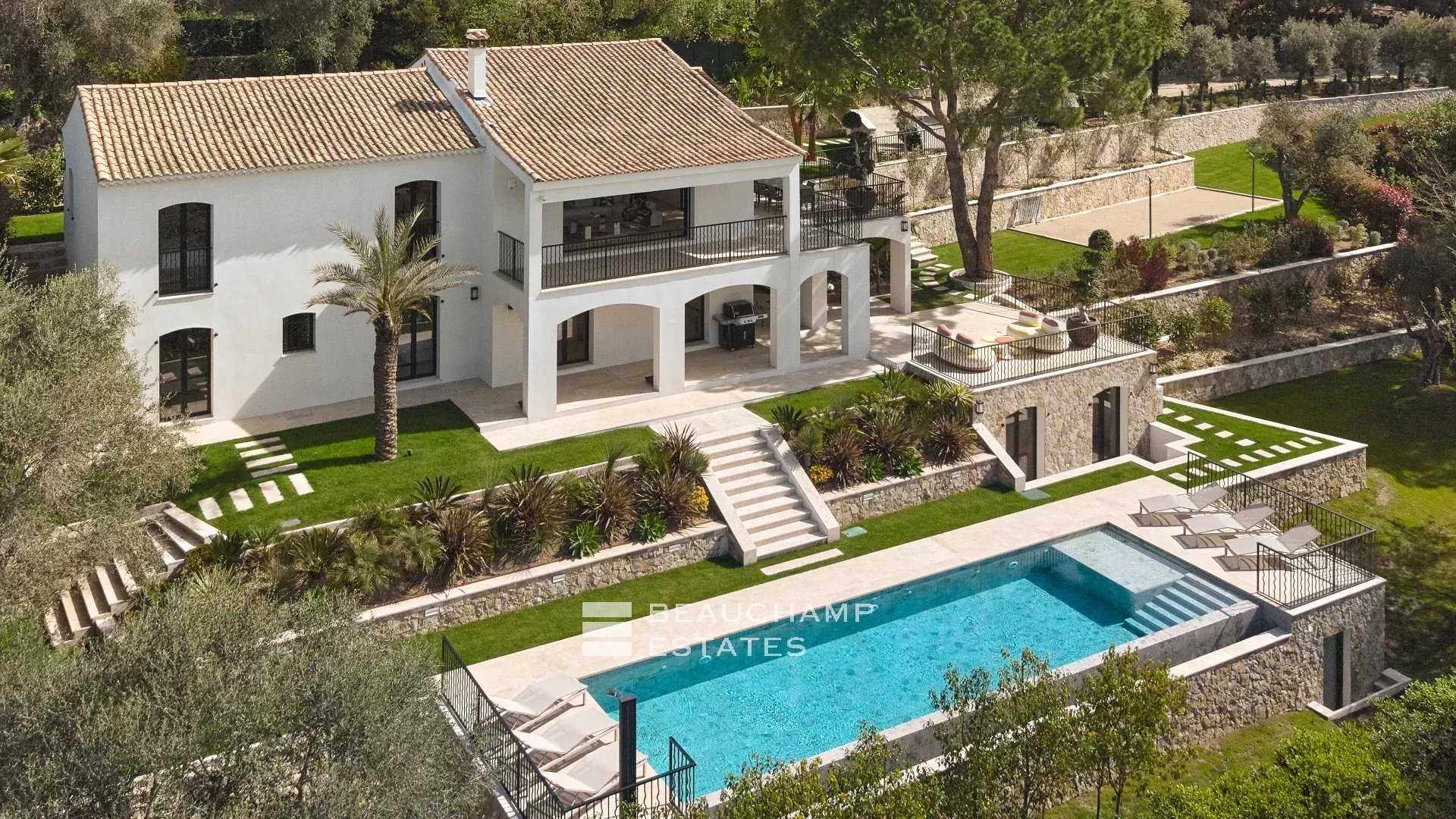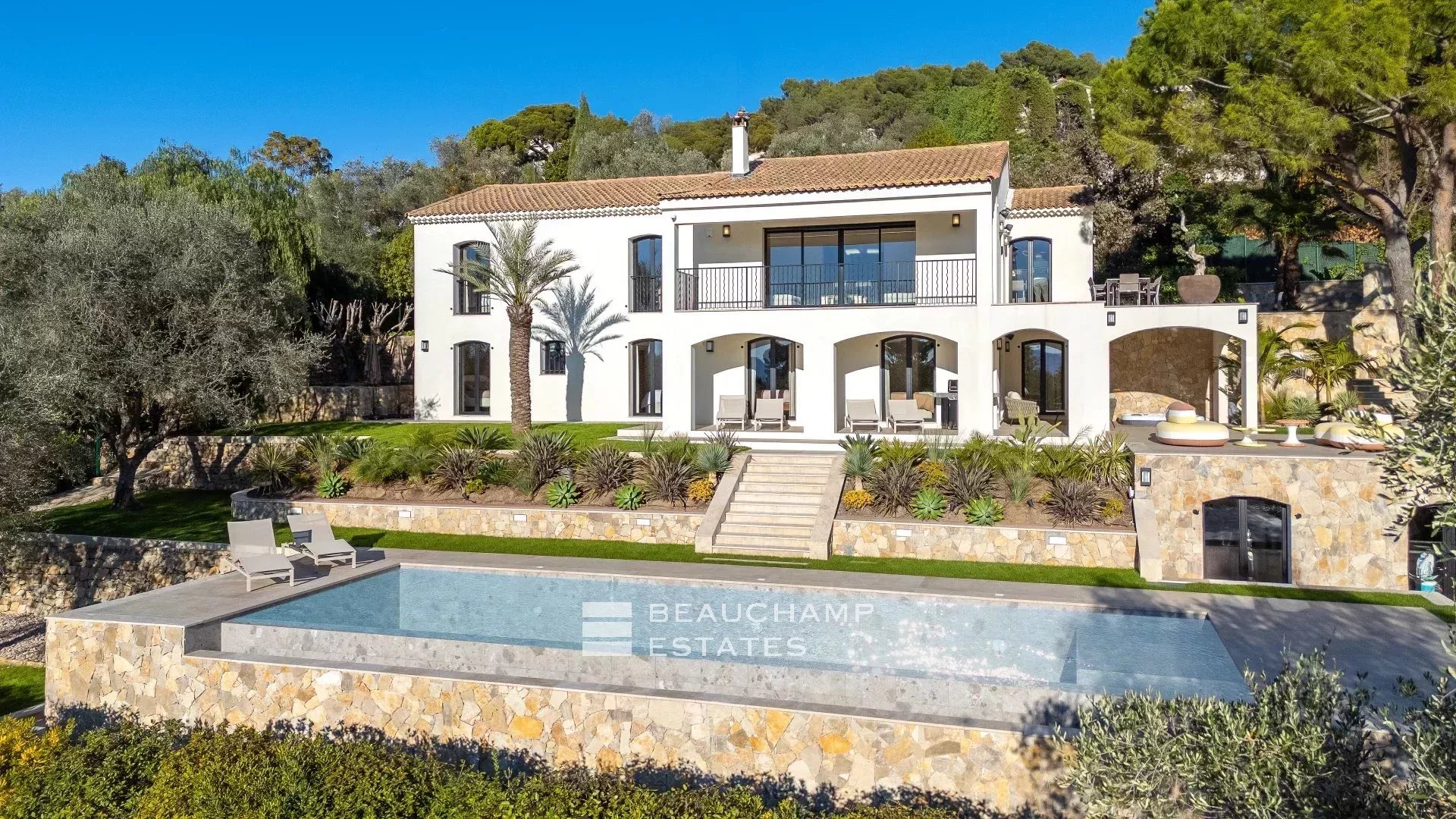 Located on the hills of Le Cannet, in a peaceful setting surrounded by greenery, this contemporary villa of approximately 280 sqm has been fully renovated with high-quality materials and offers glimpses of the sea.
