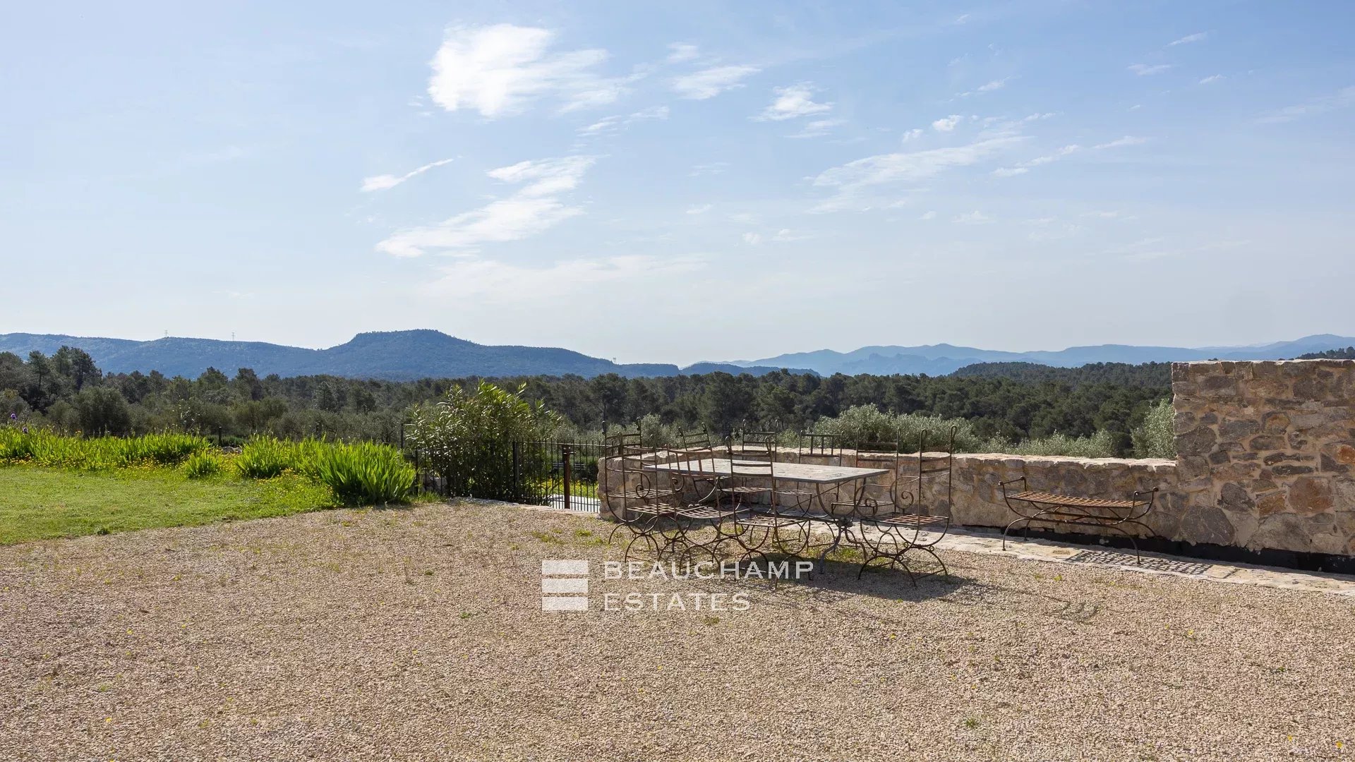 The stone bastide, approximately 400 m², has been renovated with exceptional care. It offers generous volumes, high-end finishes, and an unobstructed panoramic view of the surrounding hills. Today, the current owners have chosen to prioritize large indoor and outdoor spaces, perfectly suited to hosting prestigious events and exceptional receptions.