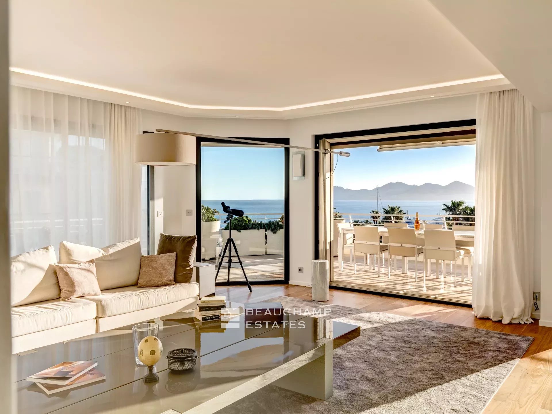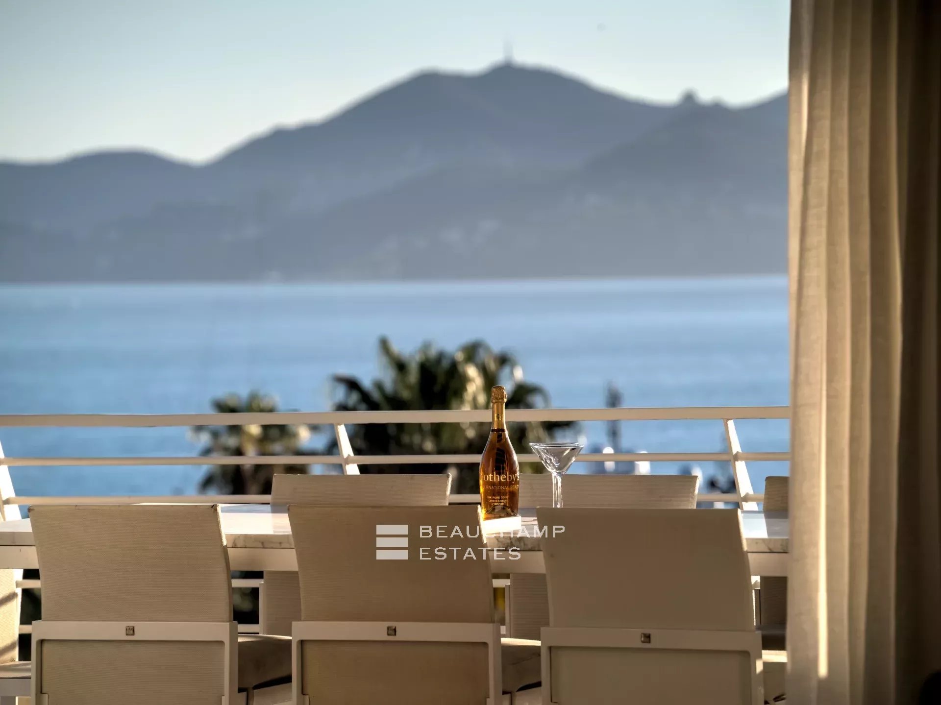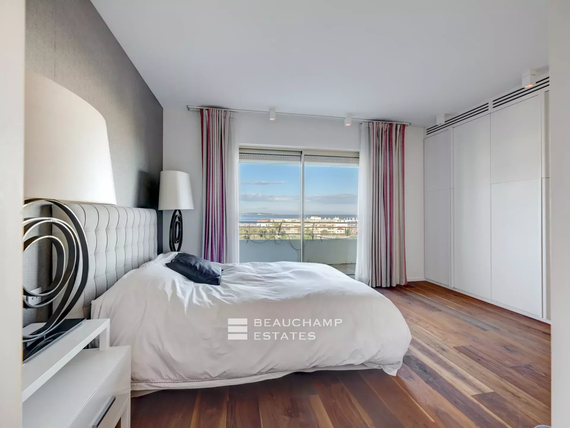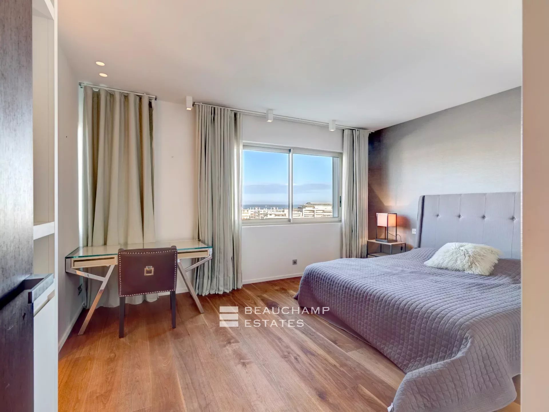 Facing Est, South and West as it is all the building side, the apartment enjoys sea view from Cap d’Antibes, to Esterel and Croisette Side, and natural light from morning till evening (12 windows all along the apartment). The interior designer treated every area of the apartment with highest quality fixtures to ensure aesthetics and comforts. The broad lounge and dining room is facing southwest and overlooks the bay of Cannes and the coast towards St Tropez. A large terrace surrounds the apartment with 360° views from the Croisette, over the Cap d'Antibes and Cannes. The master suite, with East and South exposure, boasts a large walk-in dressing room and a full Onyx bathroom. The three guest bedrooms are all en-suites and offer a comfortable size.