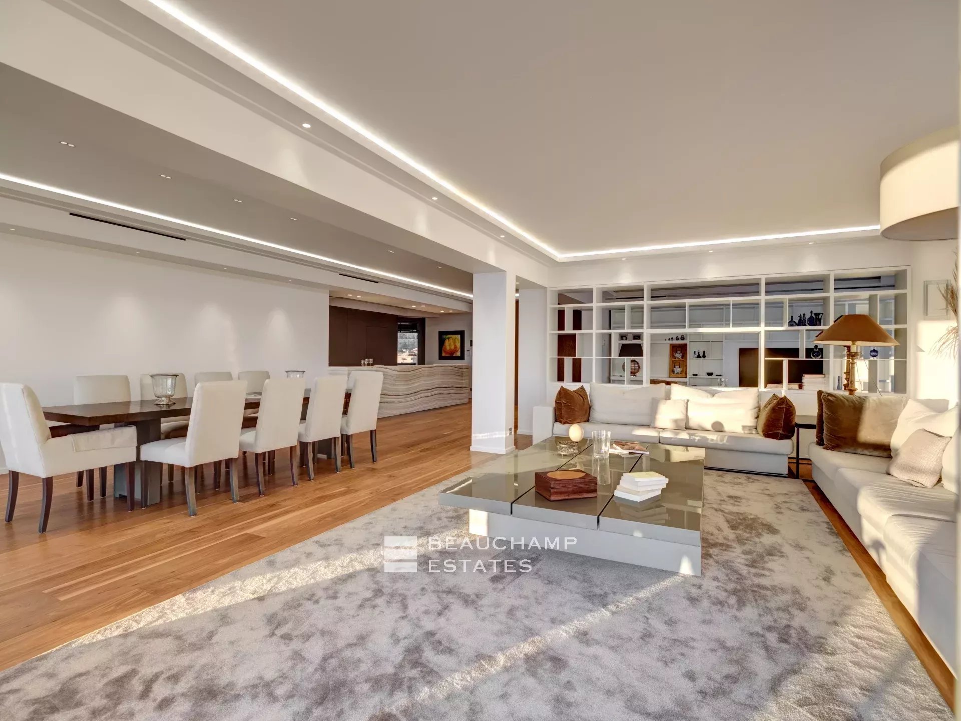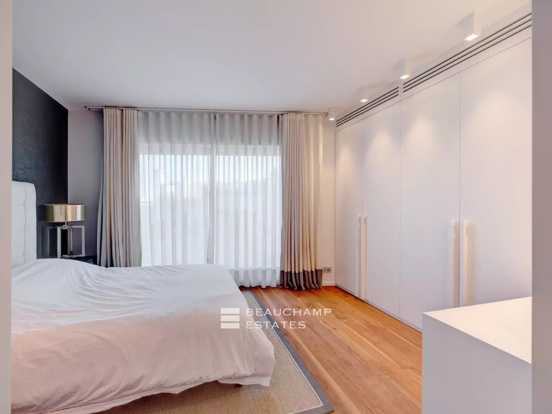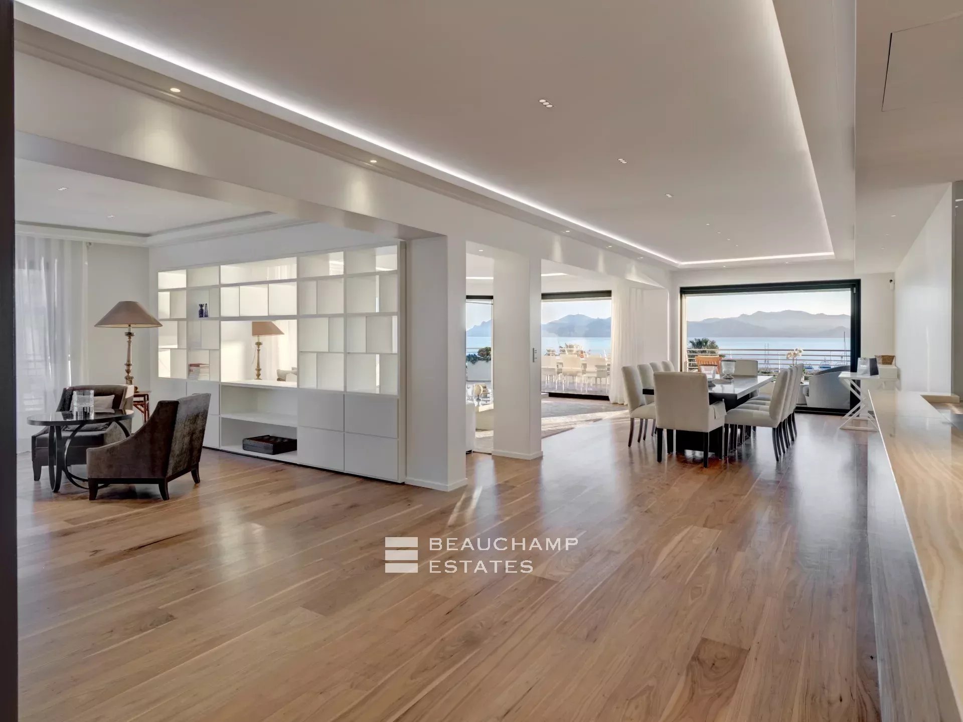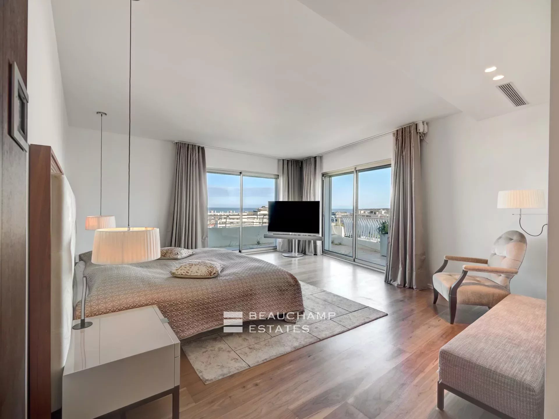 Facing Est, South and West as it is all the building side, the apartment enjoys sea view from Cap d’Antibes, to Esterel and Croisette Side, and natural light from morning till evening (12 windows all along the apartment). The interior designer treated every area of the apartment with highest quality fixtures to ensure aesthetics and comforts. The broad lounge and dining room is facing southwest and overlooks the bay of Cannes and the coast towards St Tropez. A large terrace surrounds the apartment with 360° views from the Croisette, over the Cap d'Antibes and Cannes. The master suite, with East and South exposure, boasts a large walk-in dressing room and a full Onyx bathroom. The three guest bedrooms are all en-suites and offer a comfortable size.