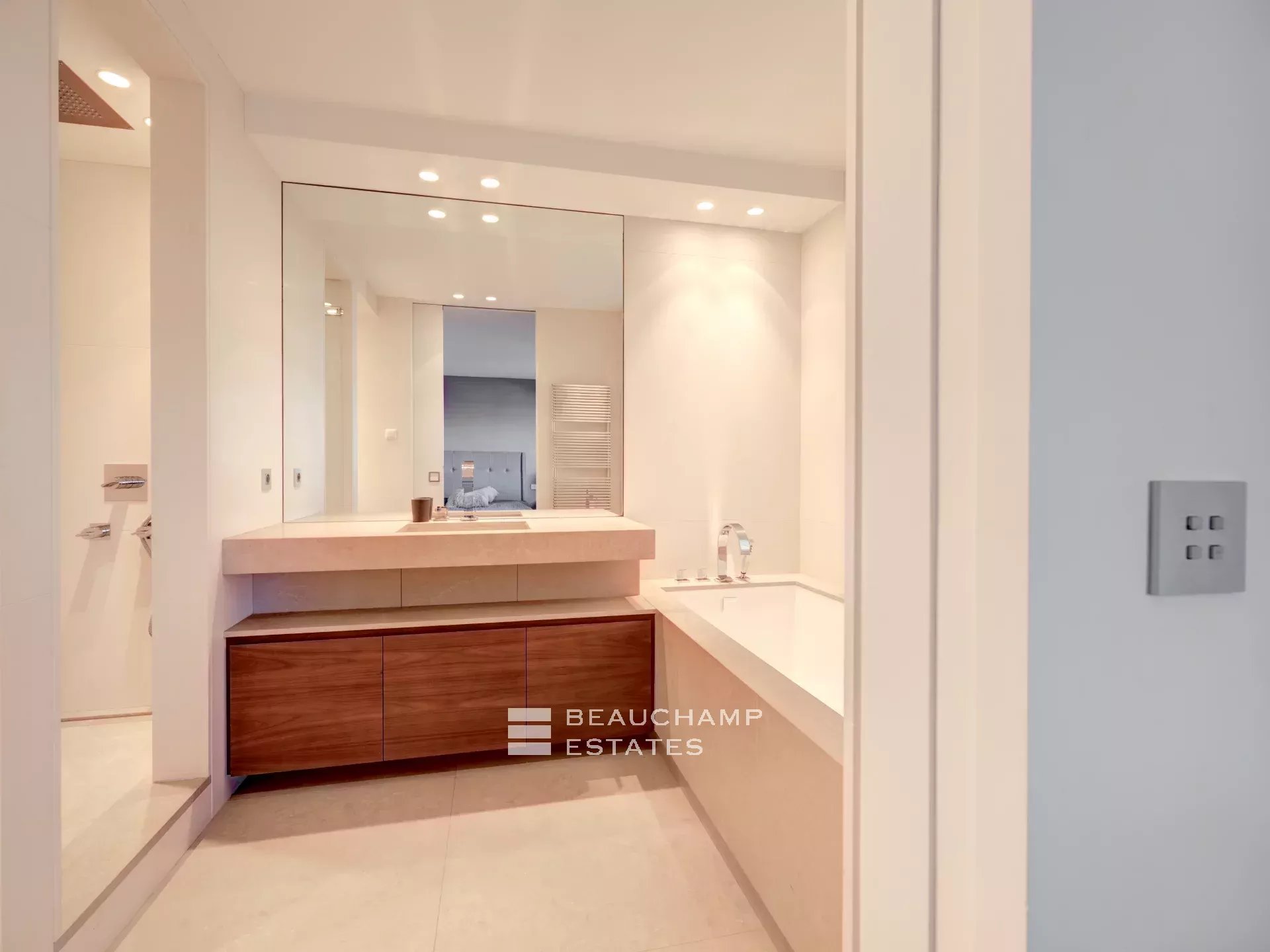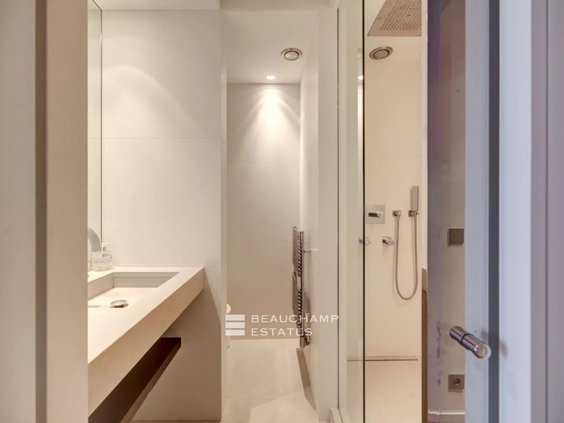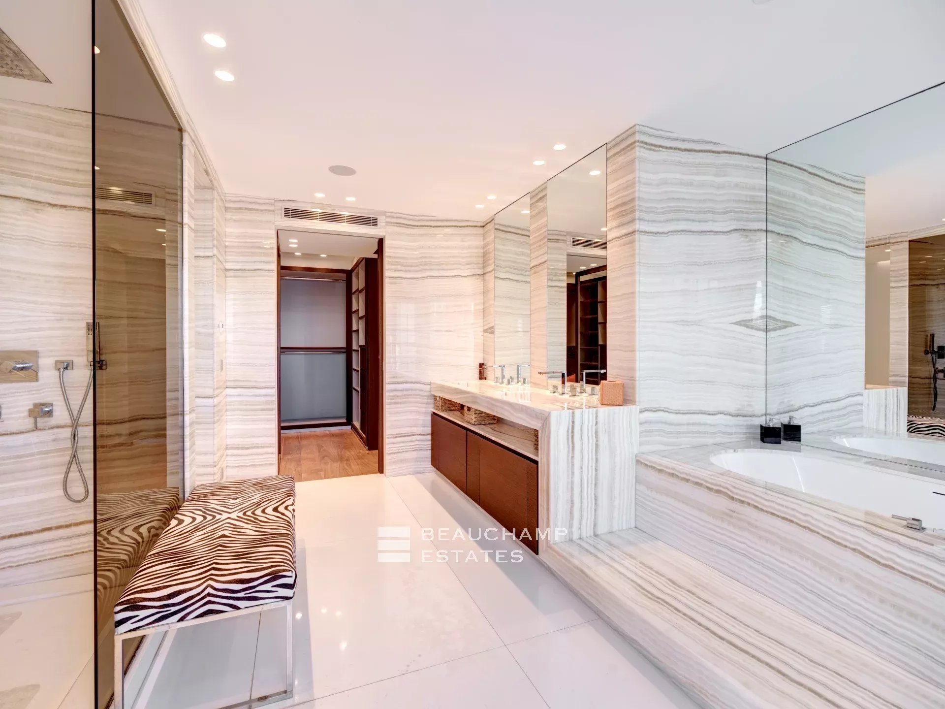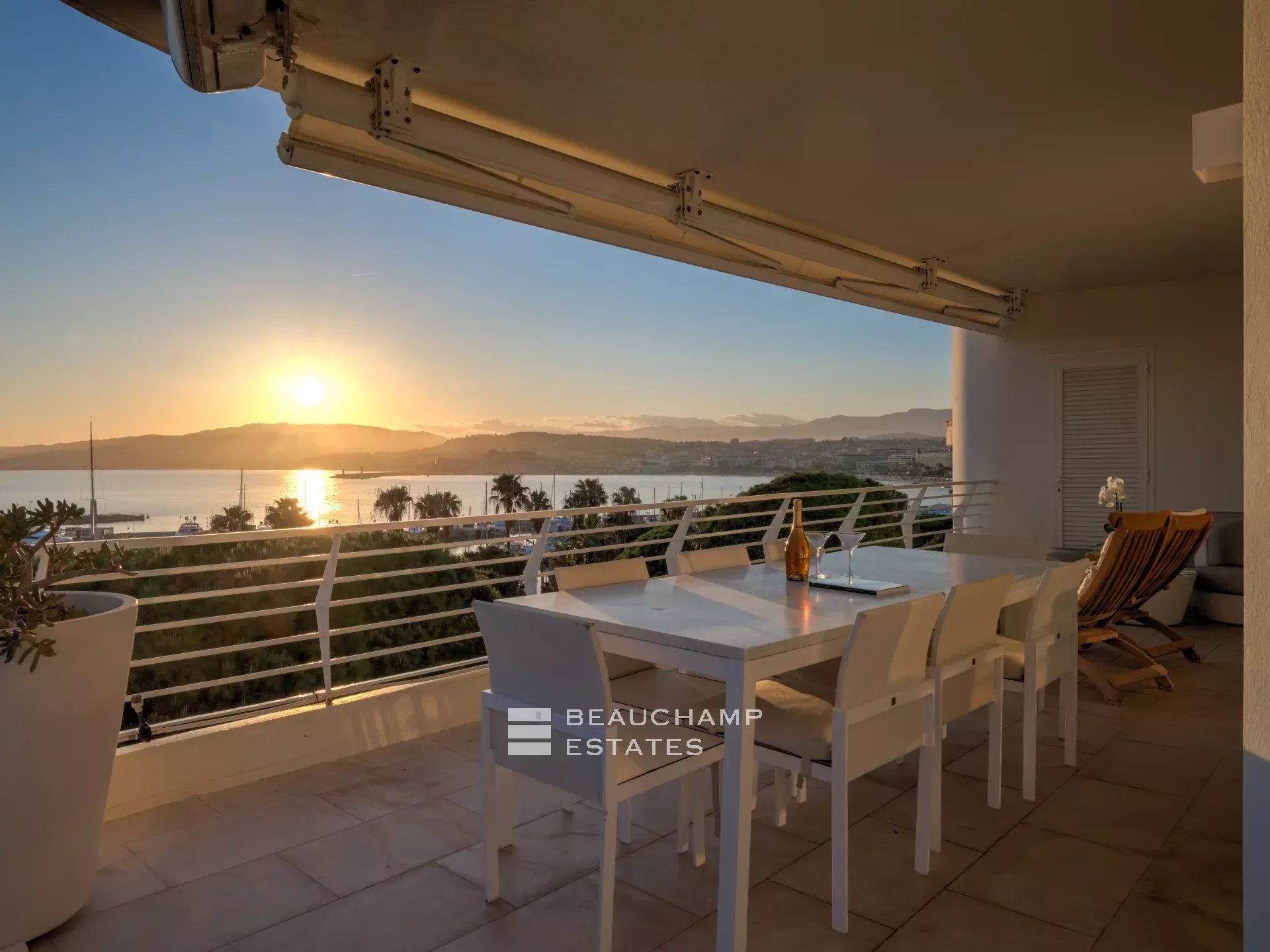 Facing Est, South and West as it is all the building side, the apartment enjoys sea view from Cap d’Antibes, to Esterel and Croisette Side, and natural light from morning till evening (12 windows all along the apartment). The interior designer treated every area of the apartment with highest quality fixtures to ensure aesthetics and comforts. The broad lounge and dining room is facing southwest and overlooks the bay of Cannes and the coast towards St Tropez. A large terrace surrounds the apartment with 360° views from the Croisette, over the Cap d'Antibes and Cannes. The master suite, with East and South exposure, boasts a large walk-in dressing room and a full Onyx bathroom. The three guest bedrooms are all en-suites and offer a comfortable size.