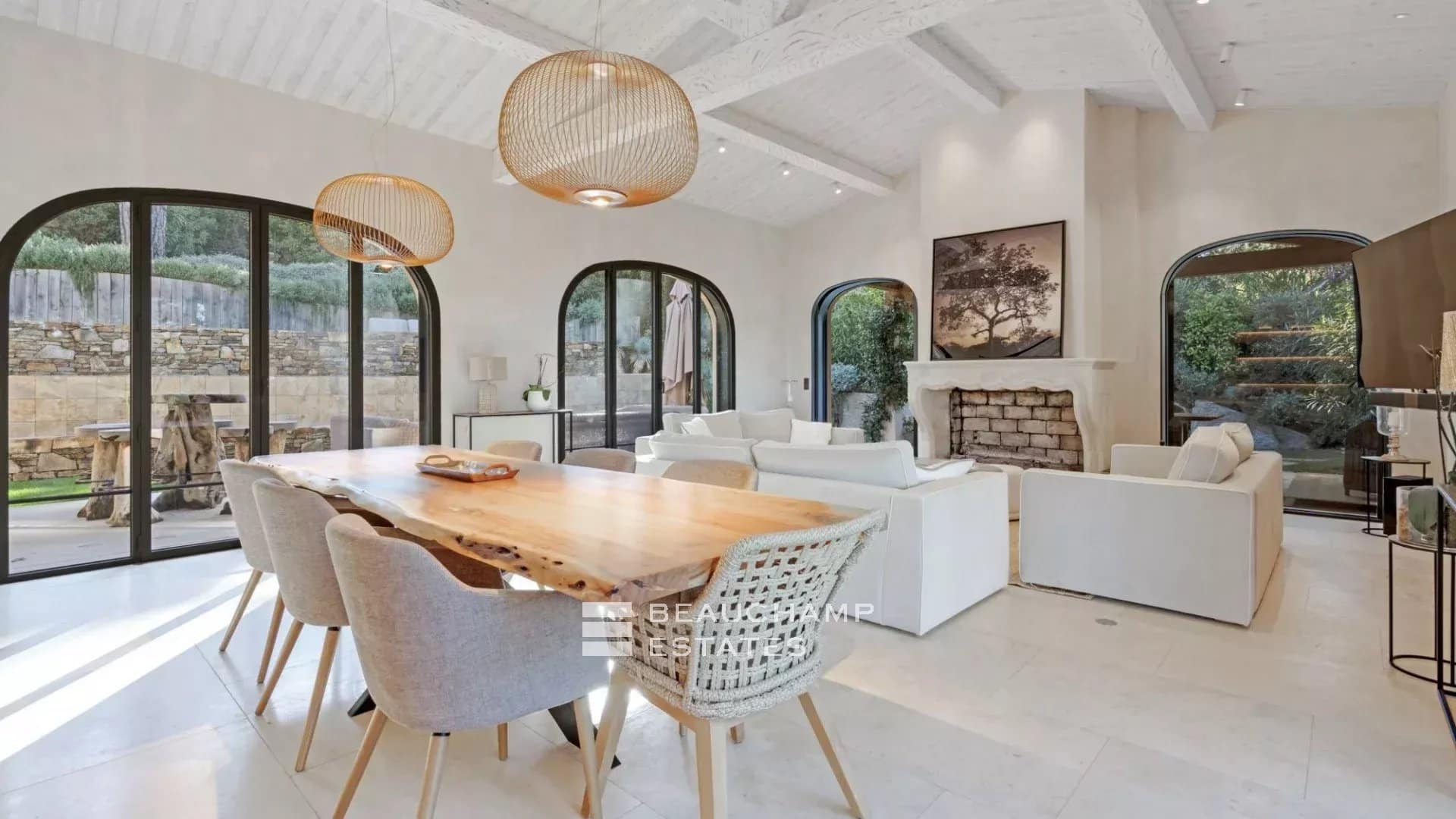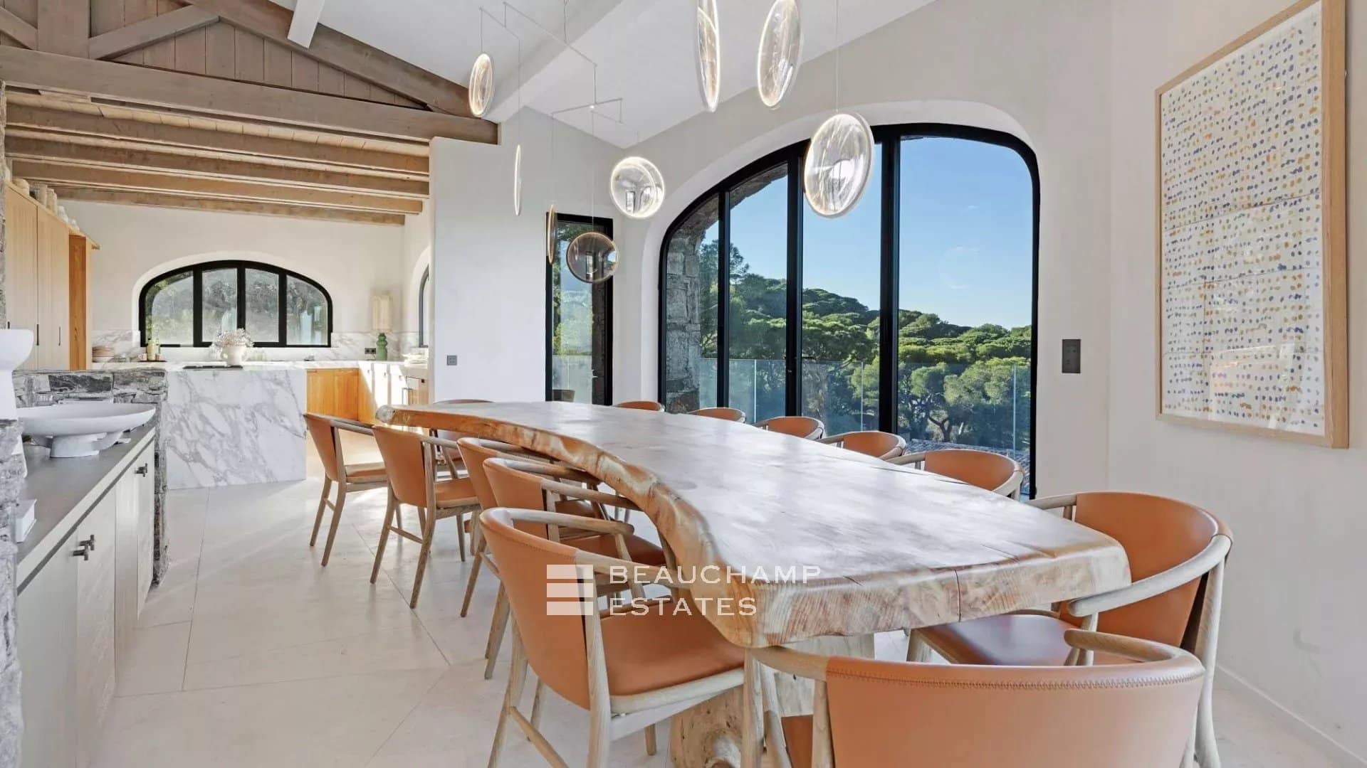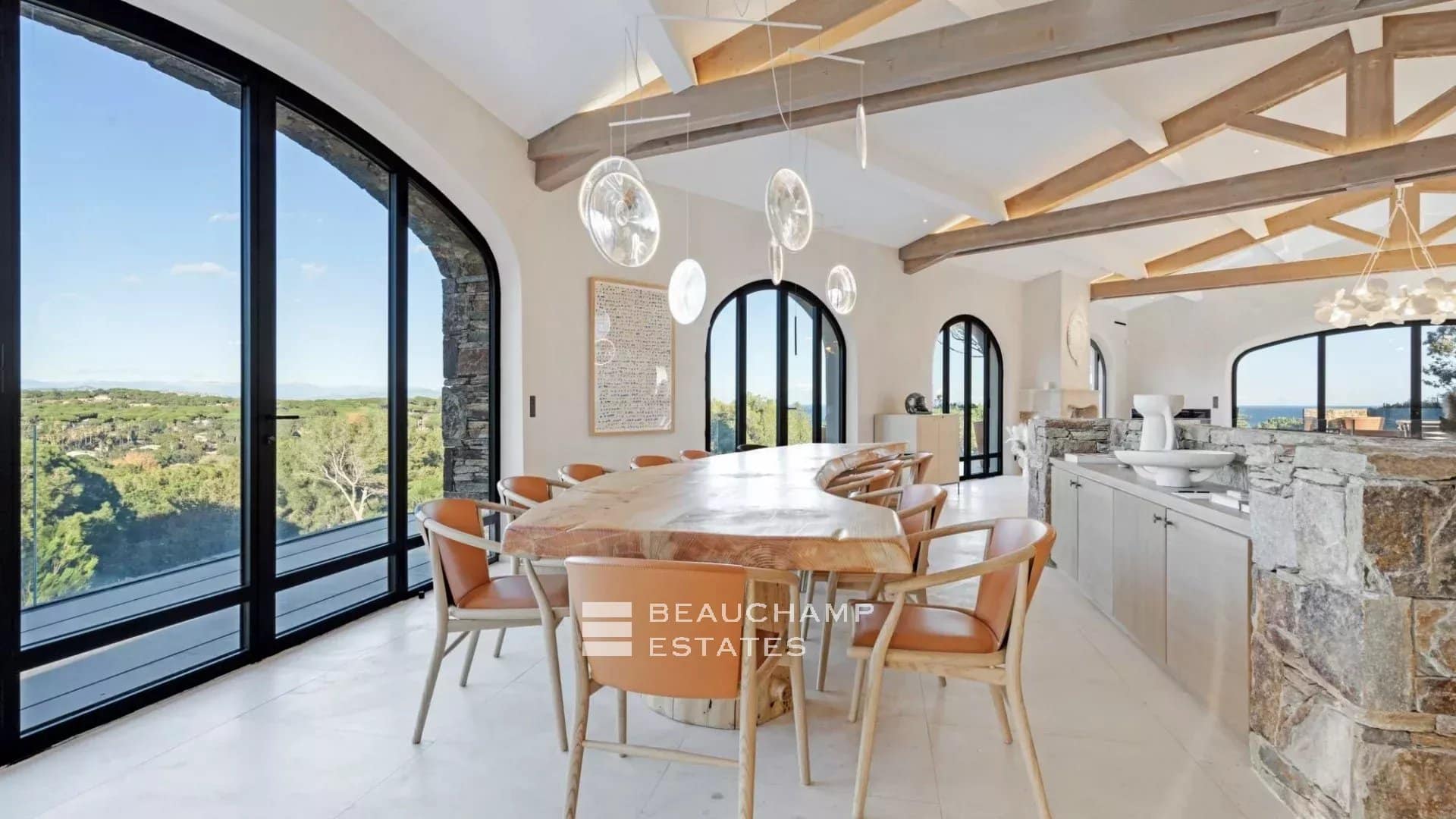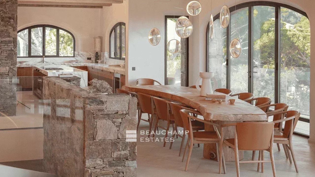 Adjacent to the kitchen, the dining area showcases a spectacular custom-made table carved from a single piece of polished natural wood. The lounge offers generous seating, armchairs and a large fireplace, all opening onto an expansive terrace with outdoor furniture and a large wooden dining table overlooking the sea.