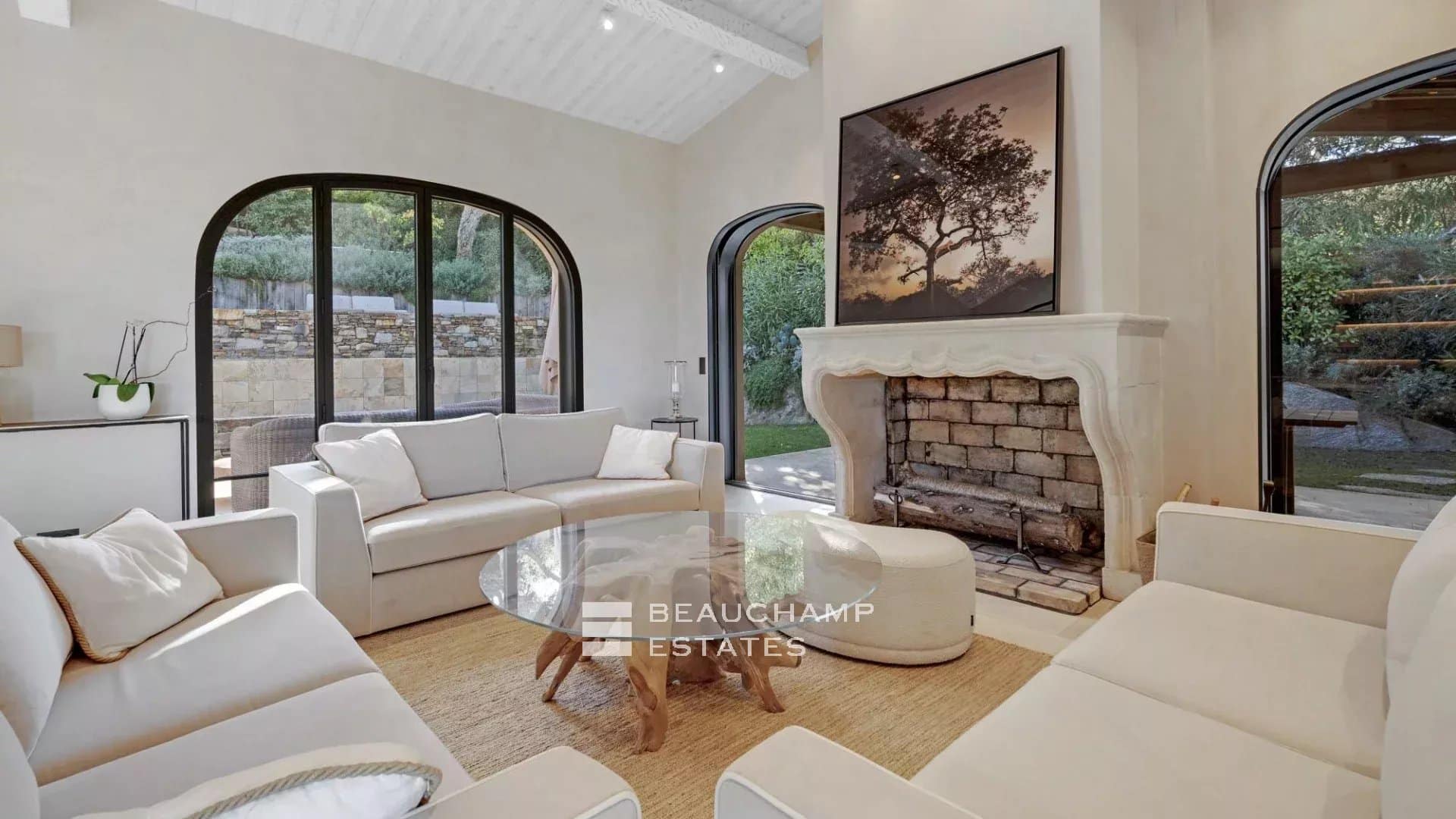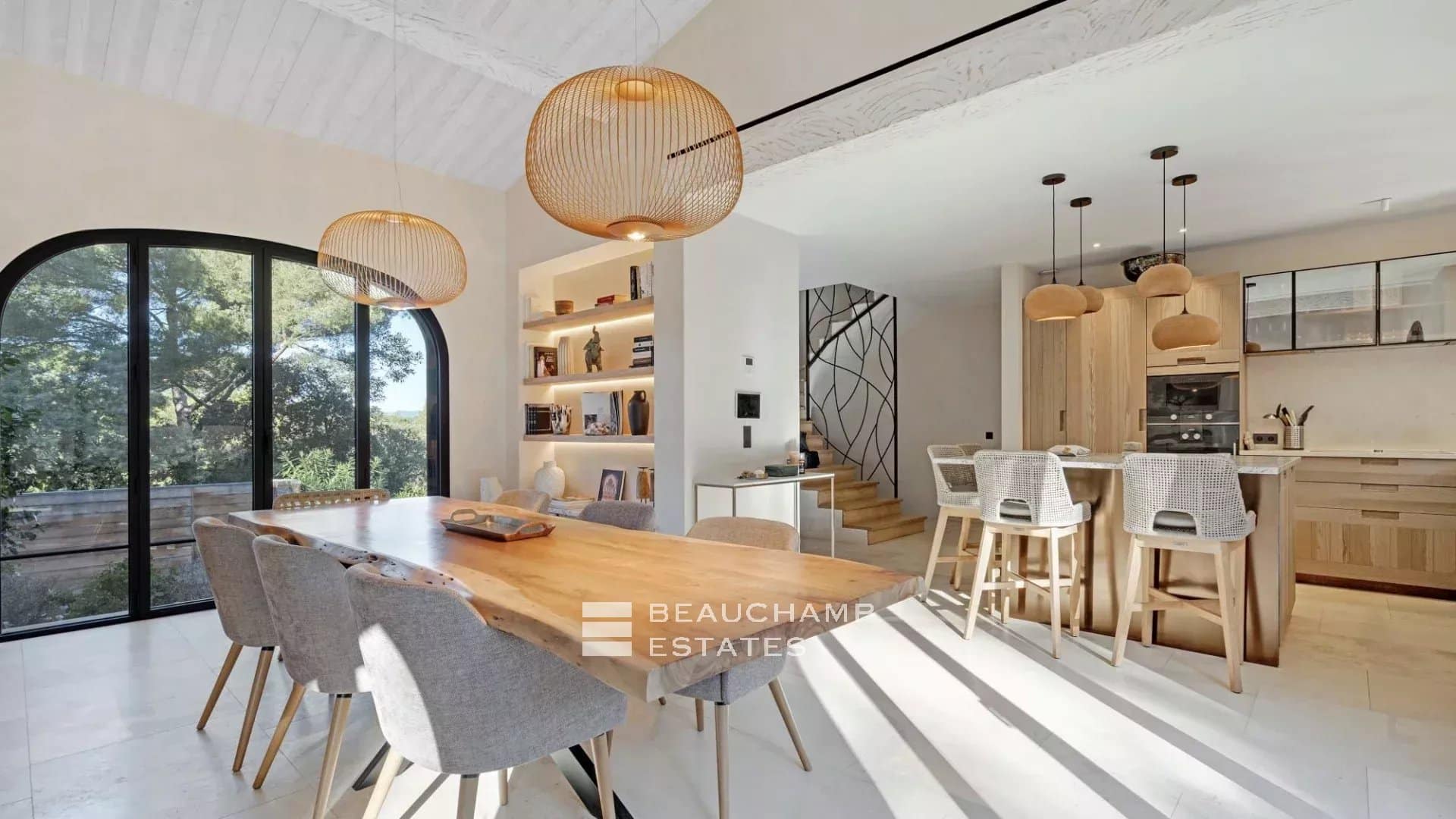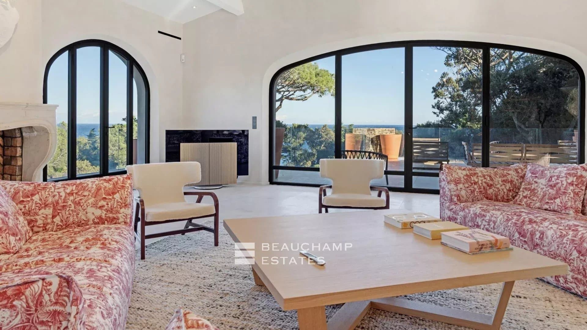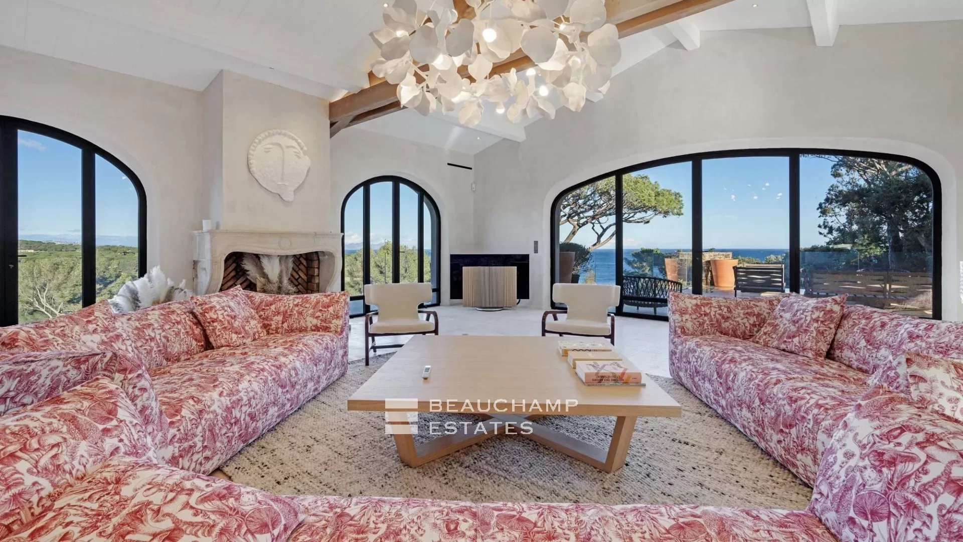 Adjacent to the kitchen, the dining area showcases a spectacular custom-made table carved from a single piece of polished natural wood. The lounge offers generous seating, armchairs and a large fireplace, all opening onto an expansive terrace with outdoor furniture and a large wooden dining table overlooking the sea.