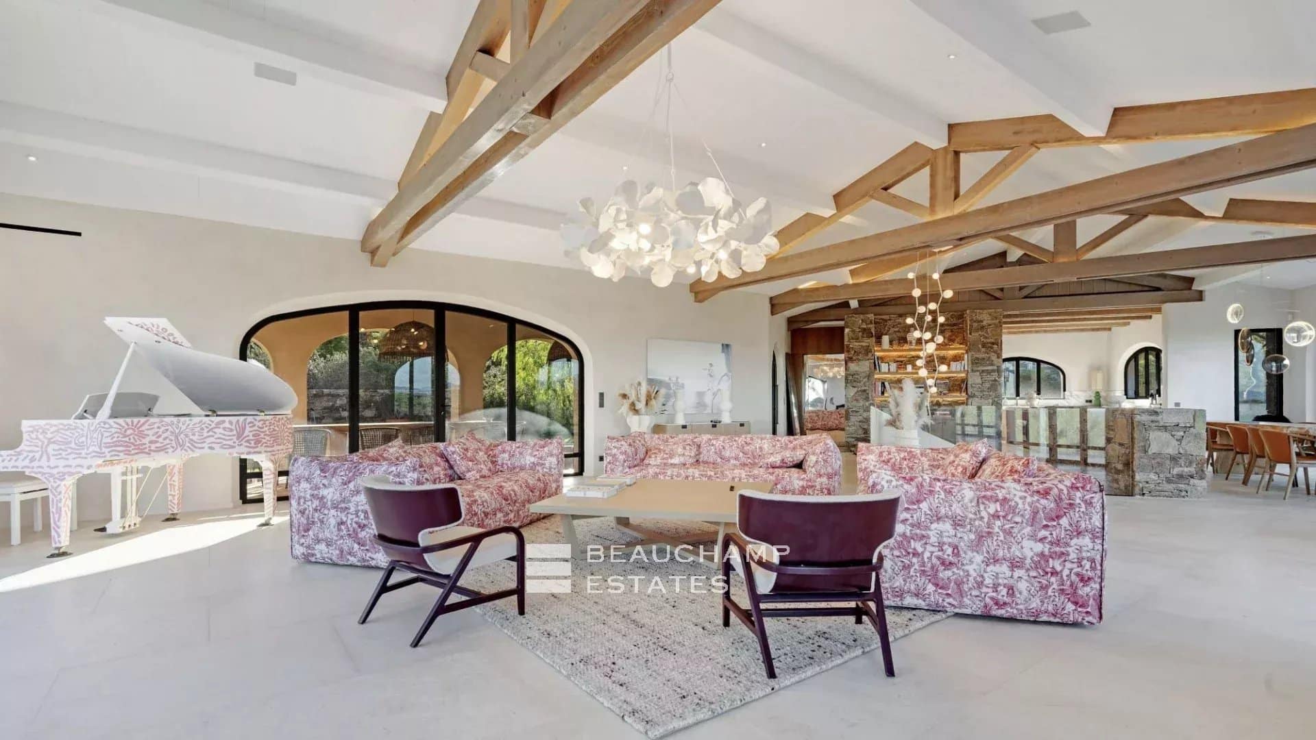 From the moment you enter, the villa impresses with its vast open-plan living areas bathed in natural light. Floor-to-ceiling windows frame the spectacular scenery, creating a seamless connection between indoor and outdoor living. The interior décor is elegant and contemporary, enhanced by carefully selected statement pieces such as Stella McCartney sofas and a striking white baby grand piano.
