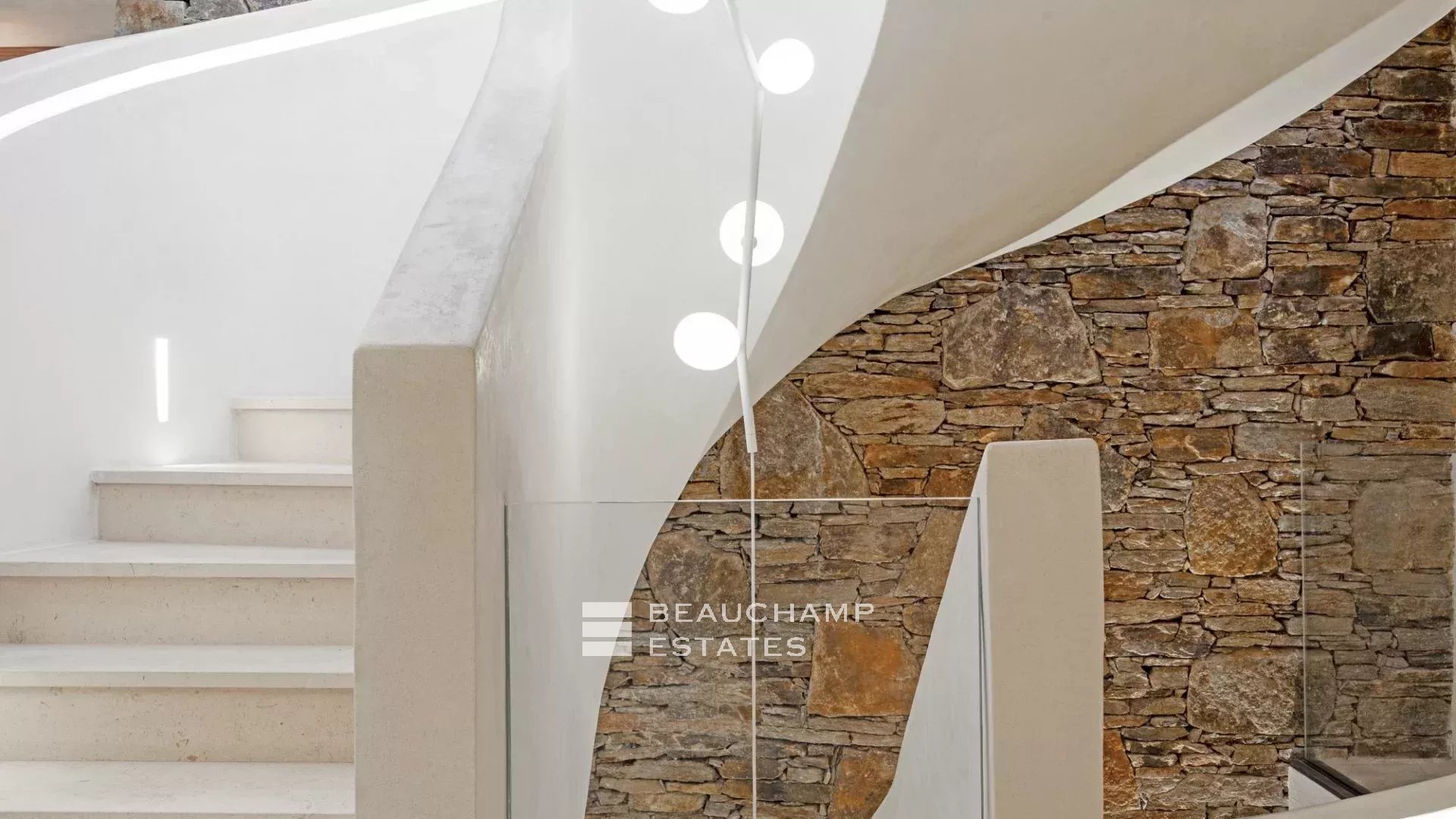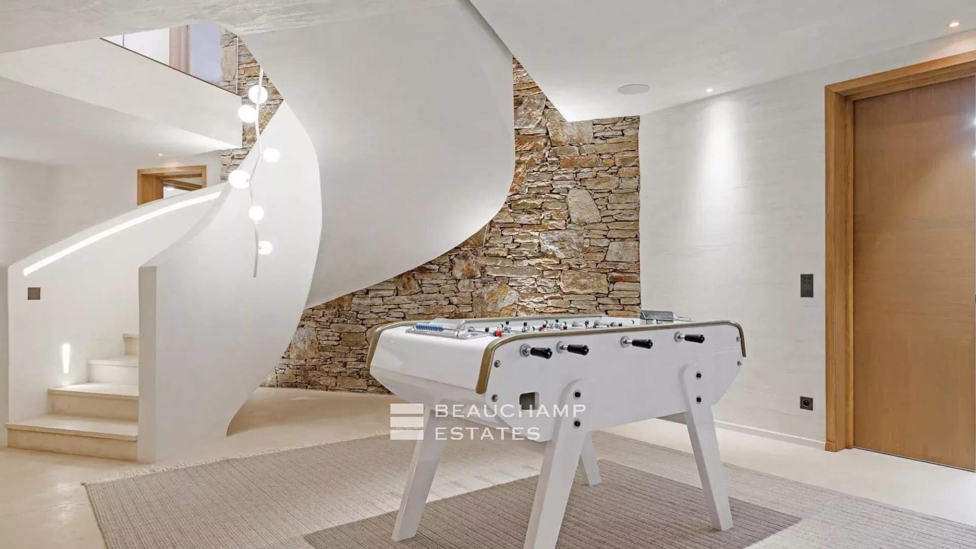 Natural materials, wood, stone and wool are used throughout to create a warm and organic atmosphere. Every detail reflects the owner’s impeccable eye for design, evident across the entire estate.