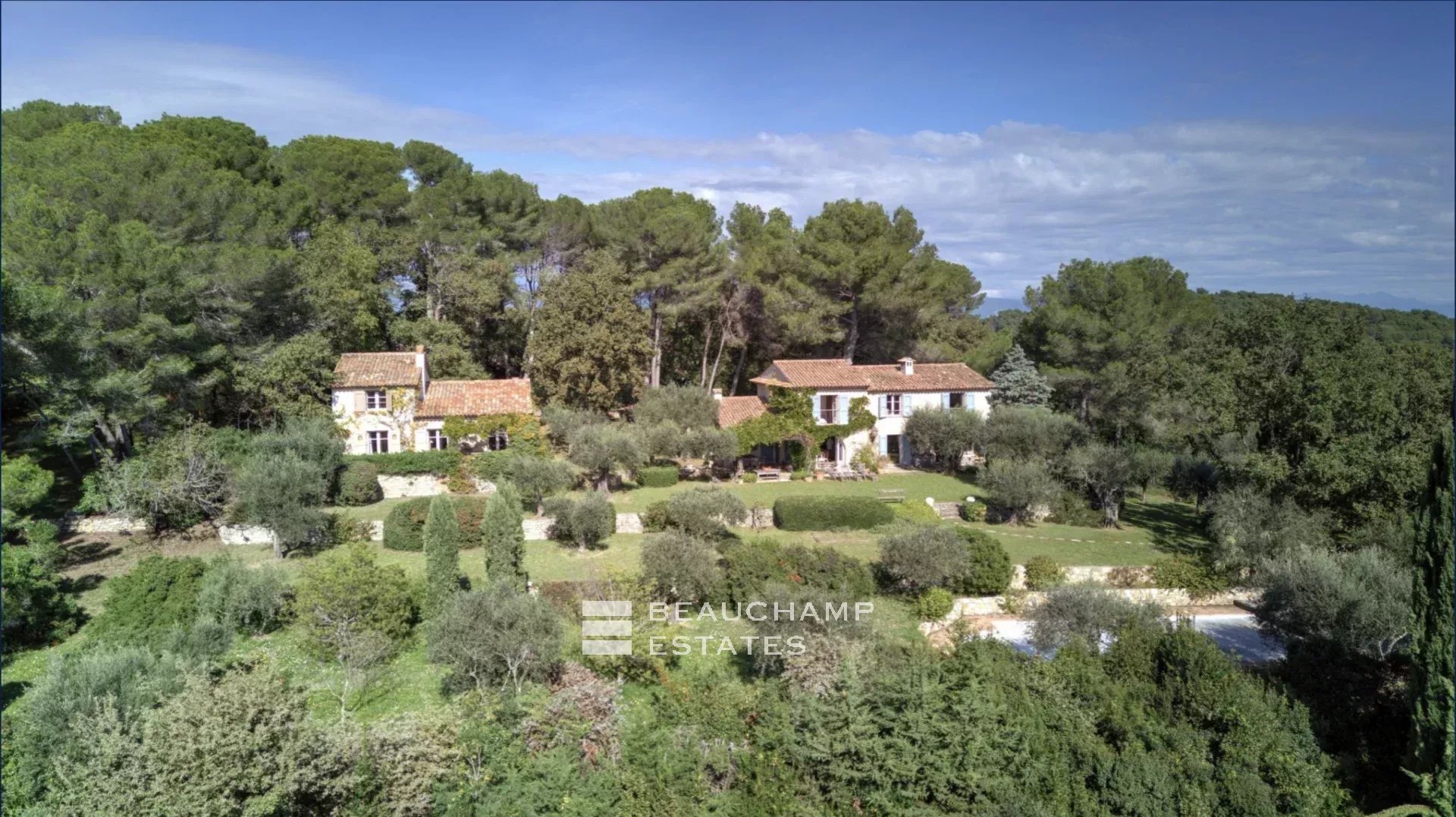 Comprising three stone-built structures, the estate offers breathtaking views of the old village of Mougins and the sea.