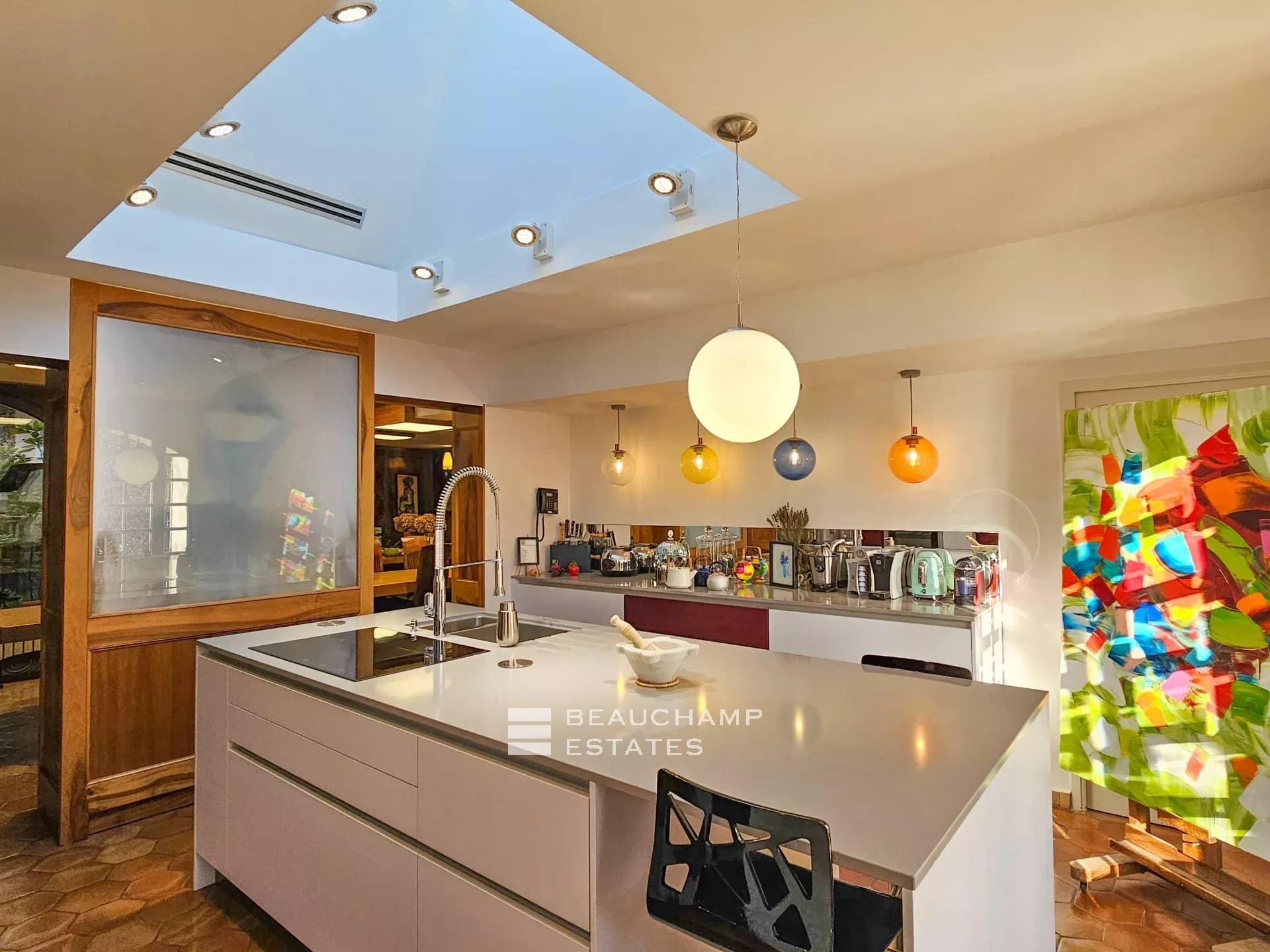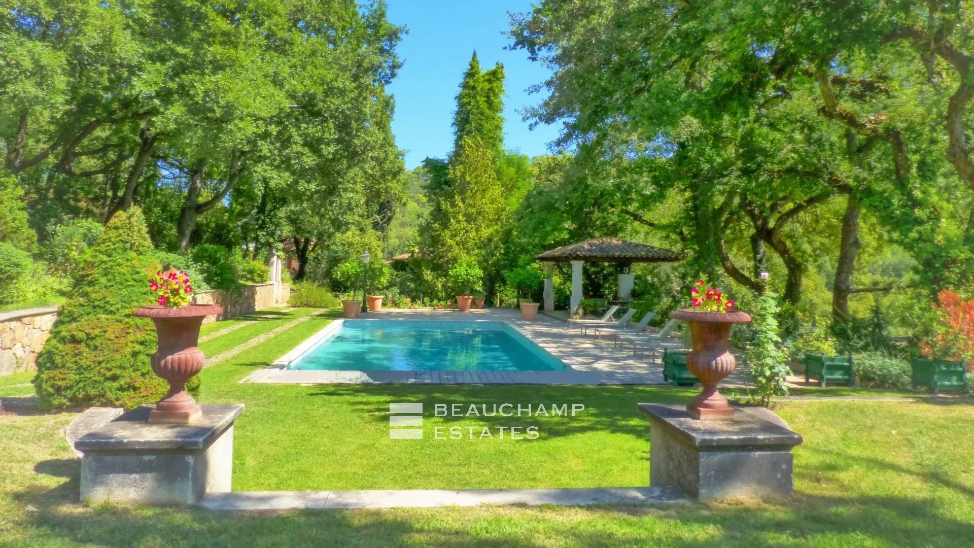 To the north, the outbuildings include agricultural and wine-making facilities, technical rooms, and a caretaker’s accommodation. To the south, beautifully landscaped terraced gardens unfold around a flower garden with water features, swimming pool, large sun terrace, pool house, dovecote, and orangery.